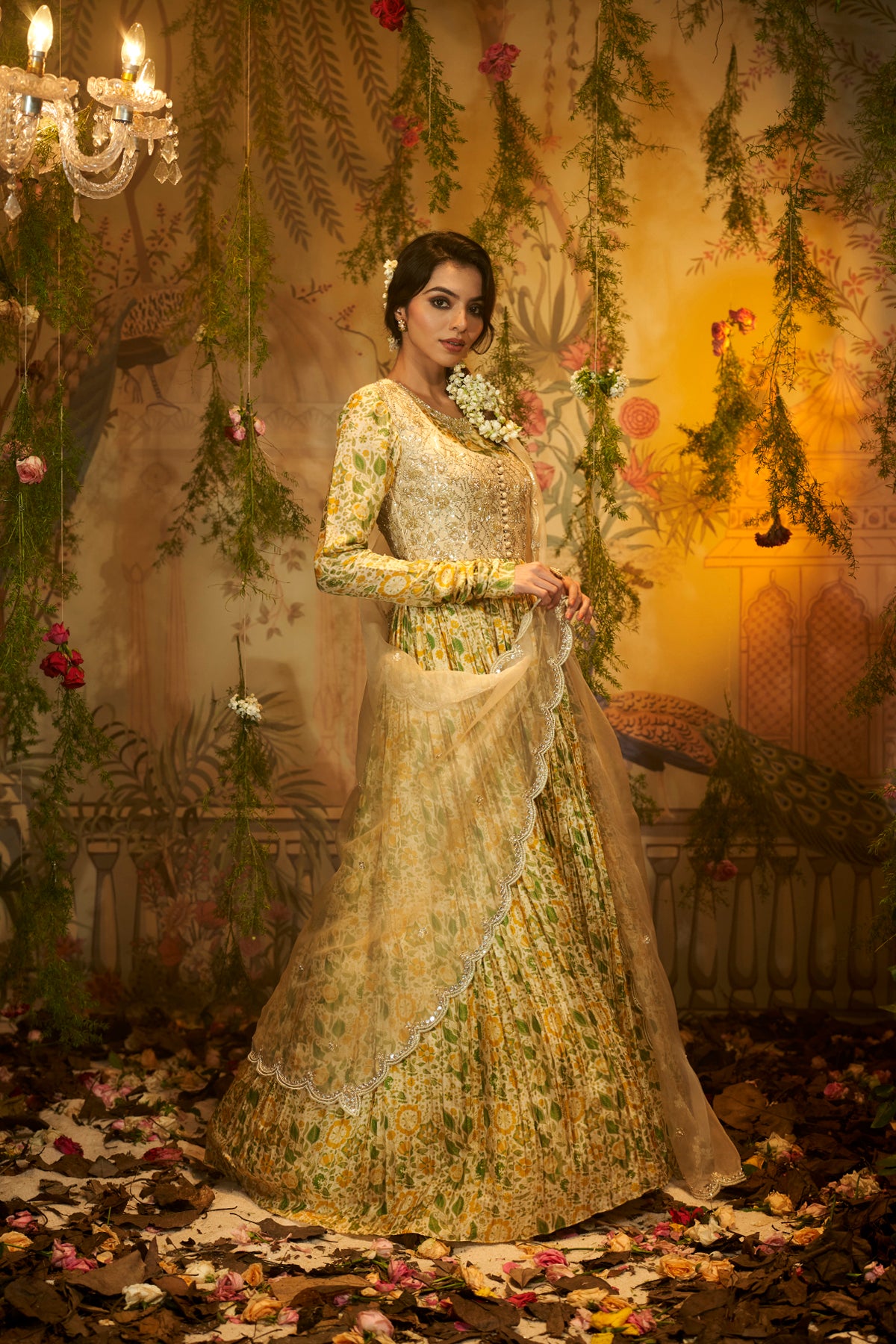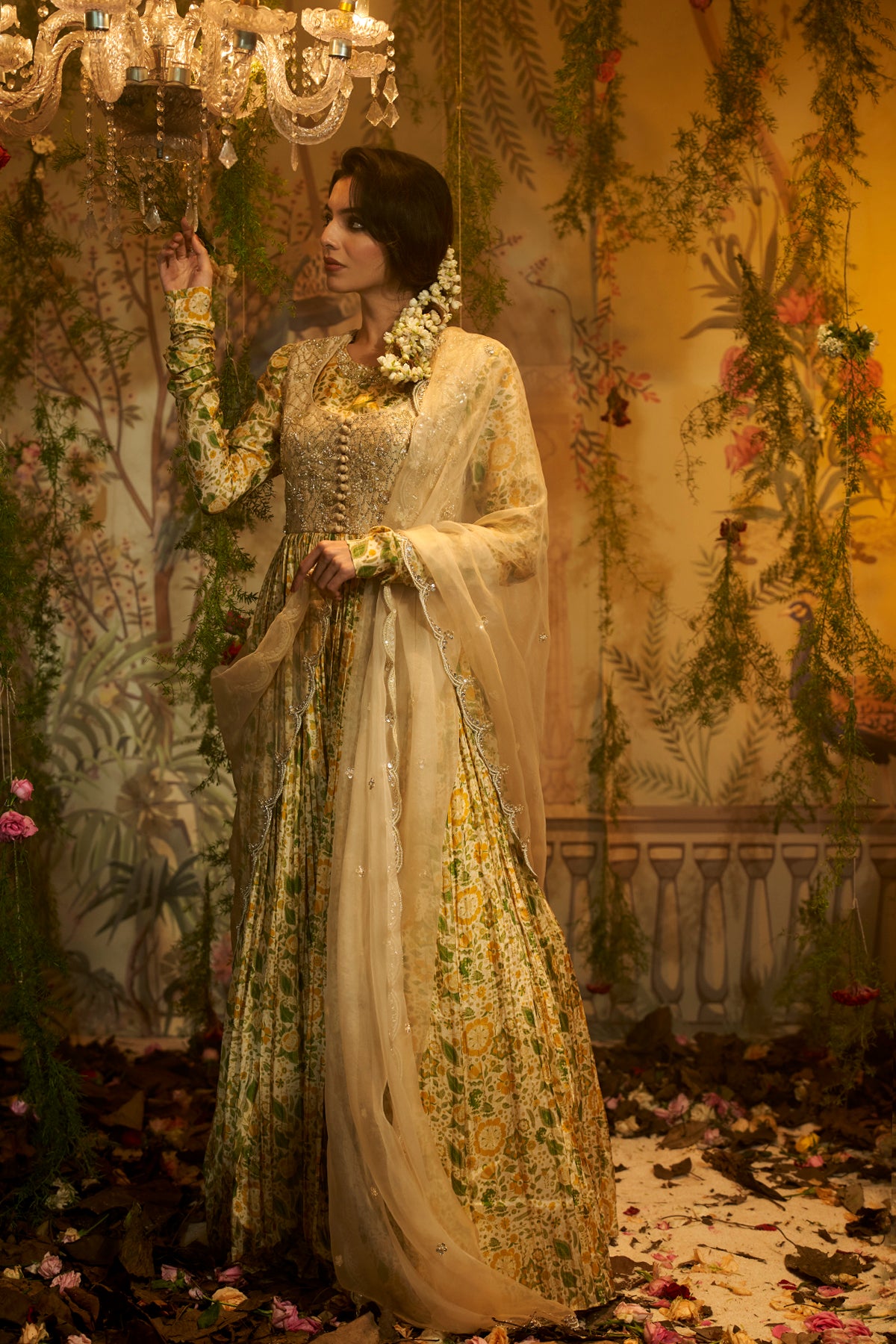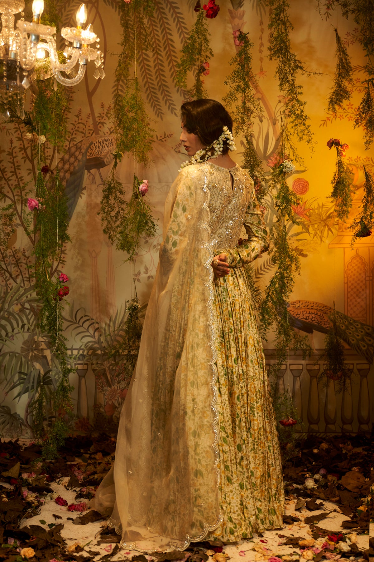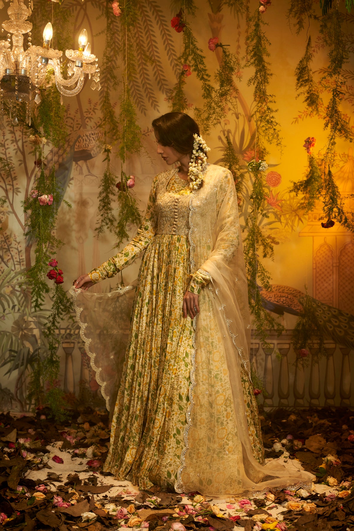 Featuring an ivory gold anarkali. It is paired with an organza dupatta