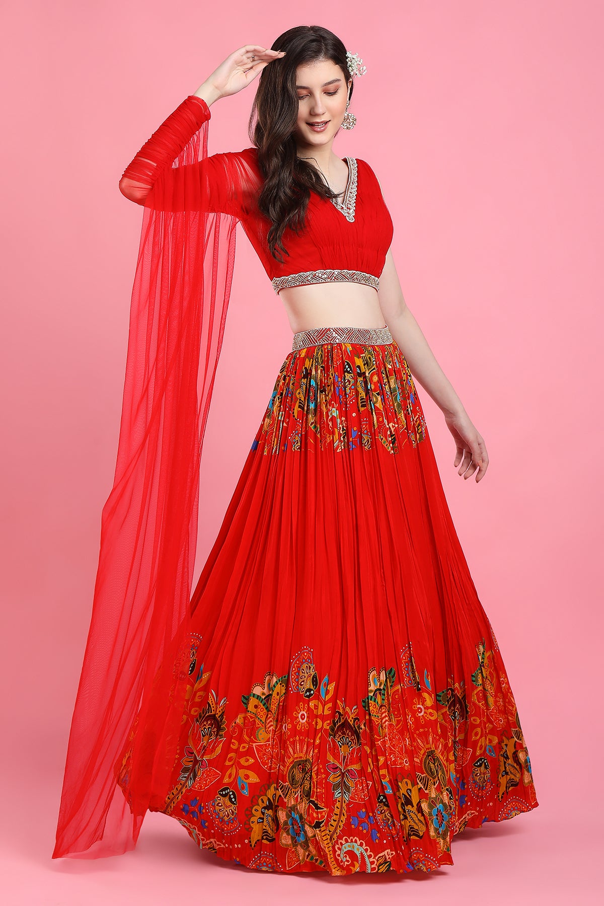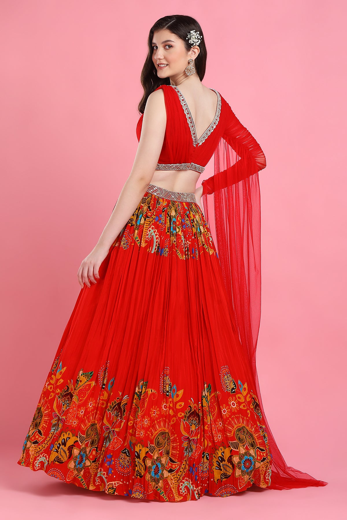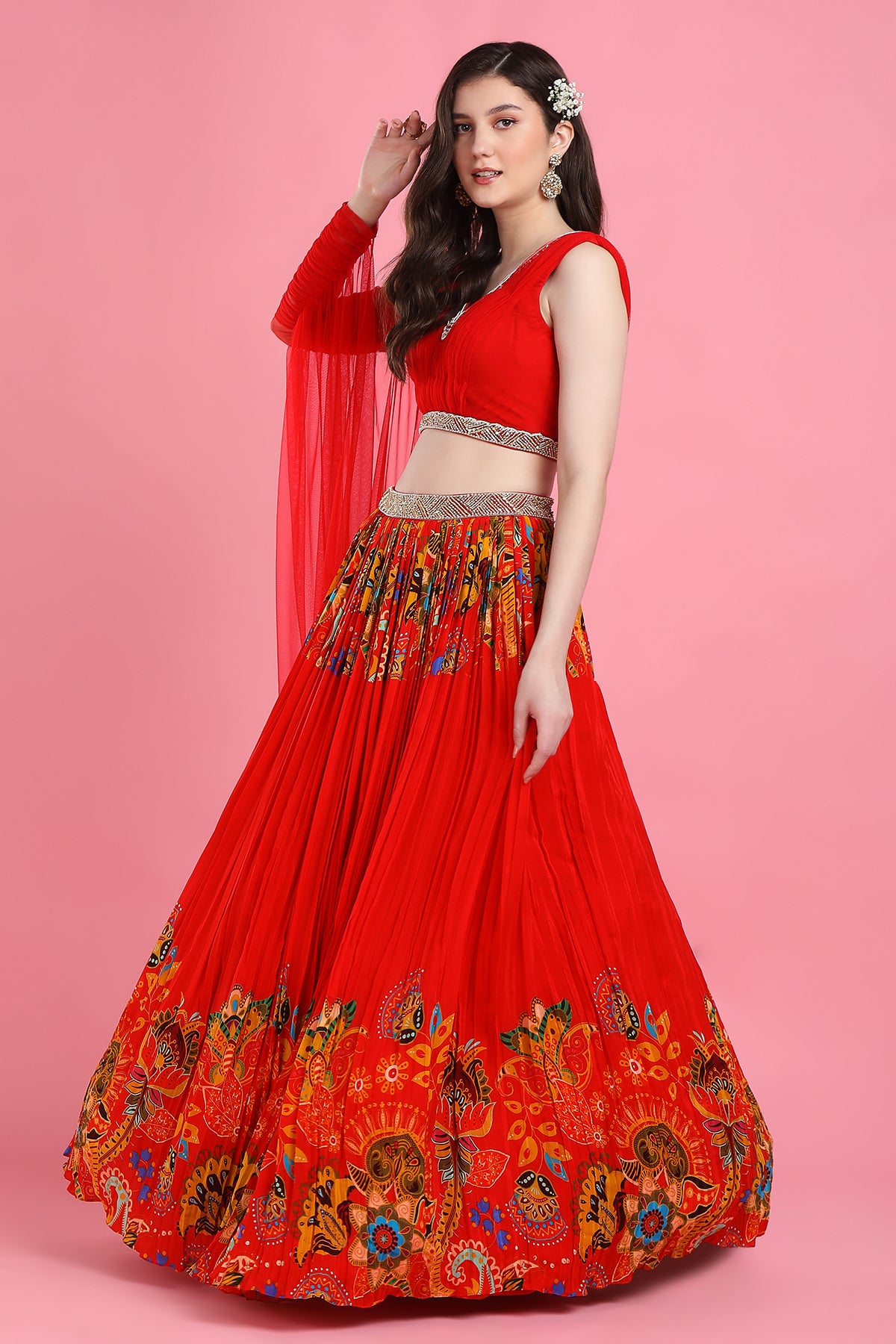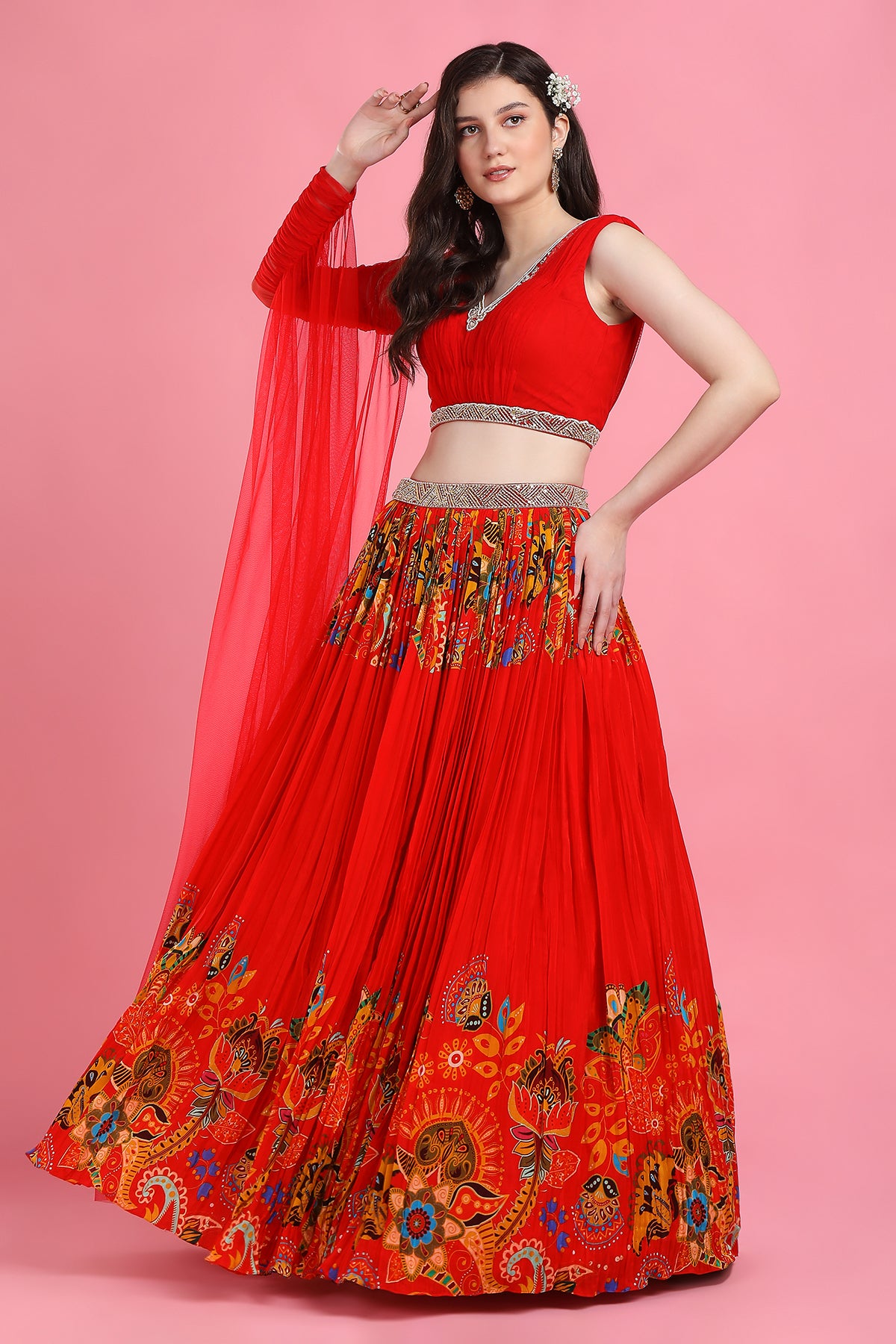 Featuring a red crepe silk lehenga. It is paired with a blouse.