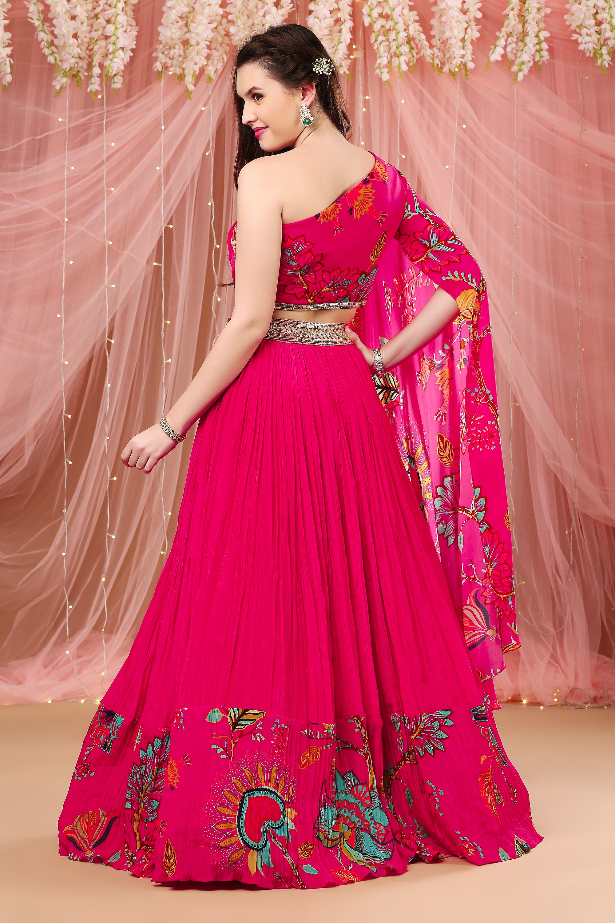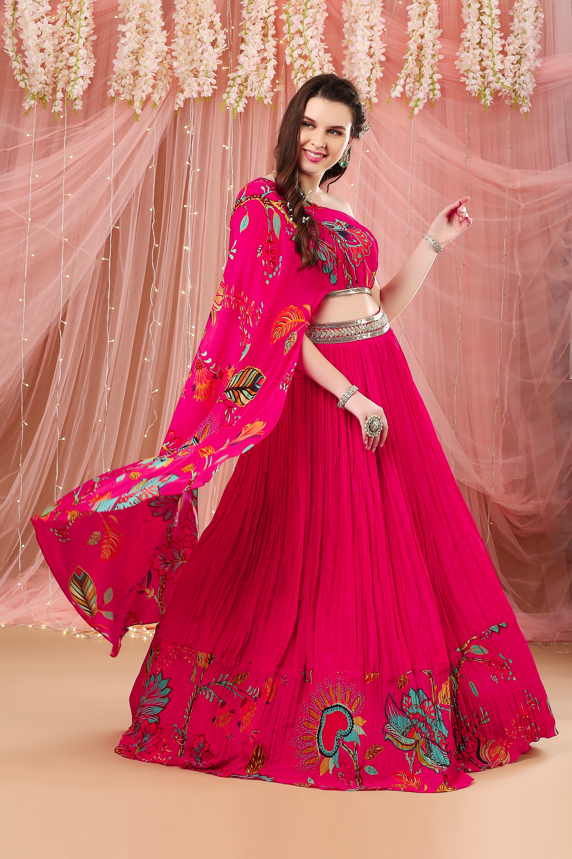 Featuring a crepe silk lehenga. It is paired with a one shoulder embroidered blouse.