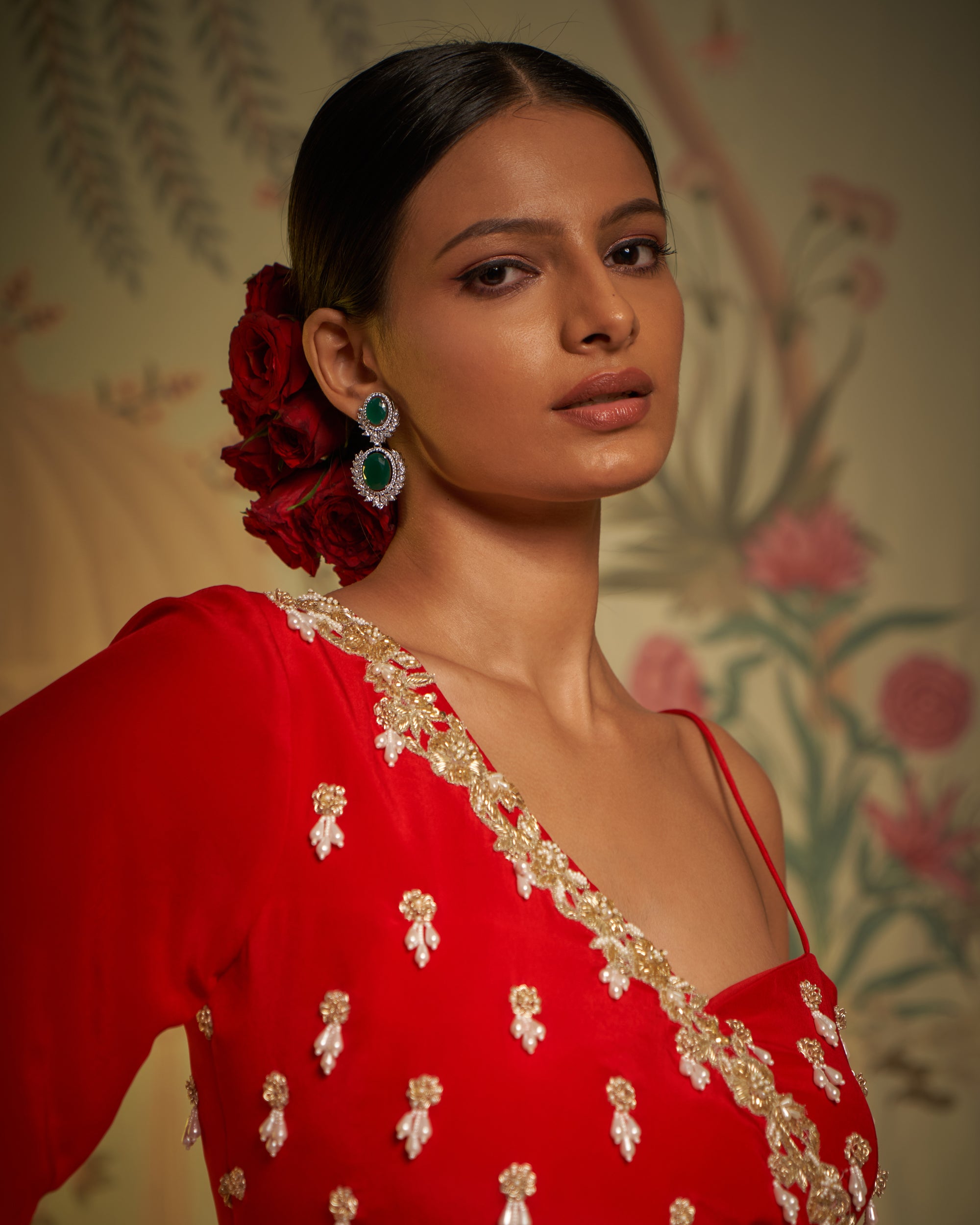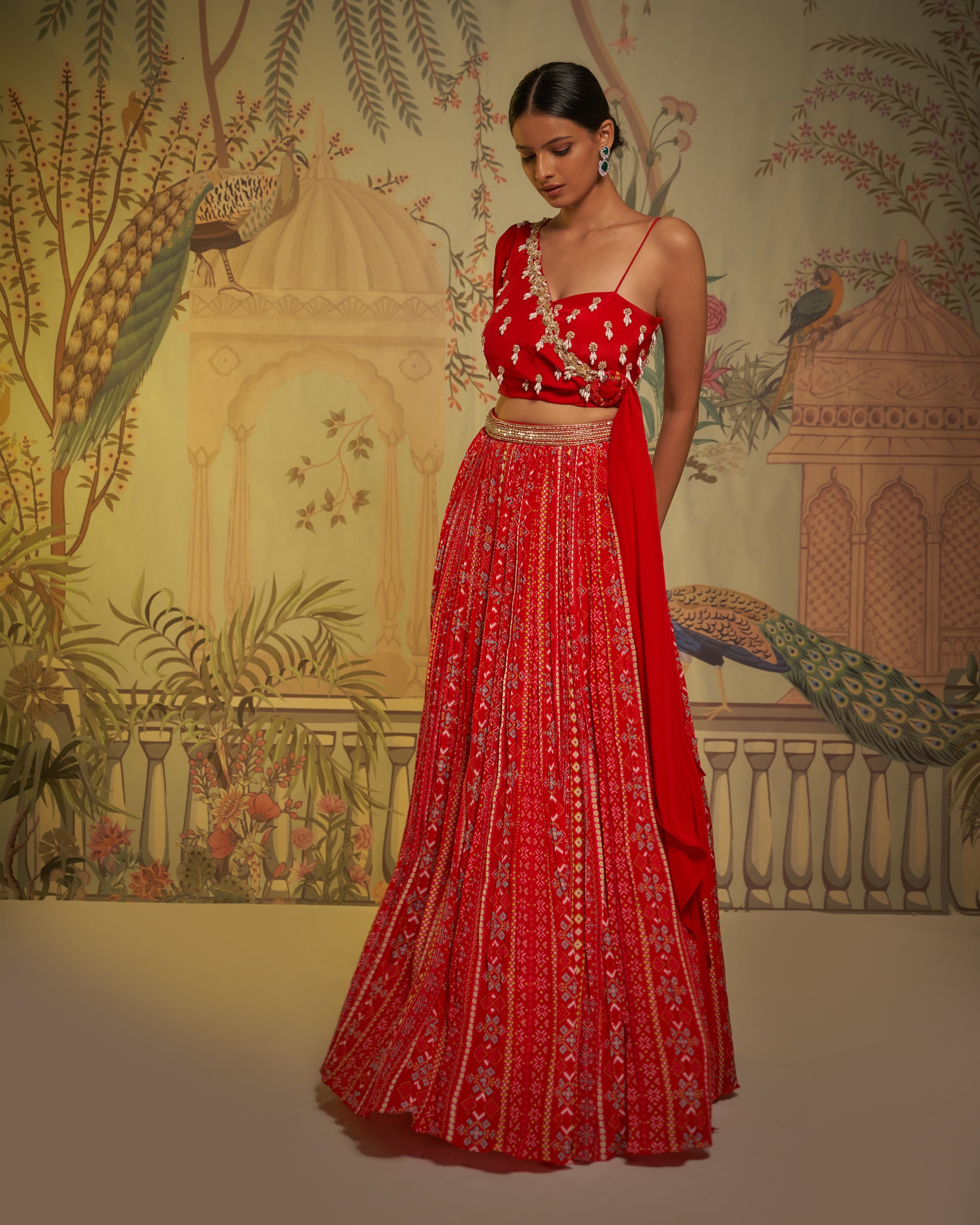 Featuring a crepe silk lehenga. It is paired with a one shoulder embroidered blouse.
