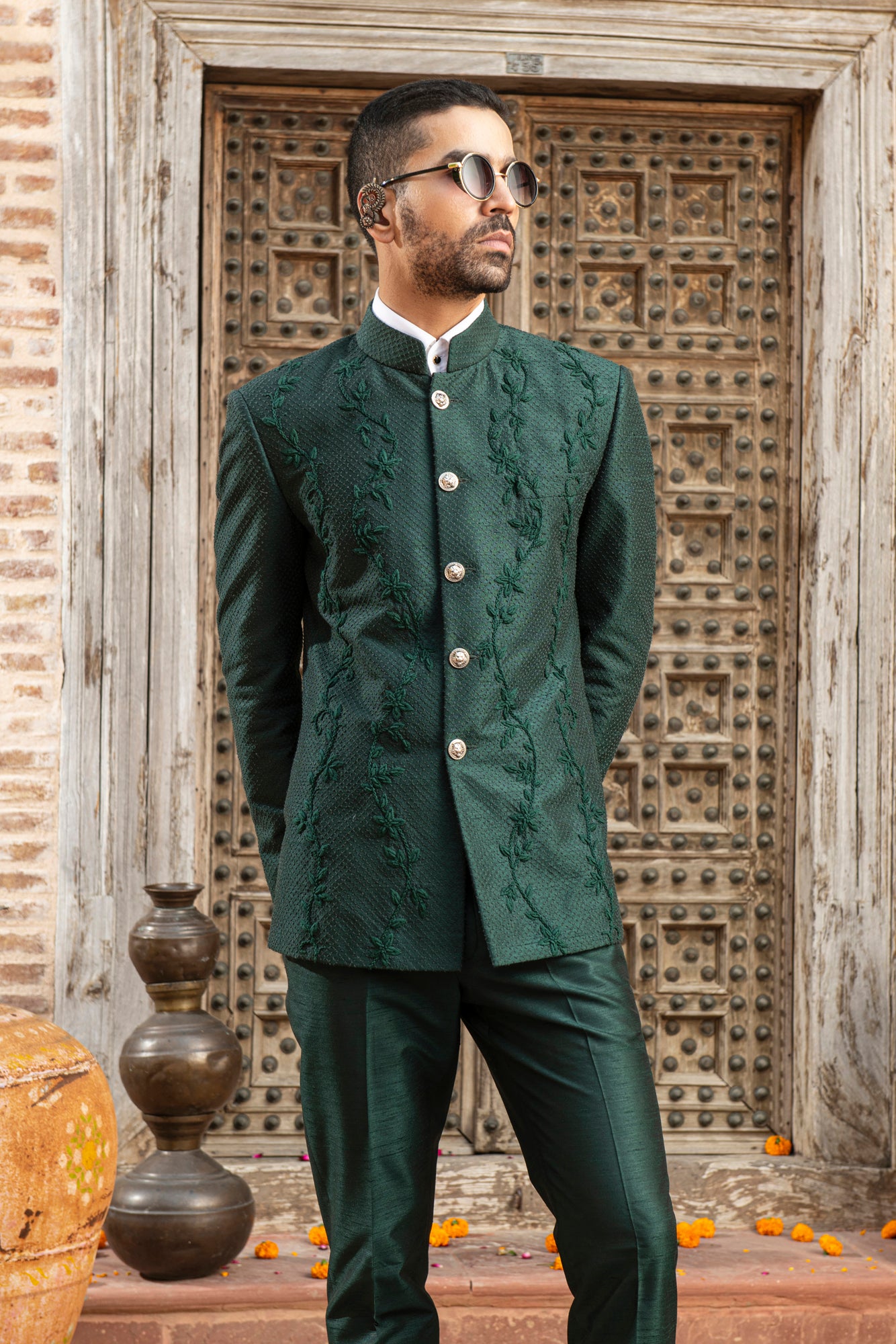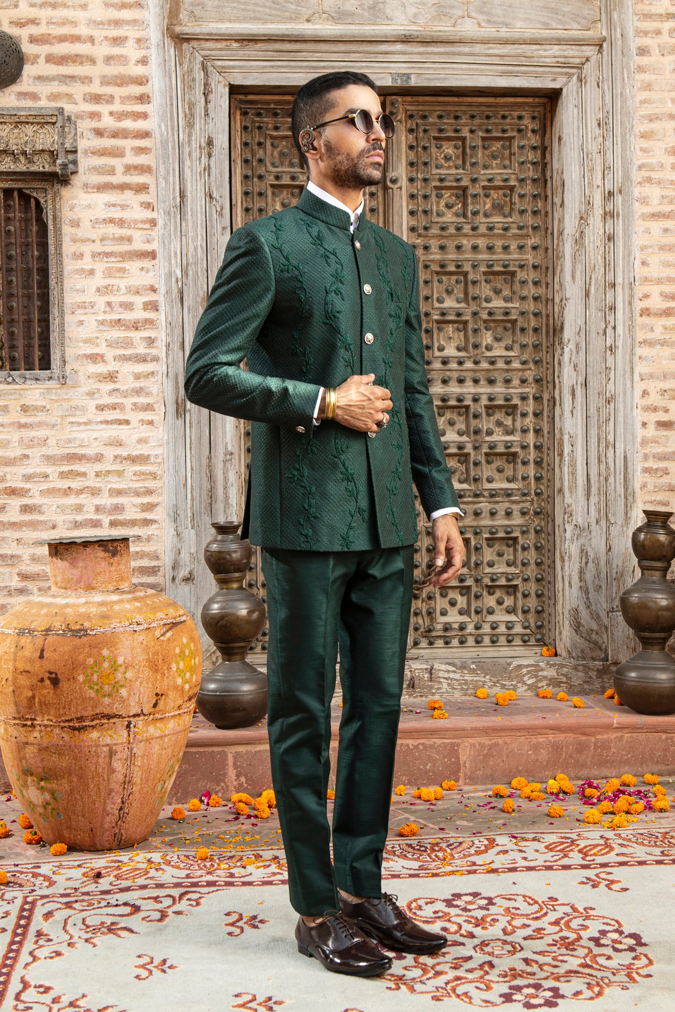 Featuring a forest green bandhgala in terry rayon base with floral zardosi embroidery. It is paired with trousers. Accessorize this set with a pair of loafers for festive occasions.