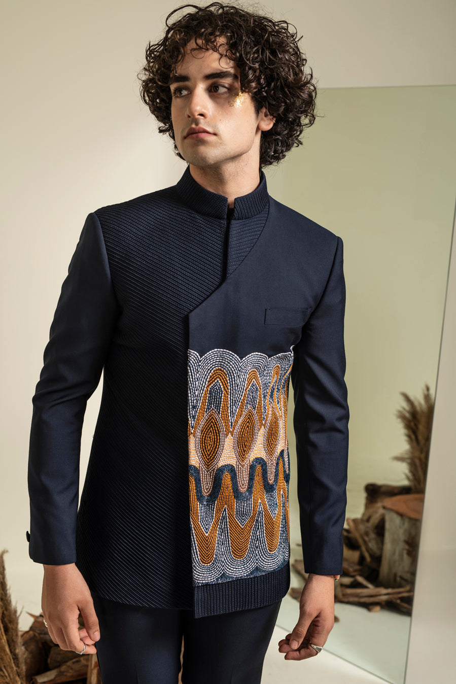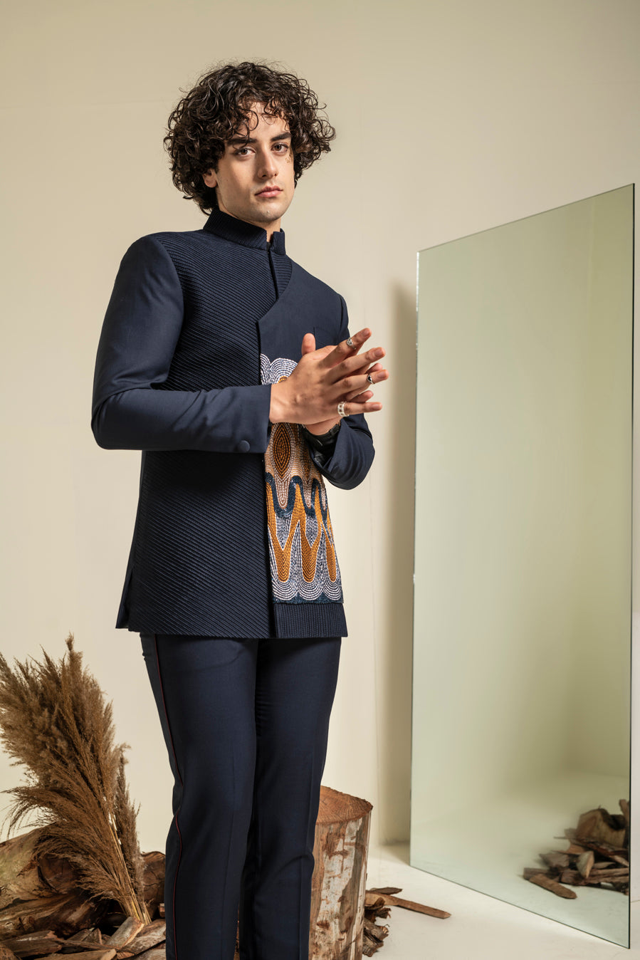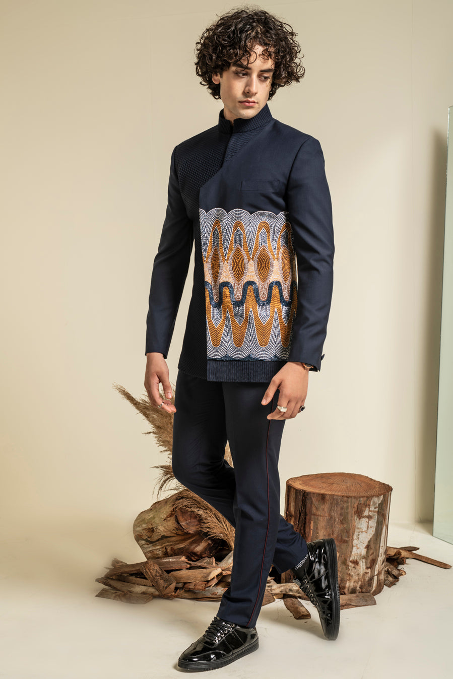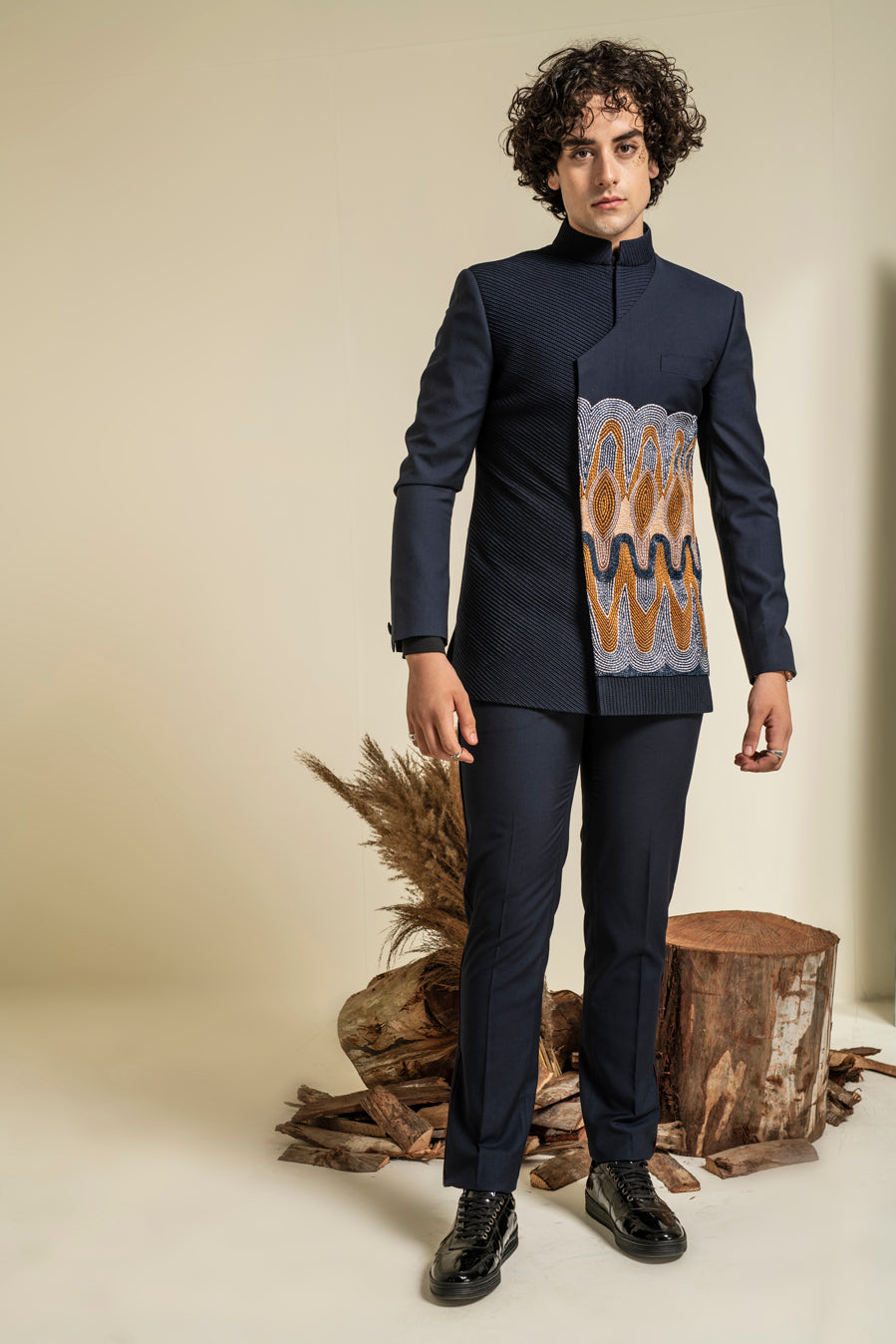 Featuring a navy blue bandhgala in terry rayon base with thread and glass bugle hand embroidery. It is paired with matching trousers