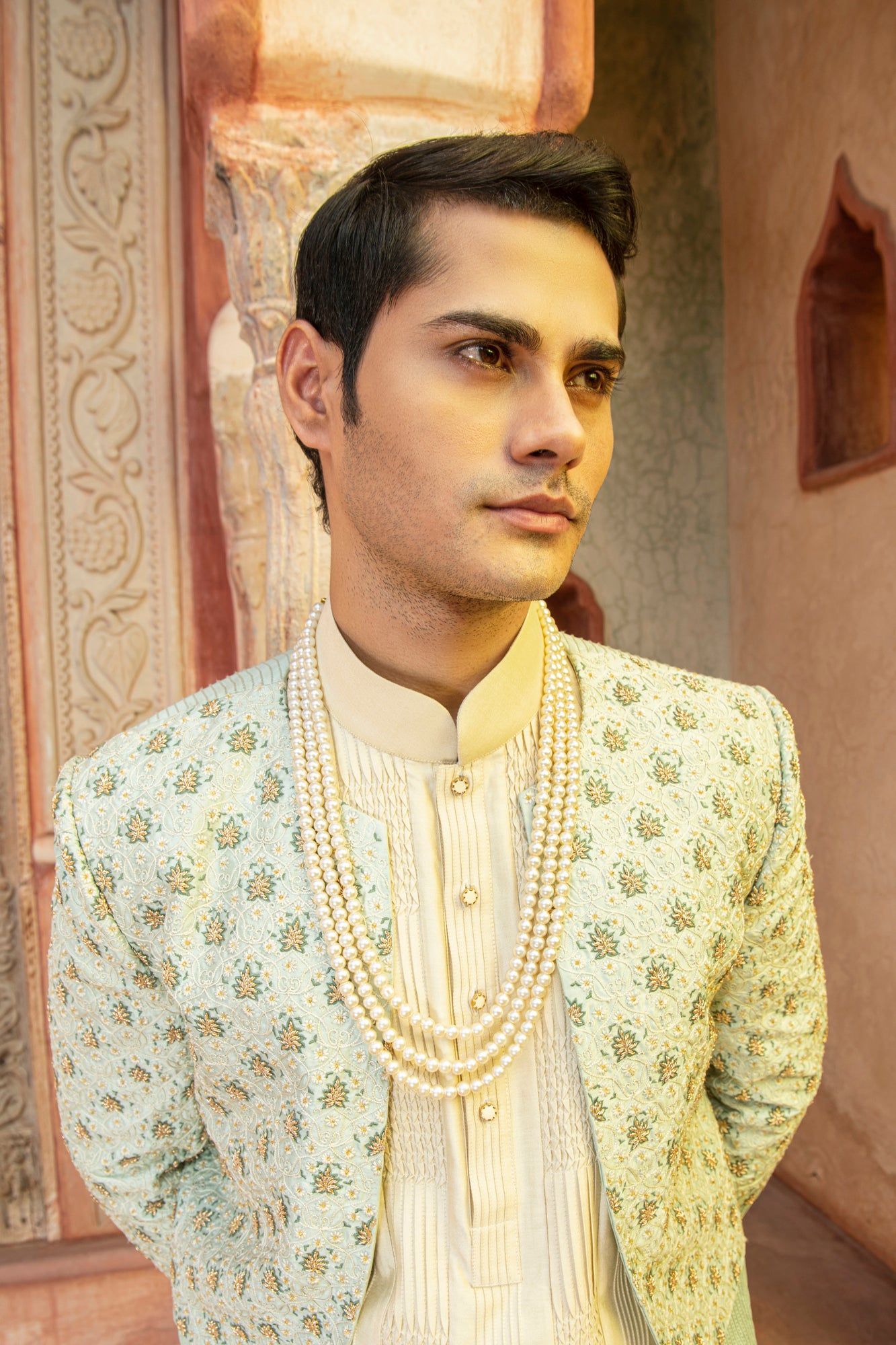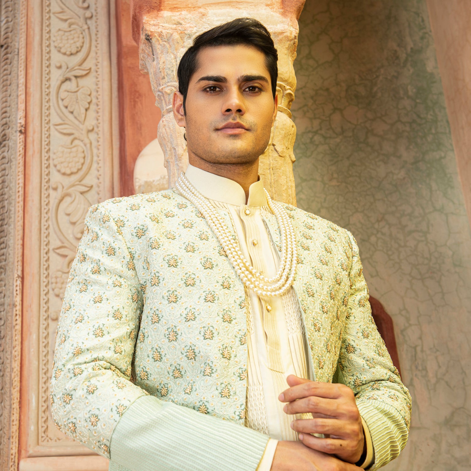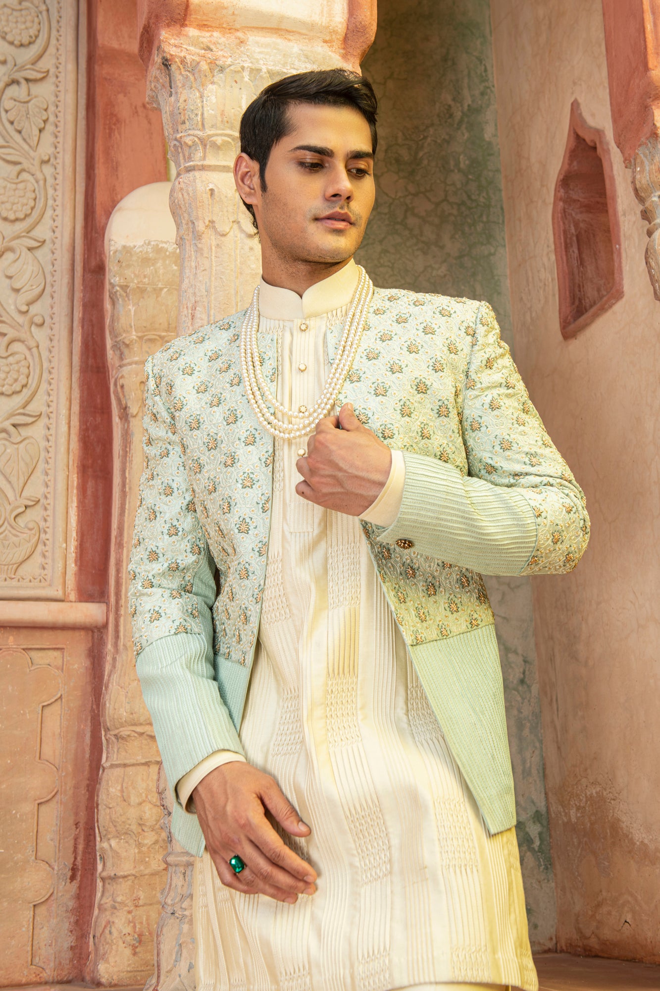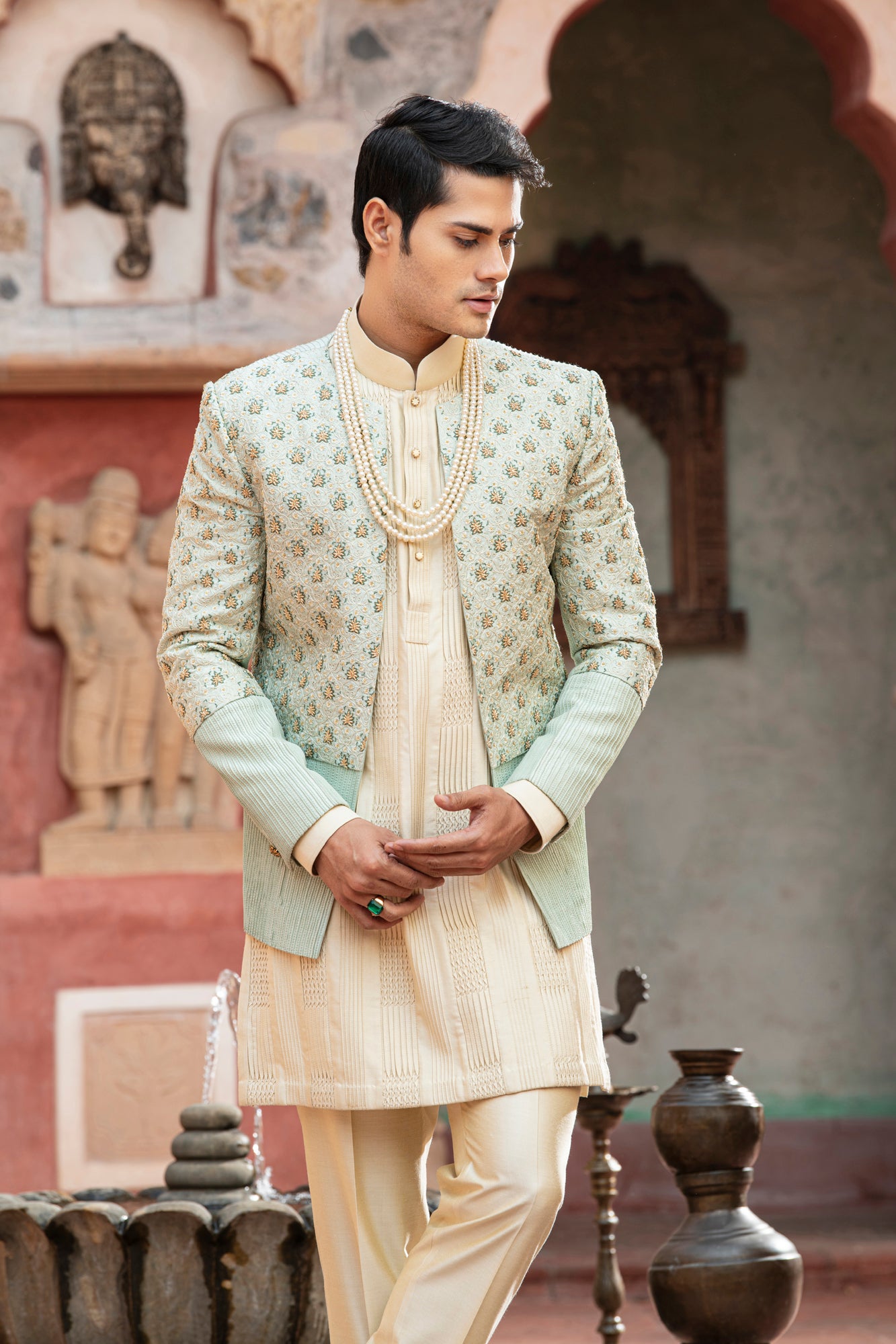 Featuring a pista green bandhgala jacket in raw silk and katan silk base with aari embroidery. It is paired with a panelled pintuck kurta having dabka and moti embroidery, including elasticated pants. This attire would be an excellent fit for a wedding or sangeet ceremon