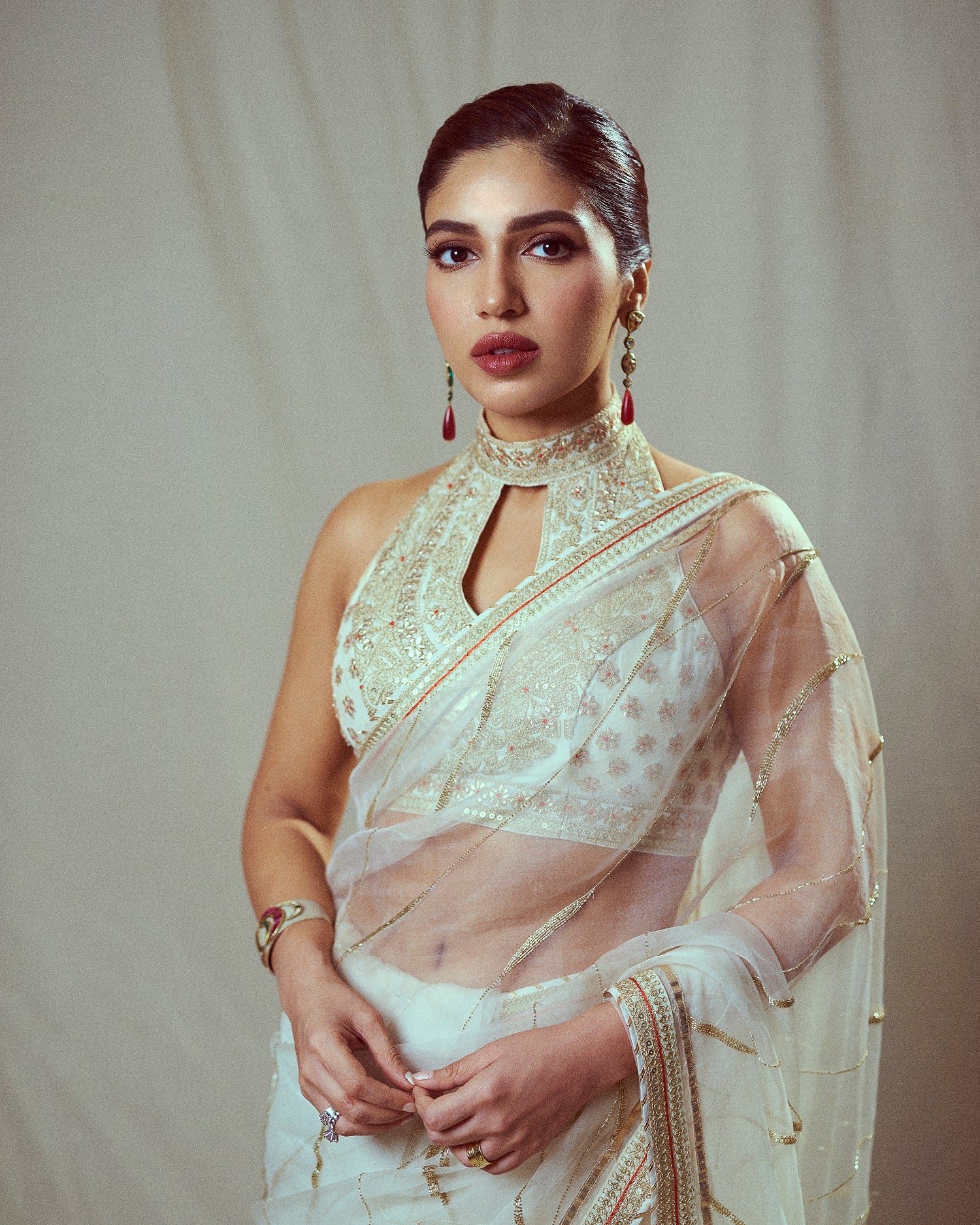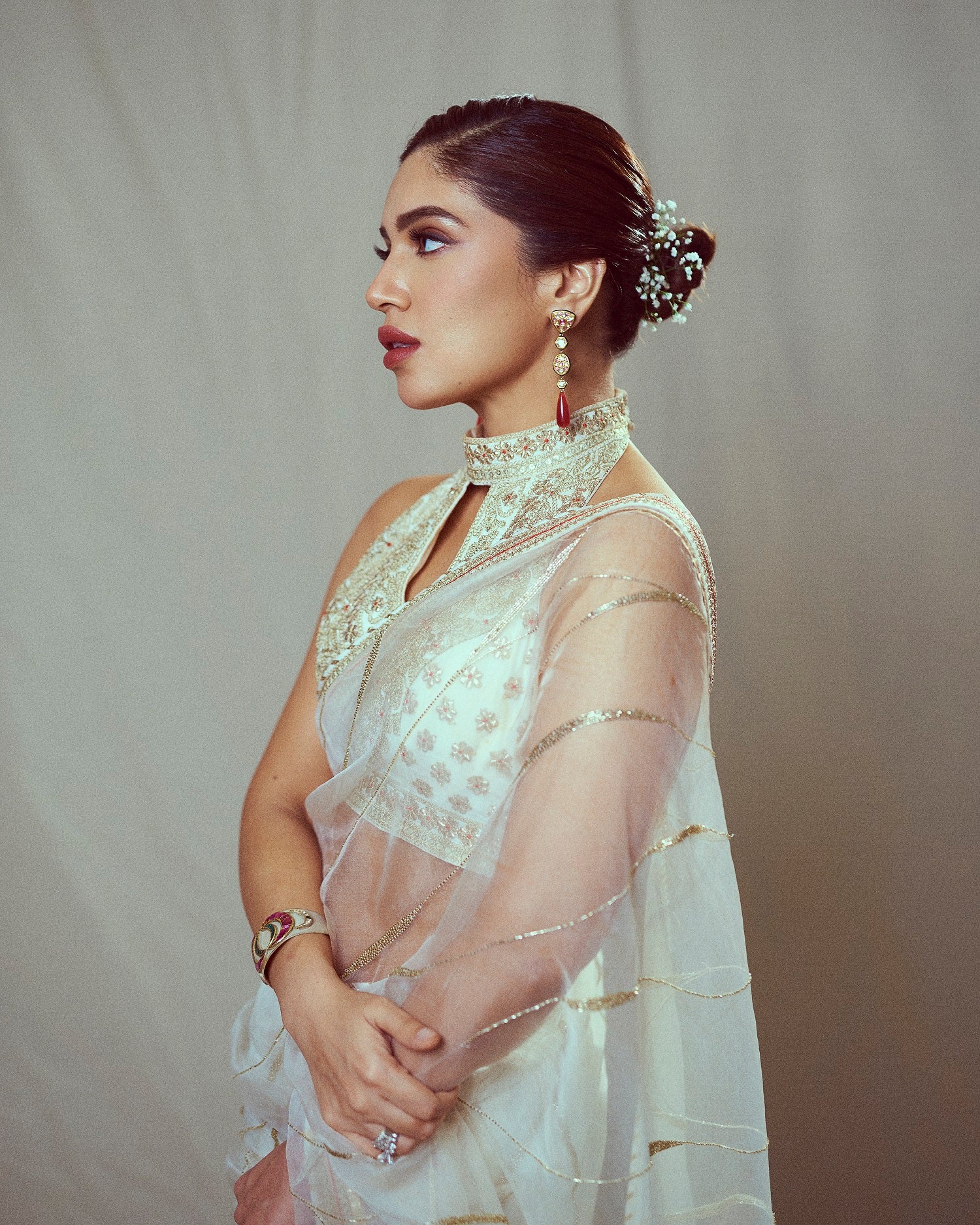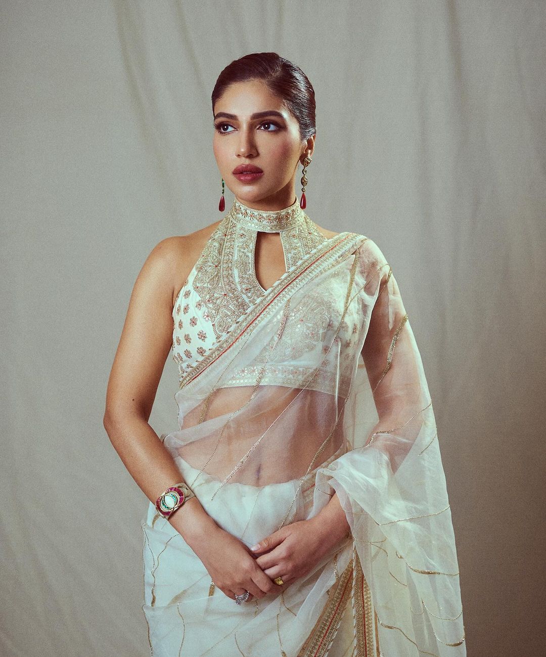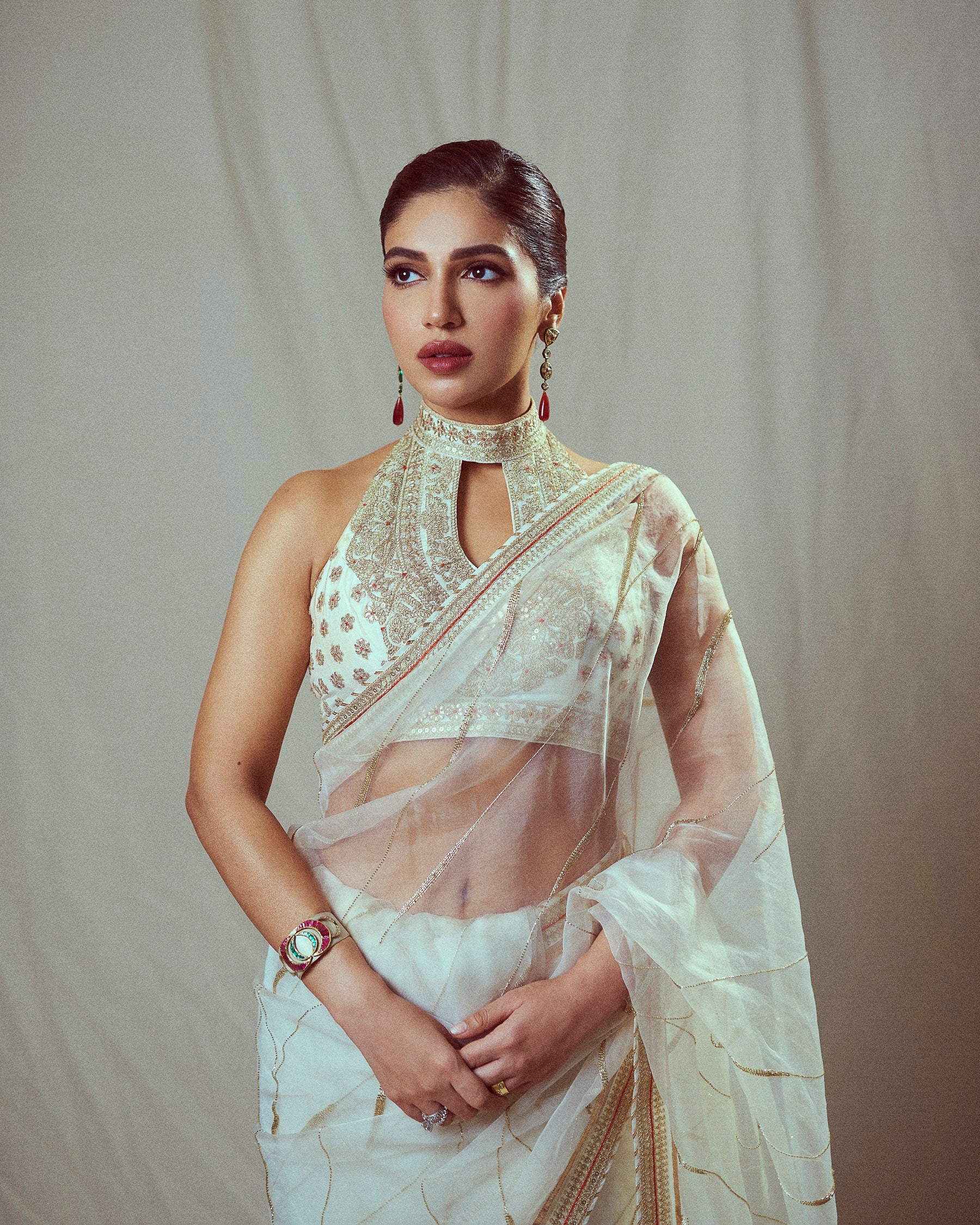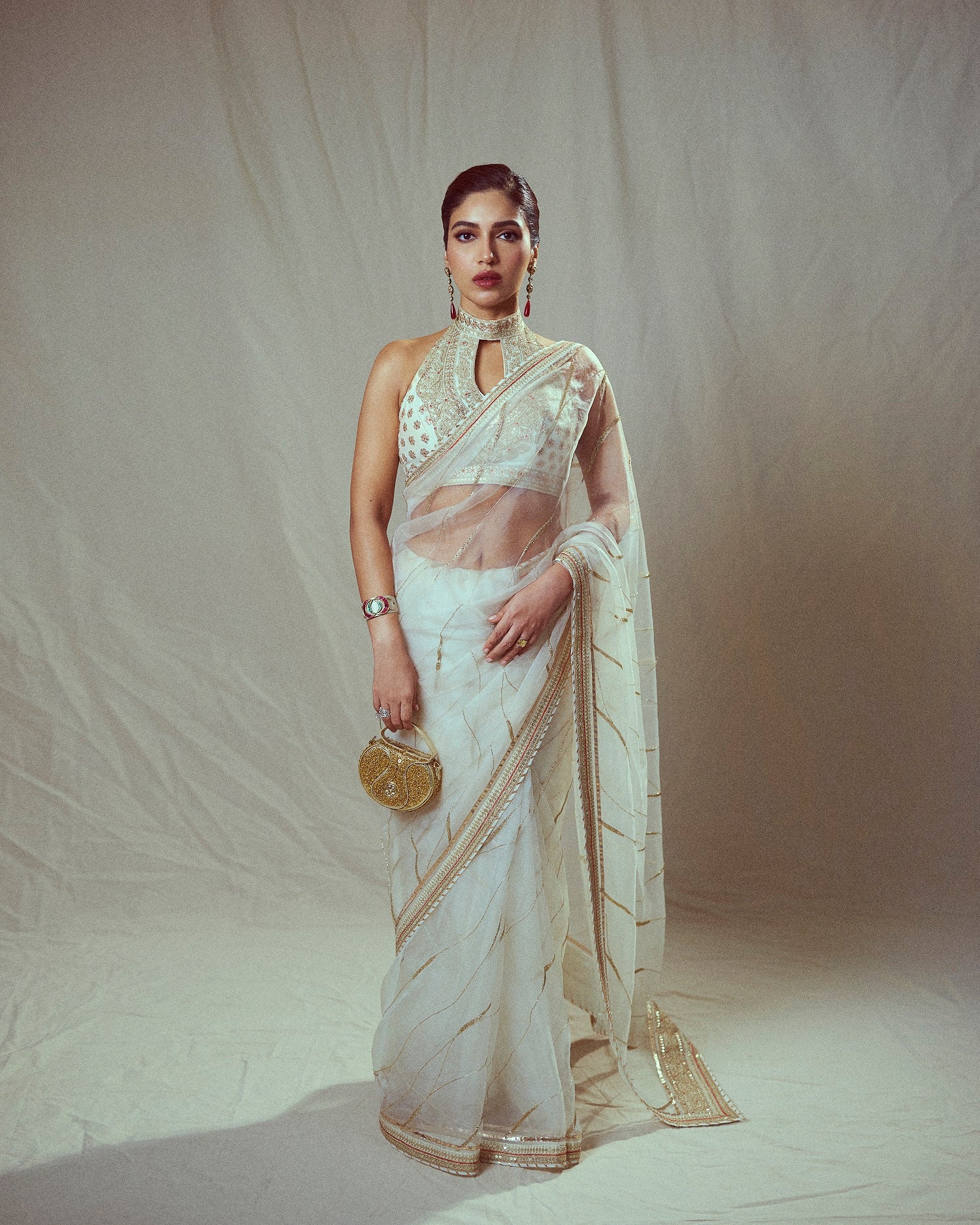 Radiate timeless beauty in this beautiful organza saree set, where subalpine detailing paired with a halter neck blouse creating a captivating look for special occasions. The blend of traditional craftsmanship and modern sensibilities makes it a must-have for those seeking a perfect balance between traditional yet evergreen style.
