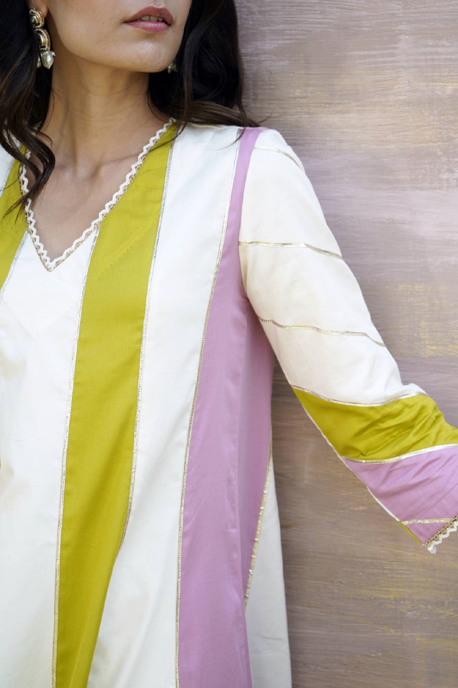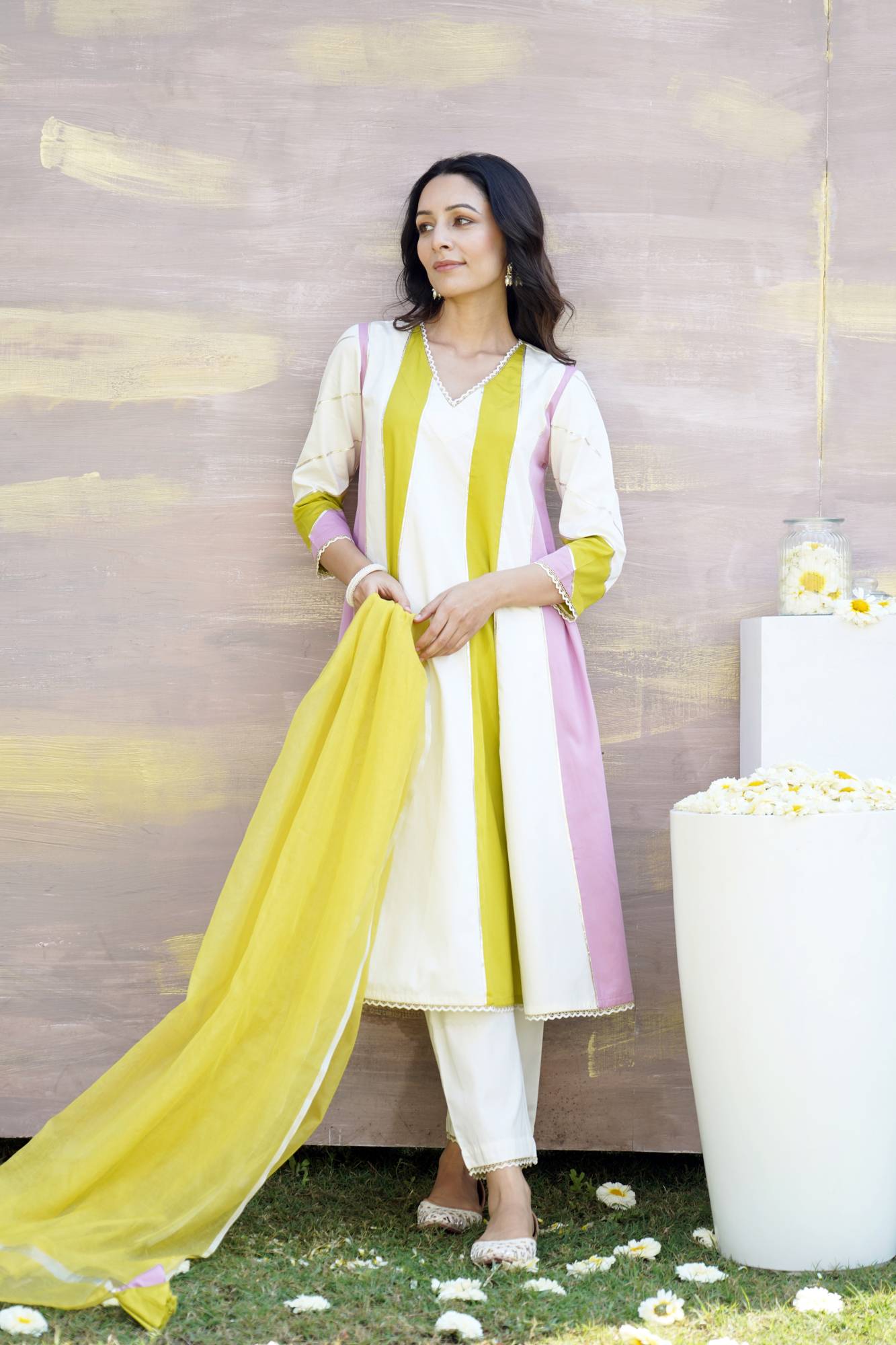 -Anarkali Kurta in Ivory, Olive and Lilac Cotton Satin Fabric with multiple panels.