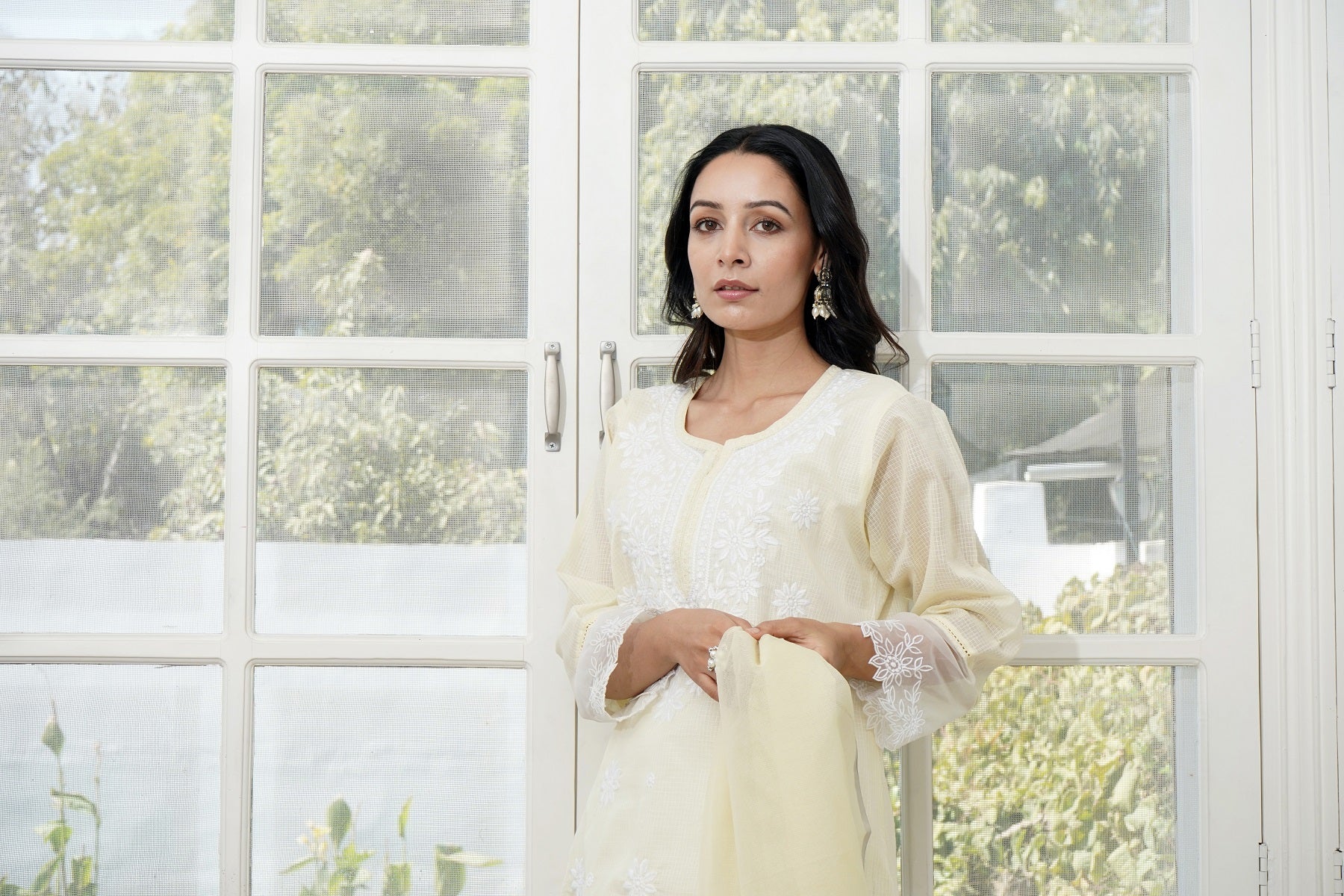 -Embroidred Kurta in Pastel Yellow Kota Fabric with Slip.