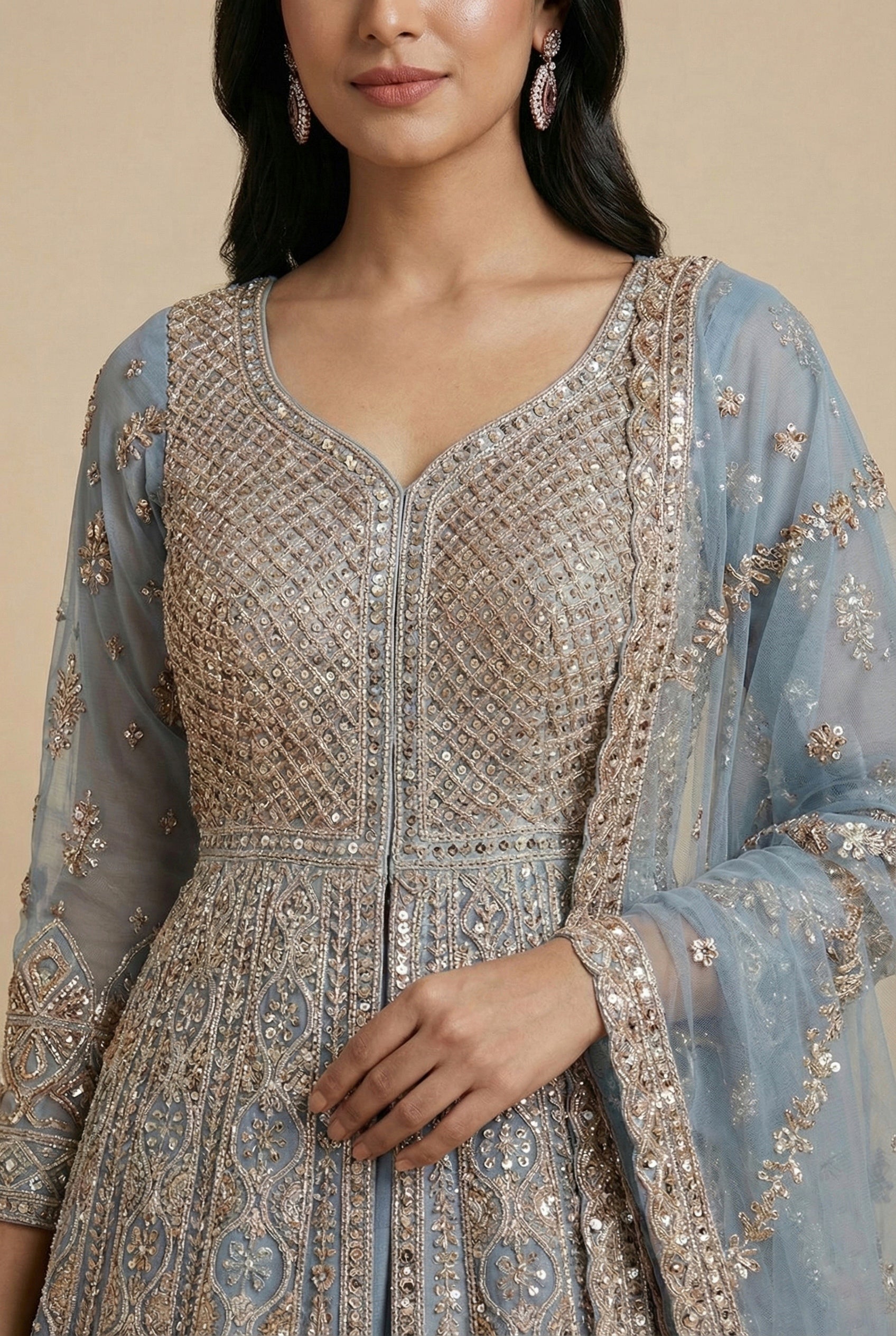 Step into timeless elegance with this exquisitely crafted Powder Blue Net Anarkali Suit. Designed in luxurious soft net fabric, this outfit features intricate silver embroidery, delicate sequins, and detailed geometric and floral motifs throughout the flare. The fitted bodice flows into a graceful Anarkali silhouette, offering a regal and flattering look. Paired with a matching embroidered net dupatta, this ensemble blends traditional craftsmanship with modern sophistication. The subtle shimmer and pastel tone make it perfect for both day and evening celebrations.