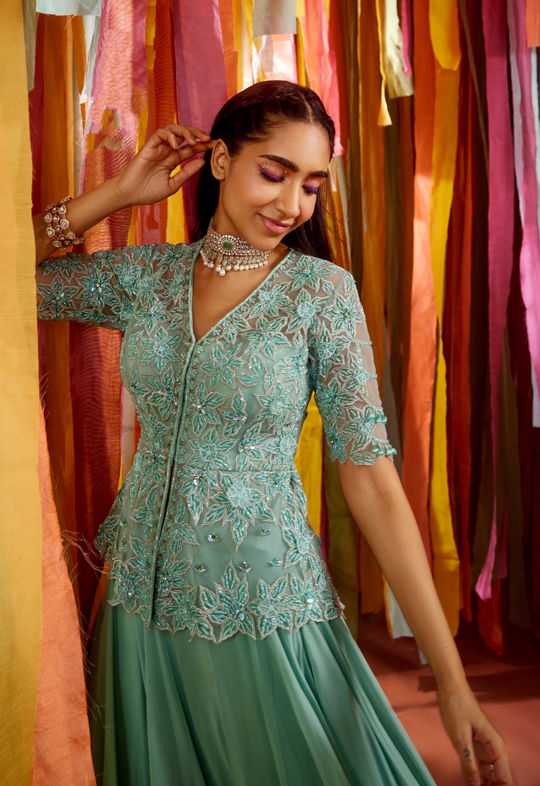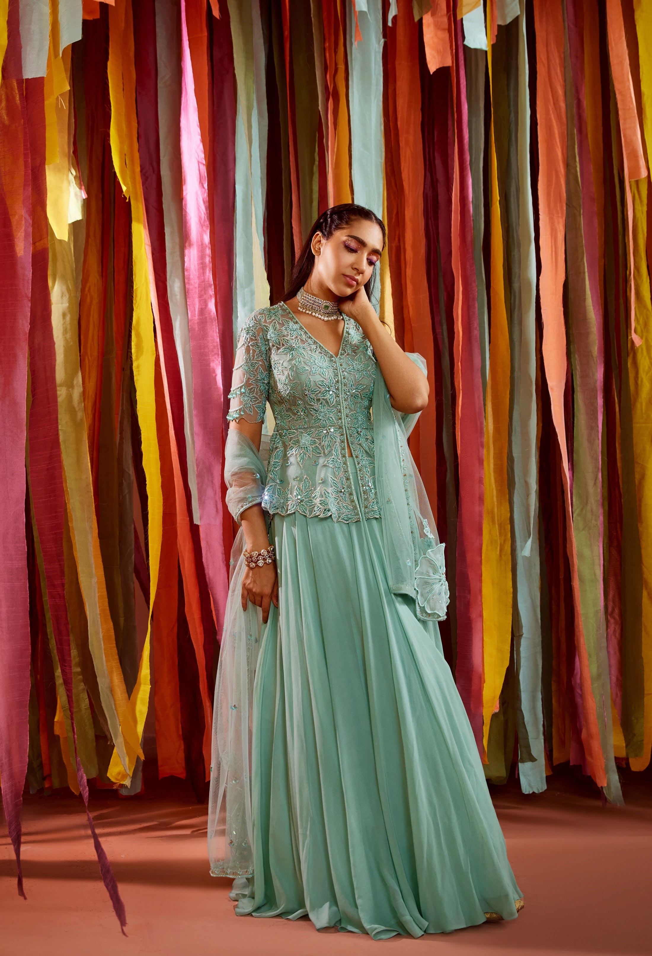 | Mint green floral embroidered peplum in net, it has tonal mint green embroidery along with gold highlights. the sleeve has hand made drops detailing, It is paired with a georgette skirt and net hand embroidered dupatta with big organza flowers . |