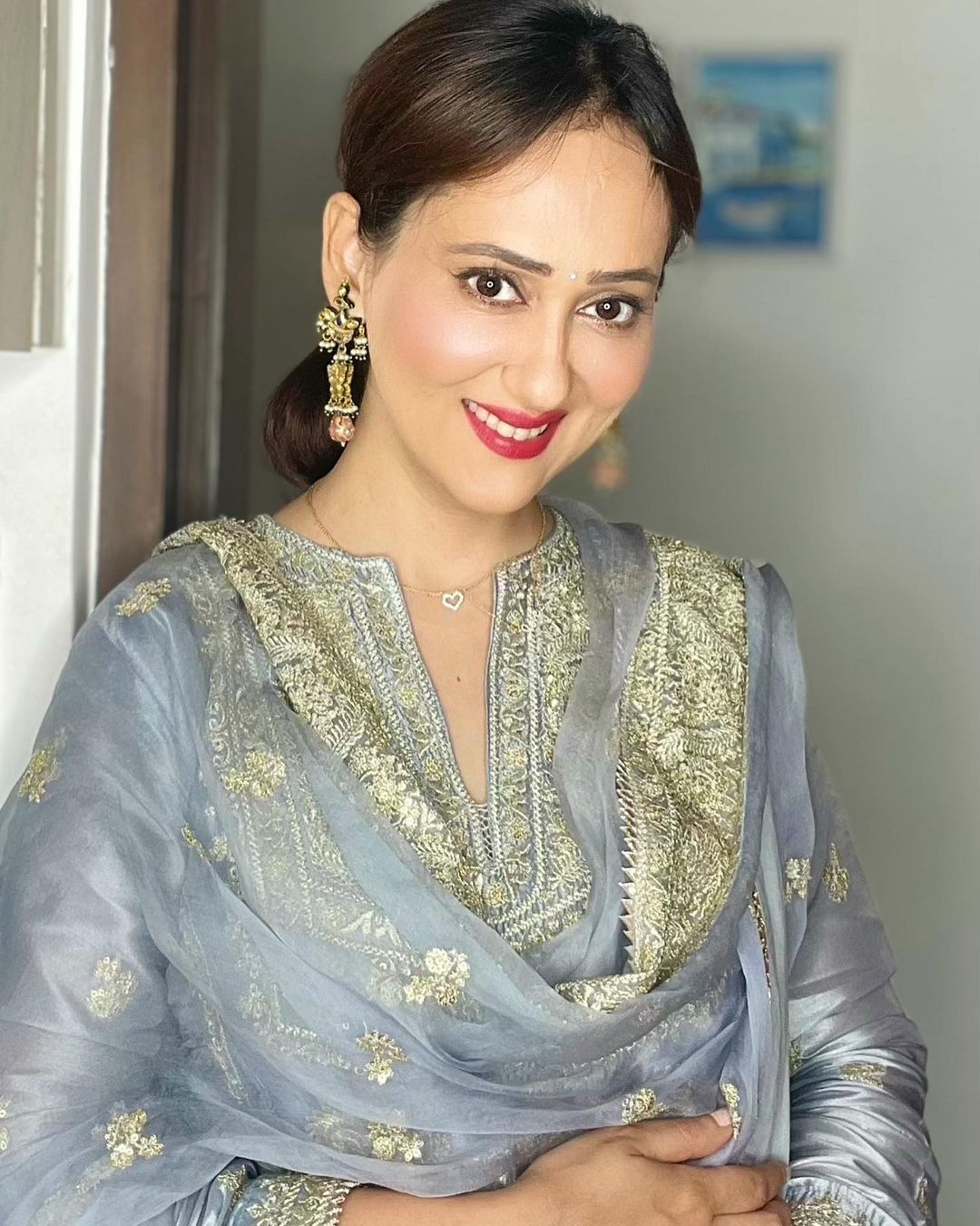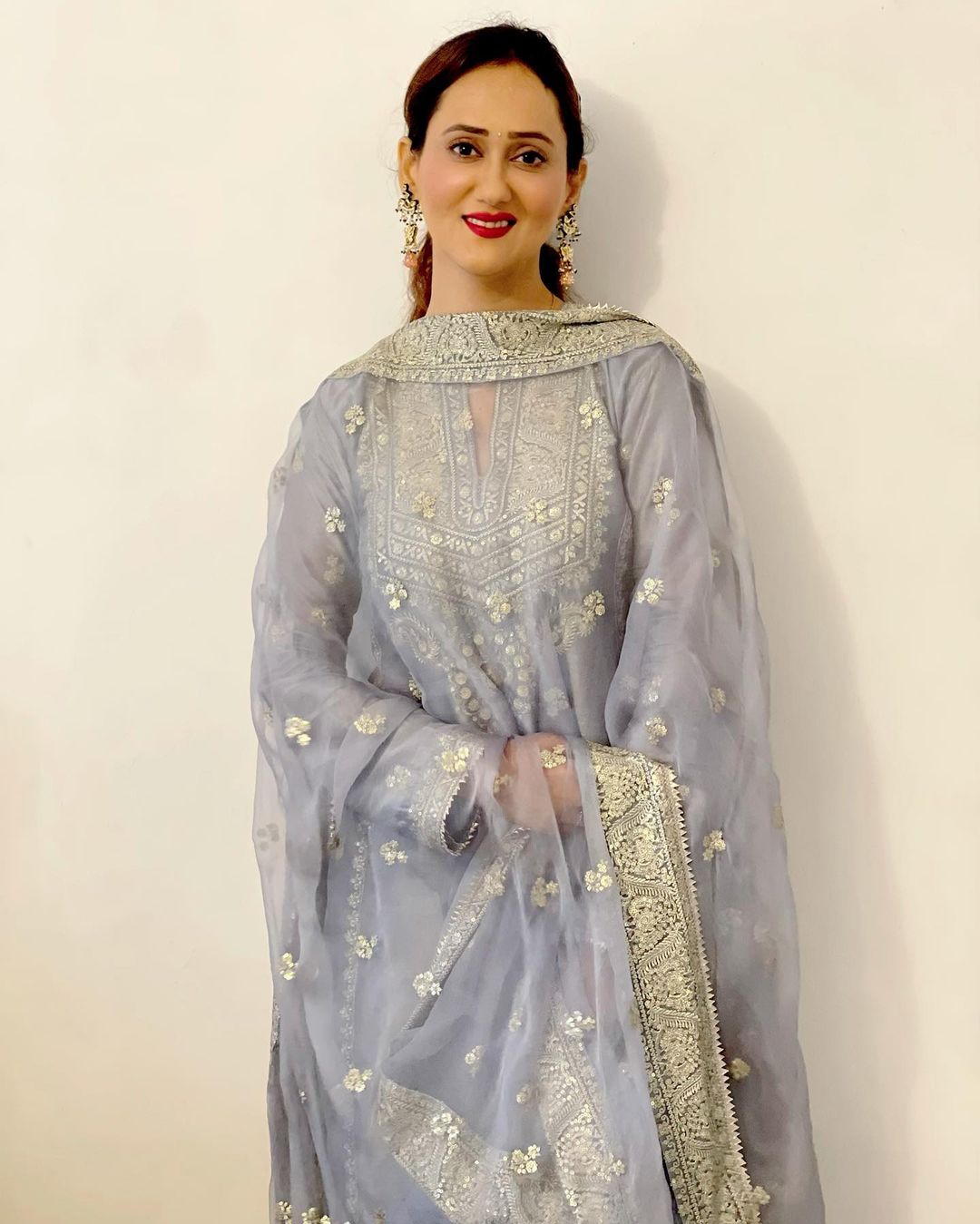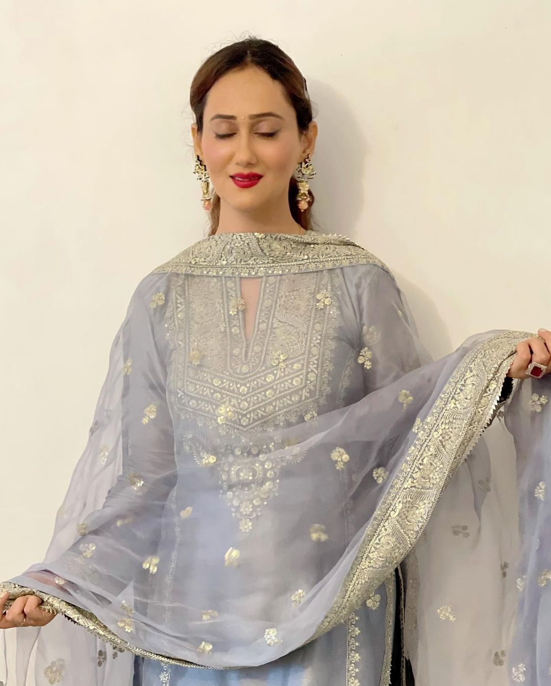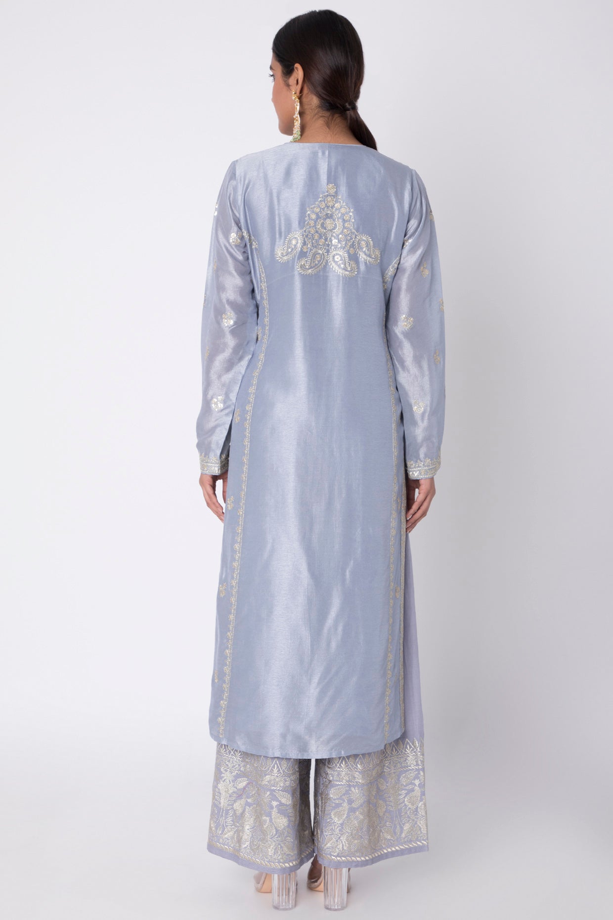 A Long Sleeved Kurta Paired With A Embroidered Palazzo And Dupatta .