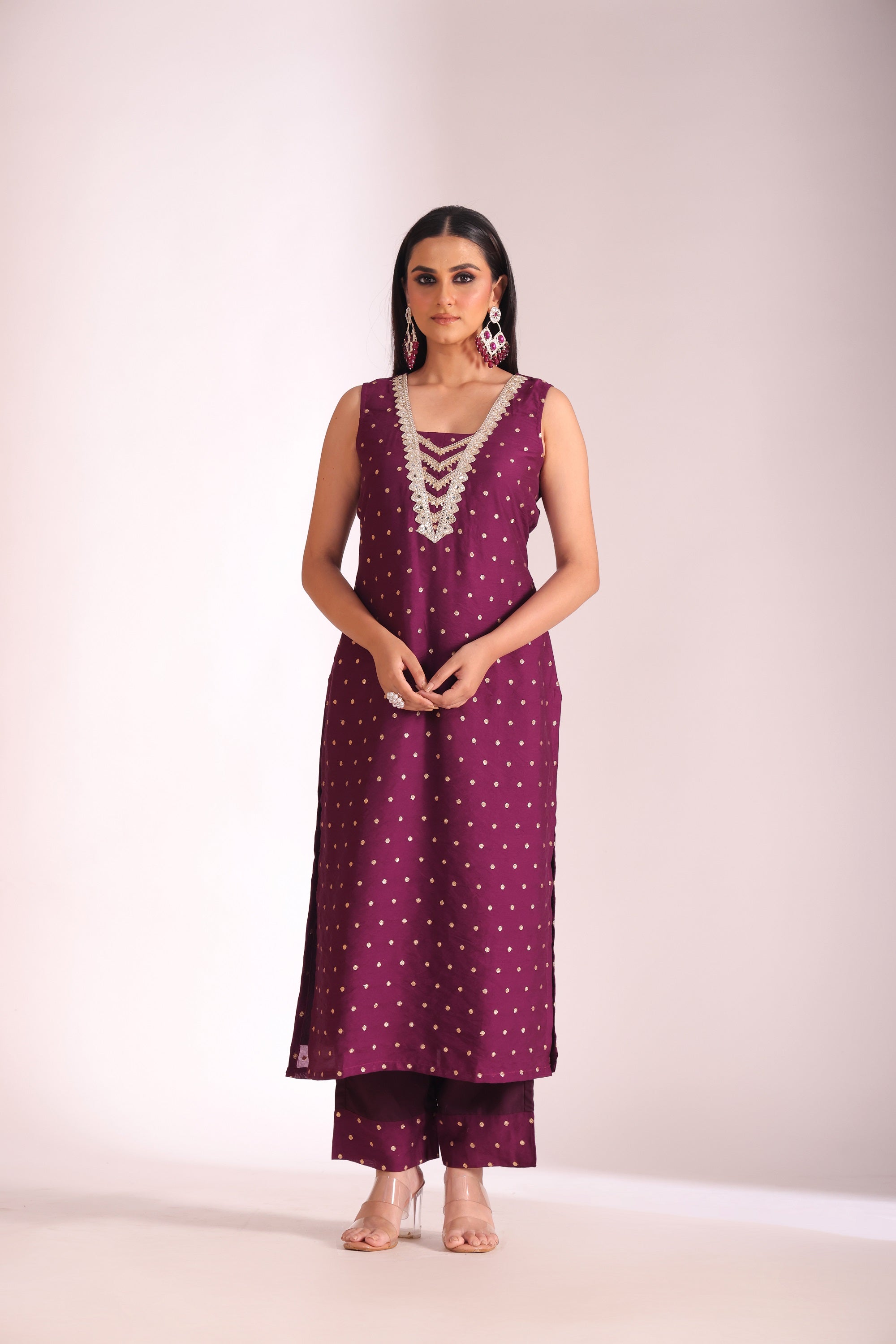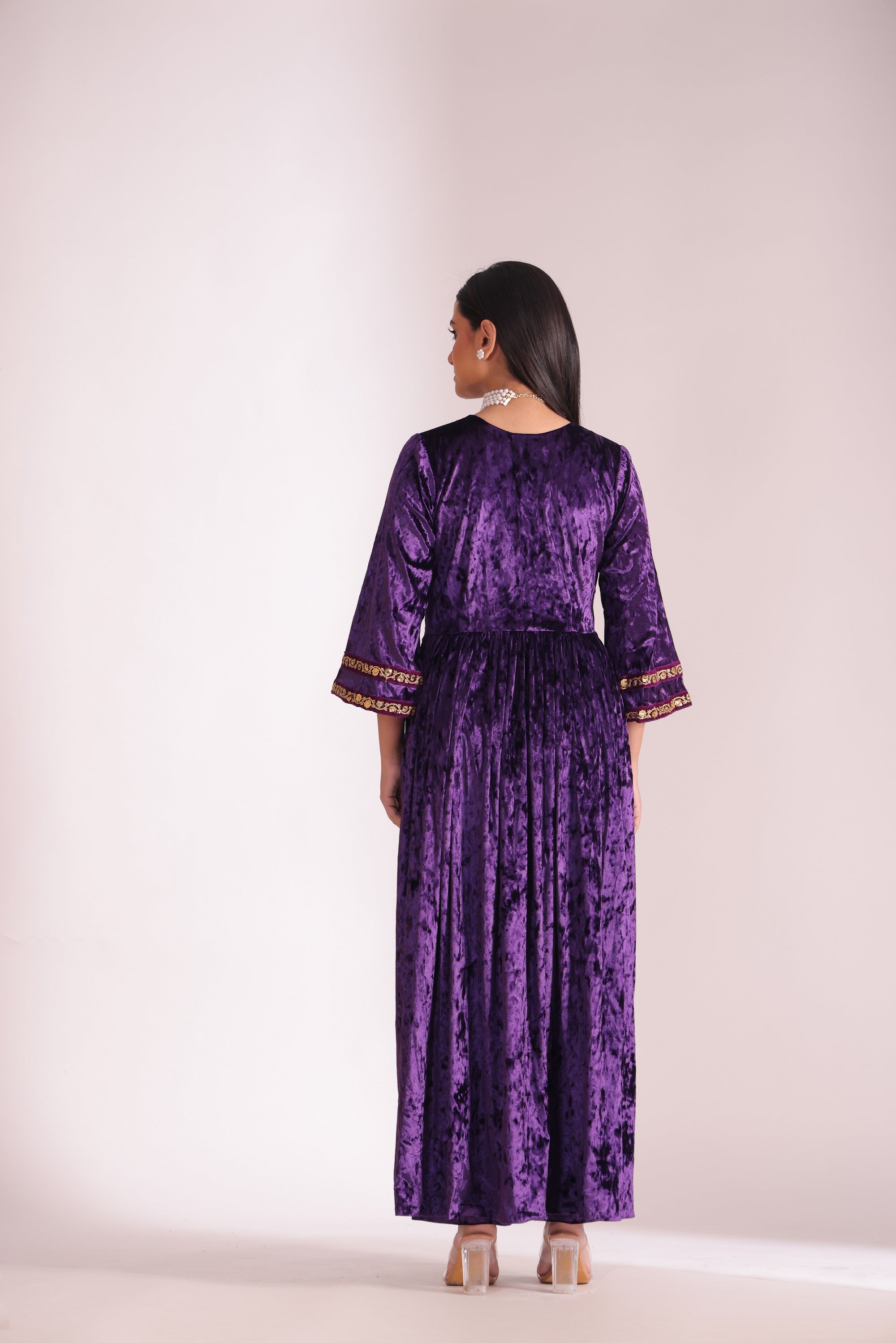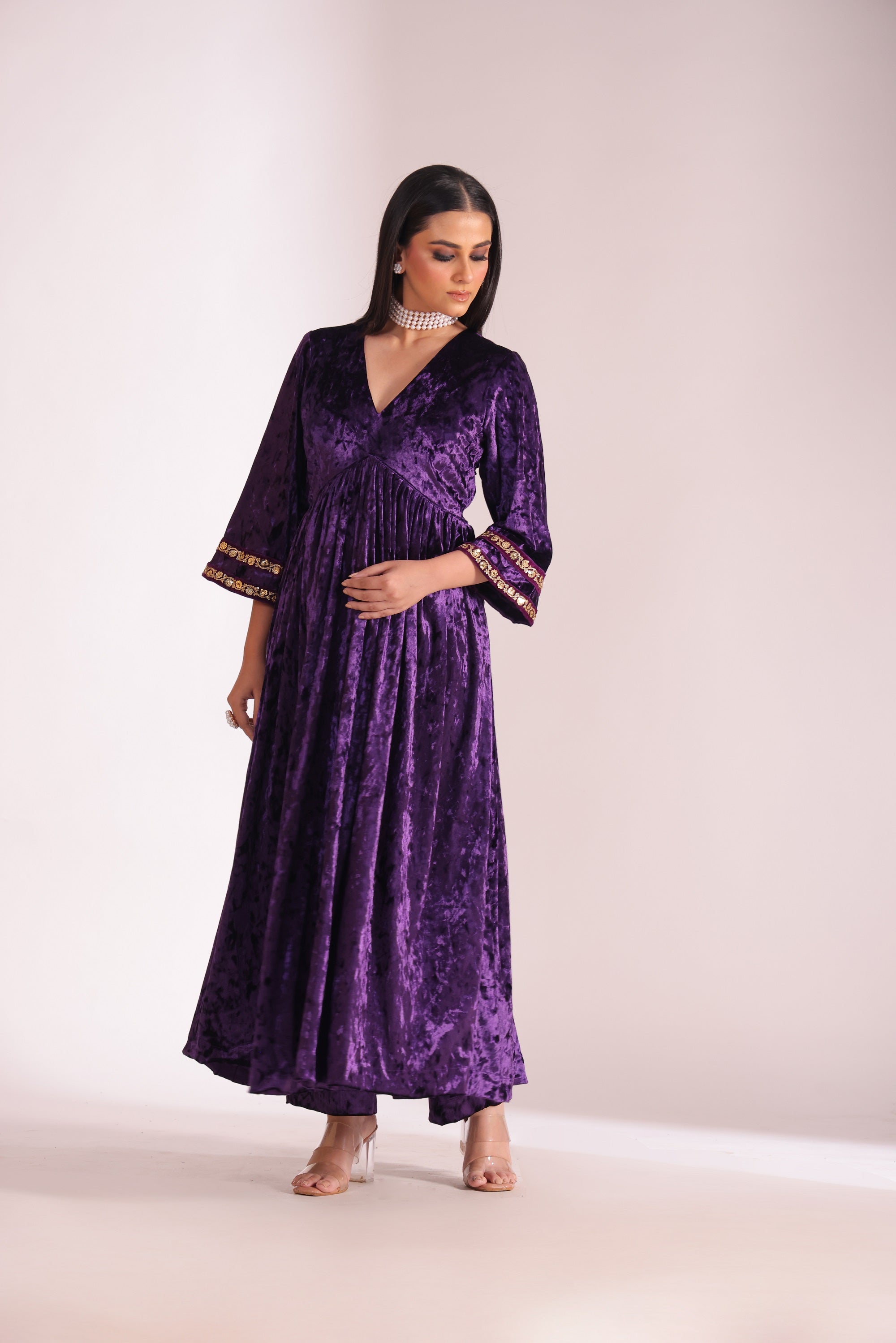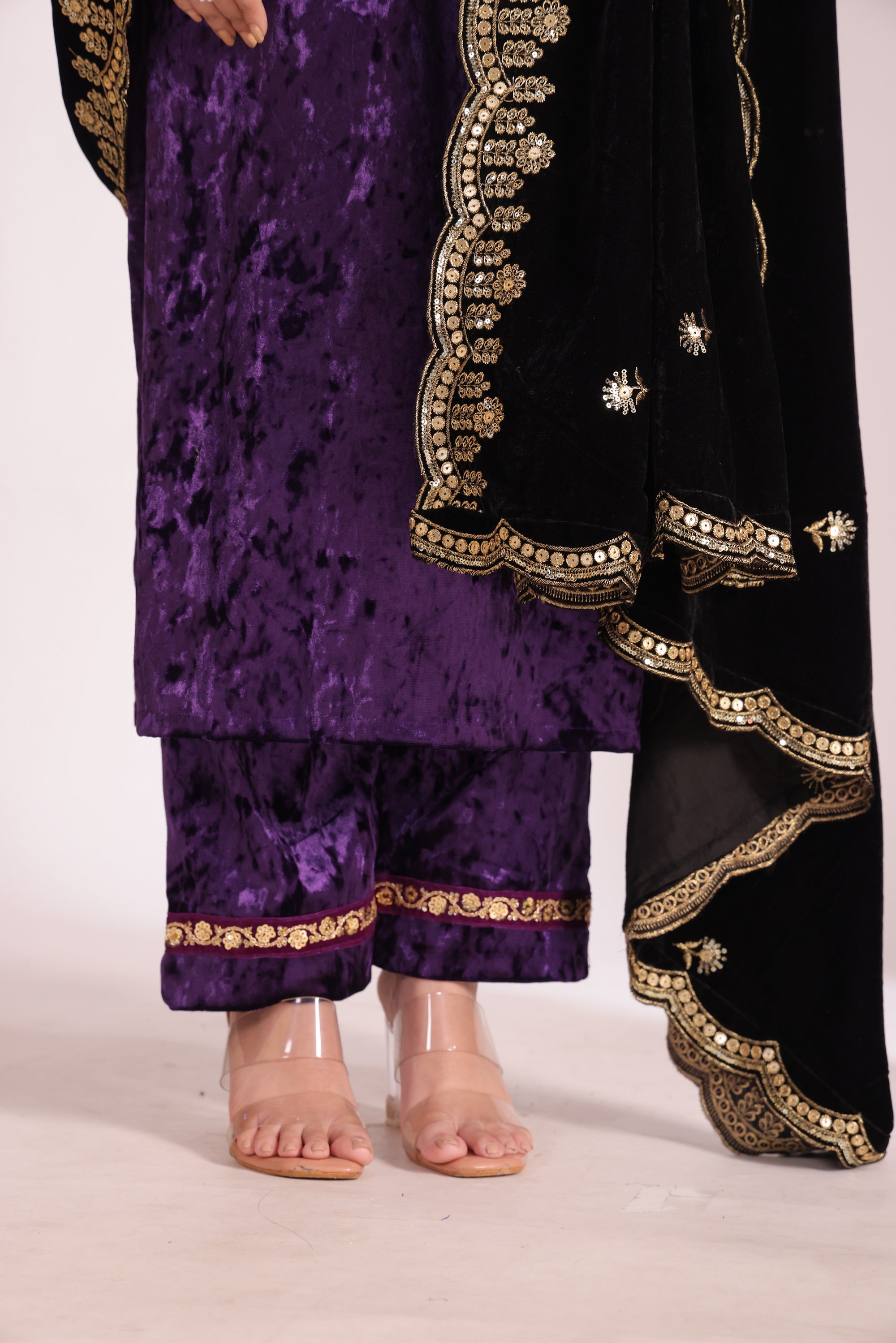 Noor-e-zar purple velvet kurta with velvet palazzo and shawl - set of 3