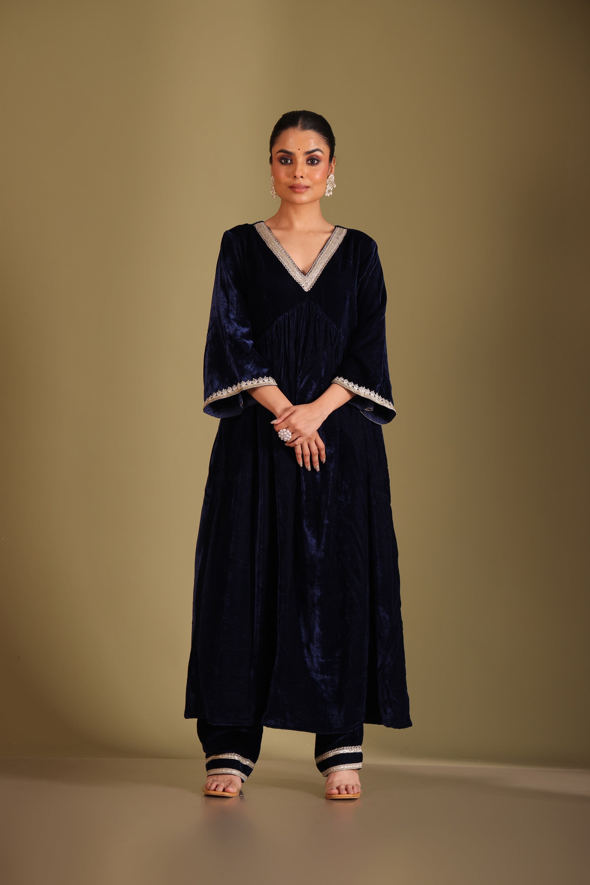 Noor-e-zar navy blue velvet kurta with velvet pants and shawl