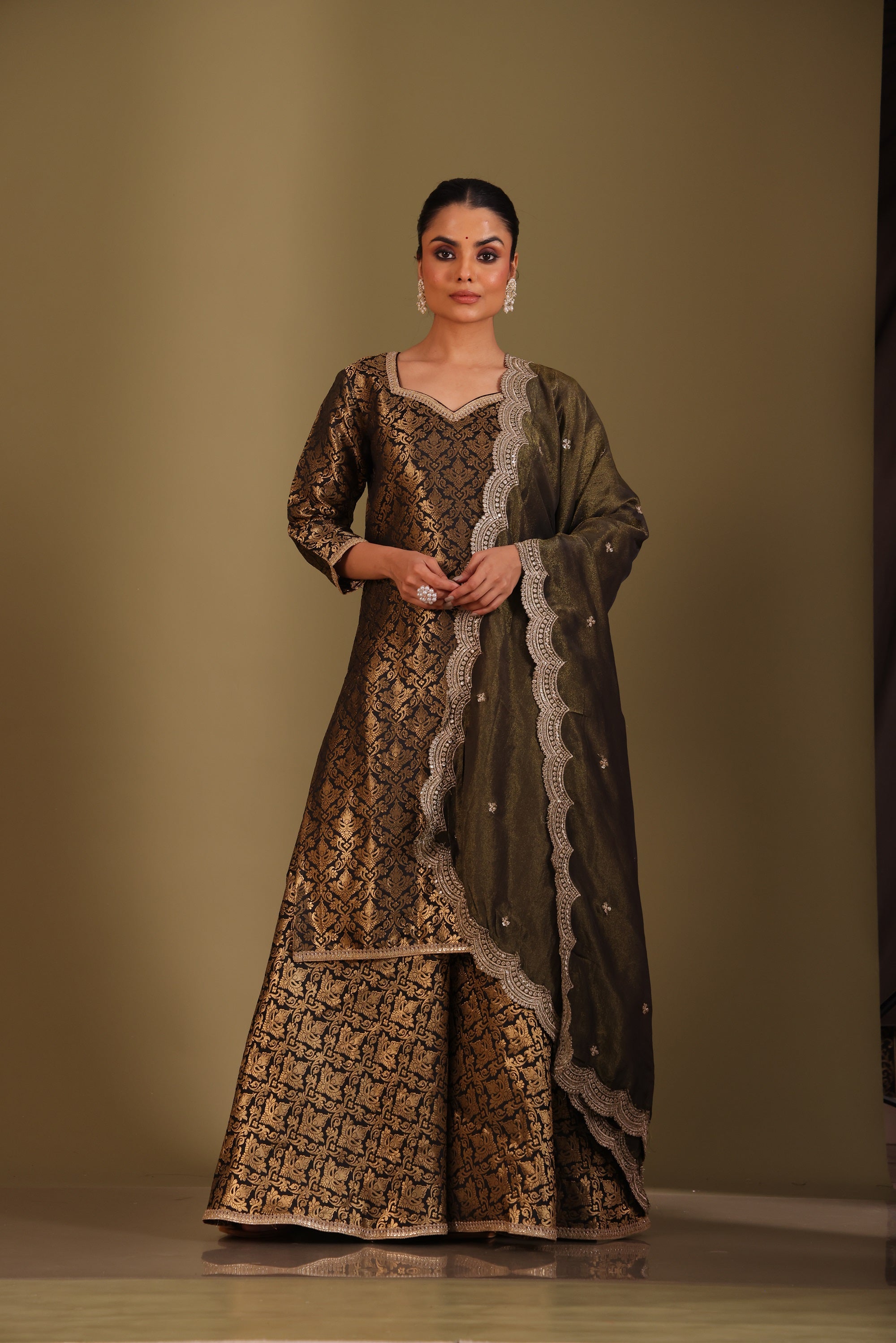 Noorika ivory brocade blouse with sage silk lehenga and dupatta- set of 3