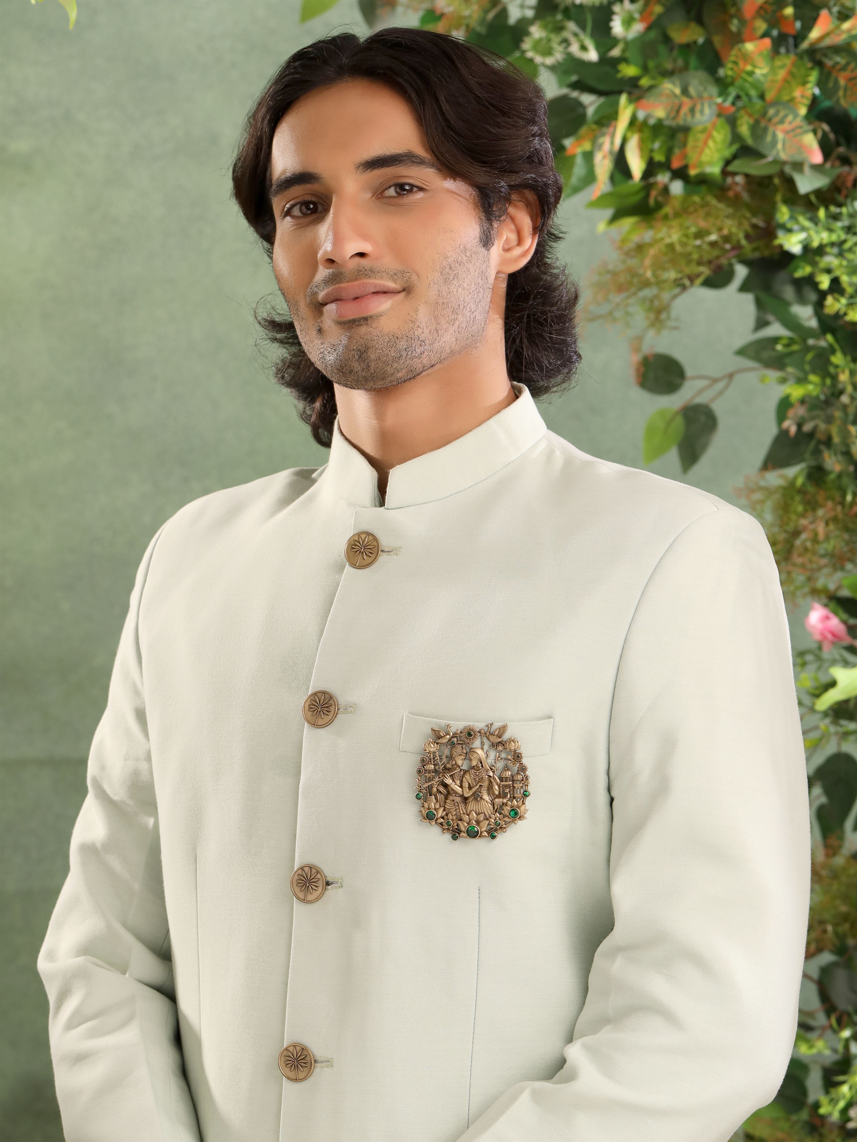 | Celebrate the eternal bond of love with the Divine Love Krishna Radha Brooch. This exquisite lightweight accessory features a beautifully detailed depiction of Lord Krishna and Radha, surrounded by intricate motifs of peacocks, lotus flowers, and emerald-like stones. Perfect for adorning your coat, jacket, or bandhagala, this brooch adds a touch of divine elegance to any ensemble, making it an ideal choice for those who cherish cultural artistry and timeless romance. |