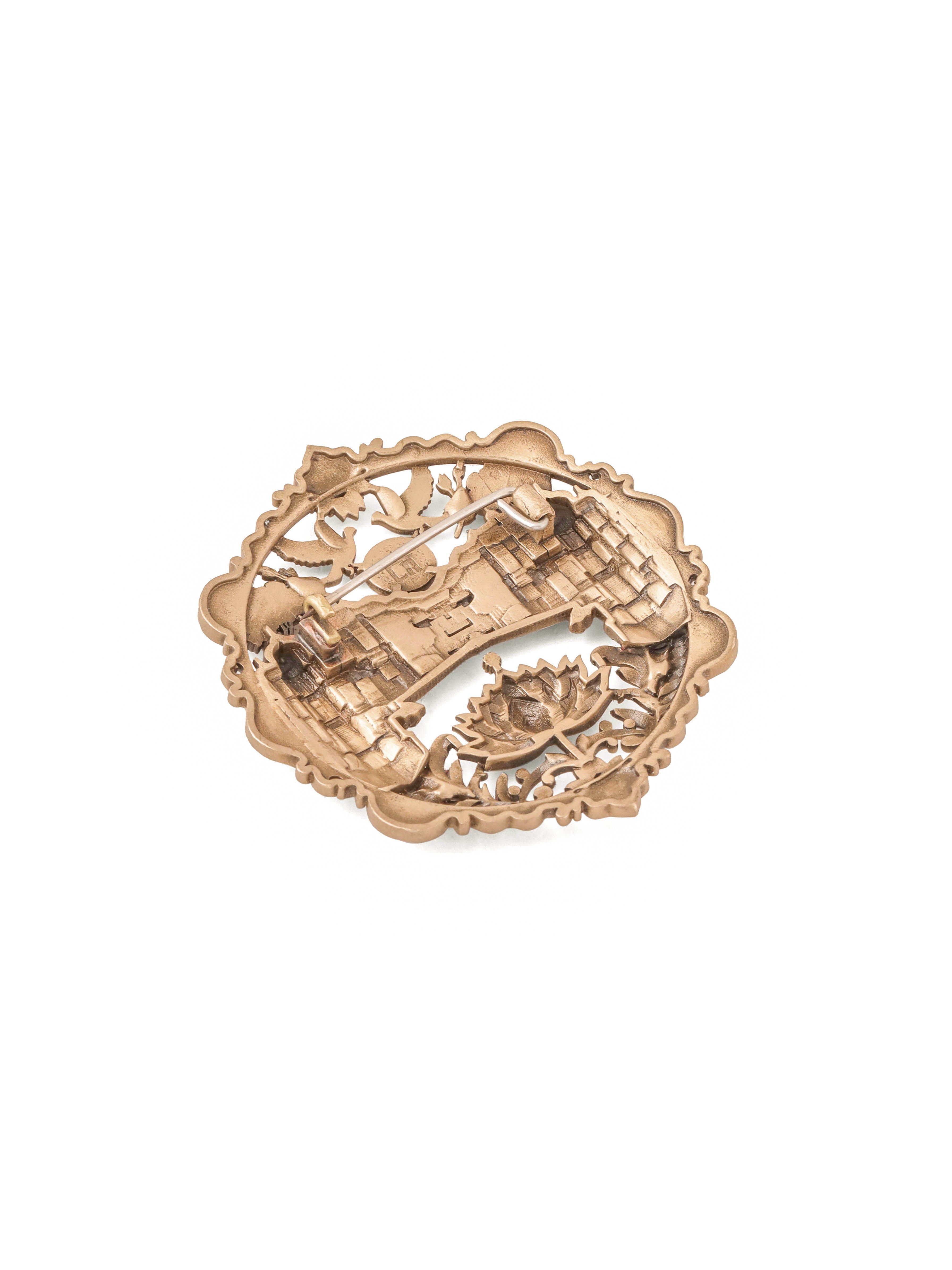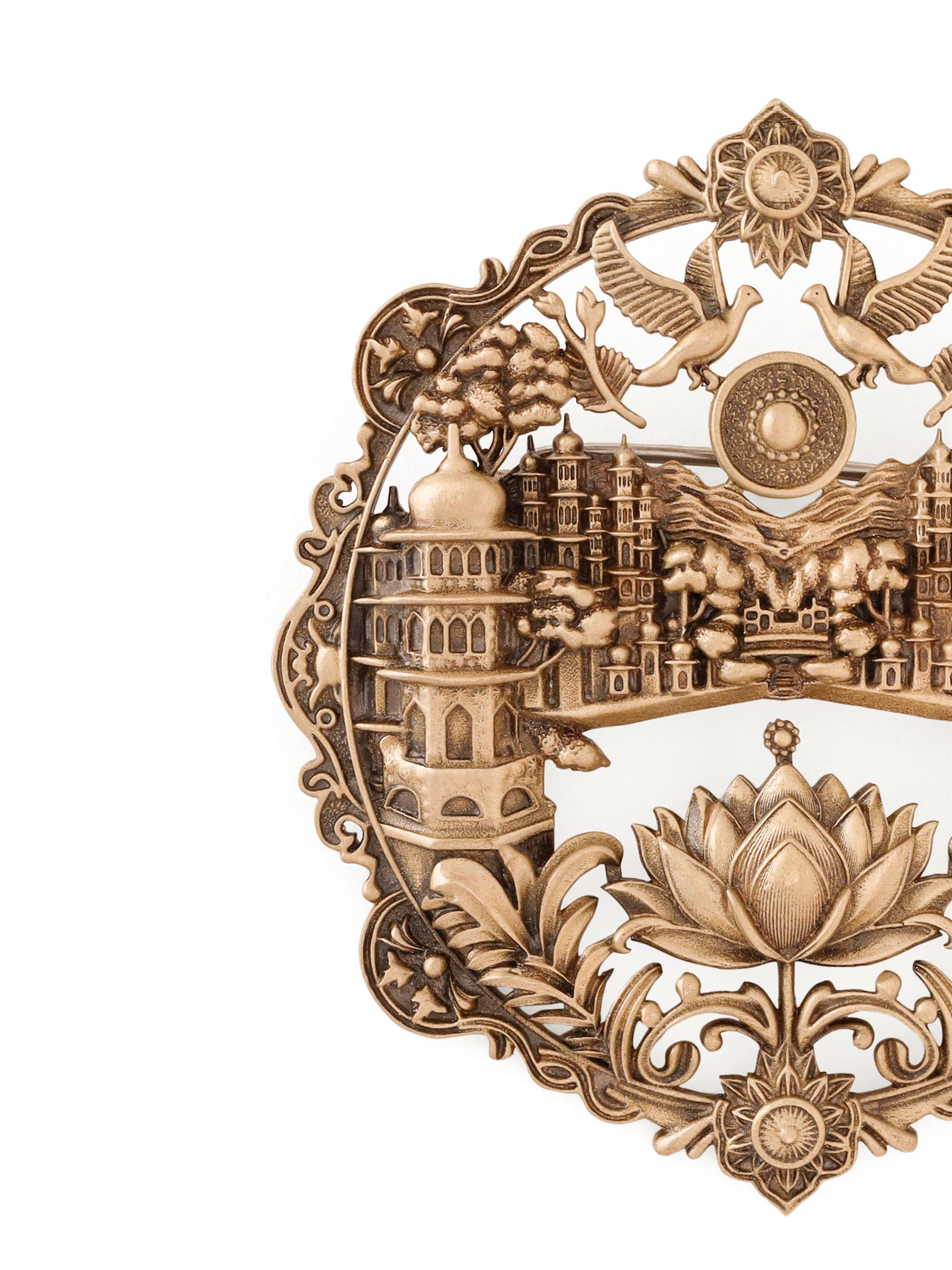 | Step into a world of grandeur with the Heritage Lotus City Brooch, a masterpiece that captures the essence of royal architecture and cultural elegance. This exquisite brooch features an intricate depiction of a majestic cityscape, framed by ornate towers and flourishing with symbolic elements such as a serene lotus and two regal doves. The antique gold-tone finish enhances the detailed artistry, making this brooch a captivating accessory. Lightweight and versatile, it is perfect for adorning your coat, jacket, or bandhagala, adding a touch of historical opulence and timeless charm to your attire. |