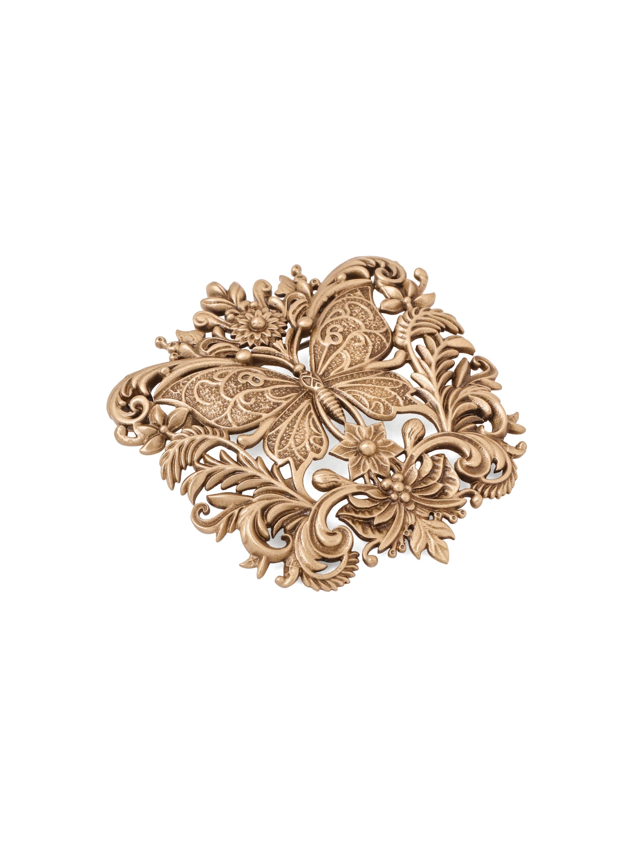 | Embrace timeless elegance with the Majestic Butterfly Filigree Brooch, a beautifully crafted accessory that exudes grace and sophistication. This brooch features a stunning butterfly design, intricately detailed with ornate filigree patterns and floral accents, all brought to life in a luxurious antique gold-tone finish. Lightweight and versatile, this brooch is perfect for enhancing the charm of your coat, jacket, or bandhagala. Whether worn for a special occasion or to elevate everyday attire, this brooch adds a touch of vintage-inspired beauty to your ensemble. |
