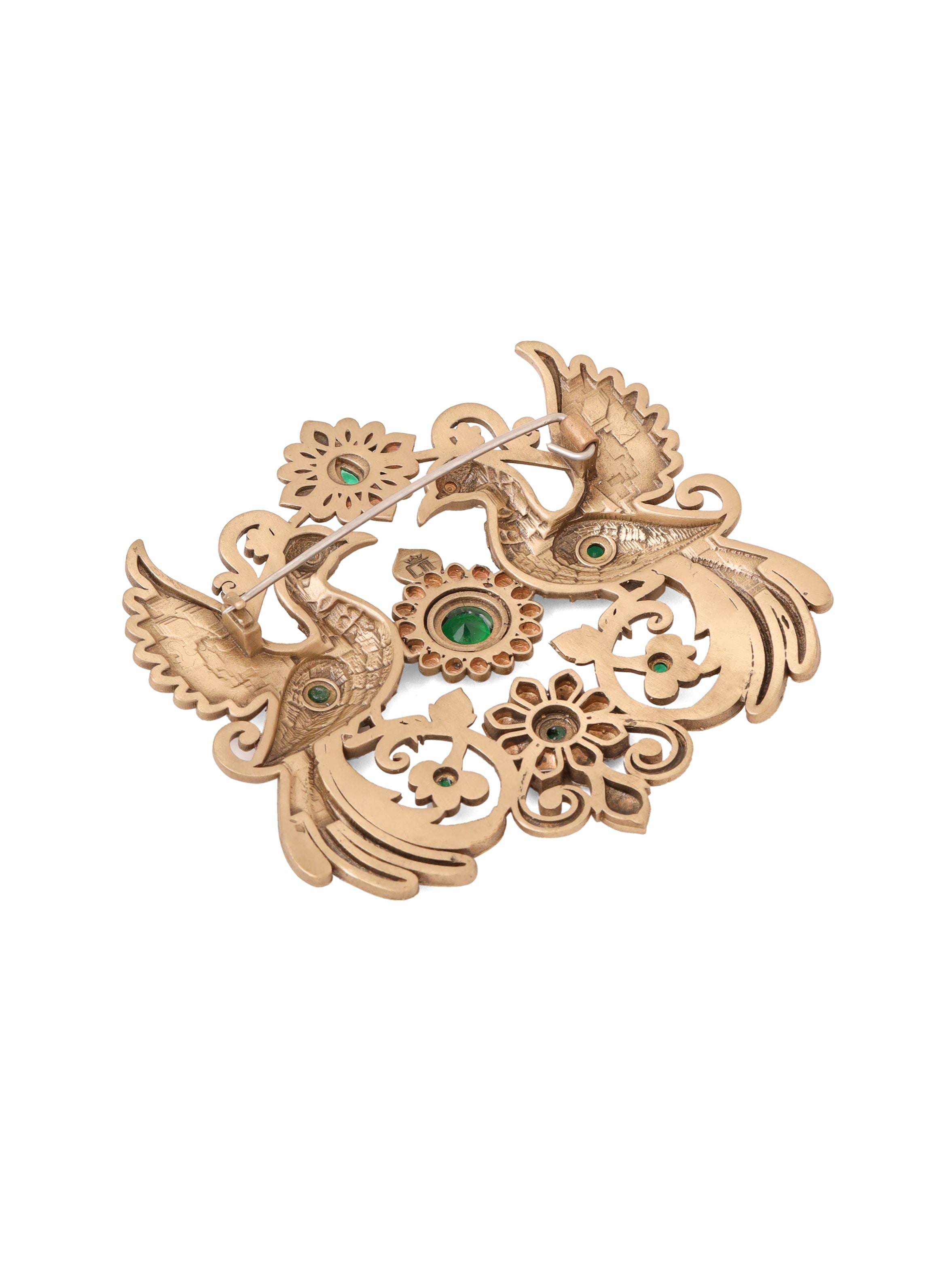 | Embrace the elegance of nature with the Peacock Enchantment Brooch. This stunning accessory showcases a pair of intricately designed peacocks, their feathers fanned out in a graceful display, adorned with vibrant green gemstones. The floral motifs add a touch of delicate beauty, making it a perfect statement piece for coats, jackets, or bandhagalas. Lightweight and refined, the Peacock Enchantment Brooch infuses a touch of luxury and charm into any outfit, reflecting the wearer’s sophisticated style. |