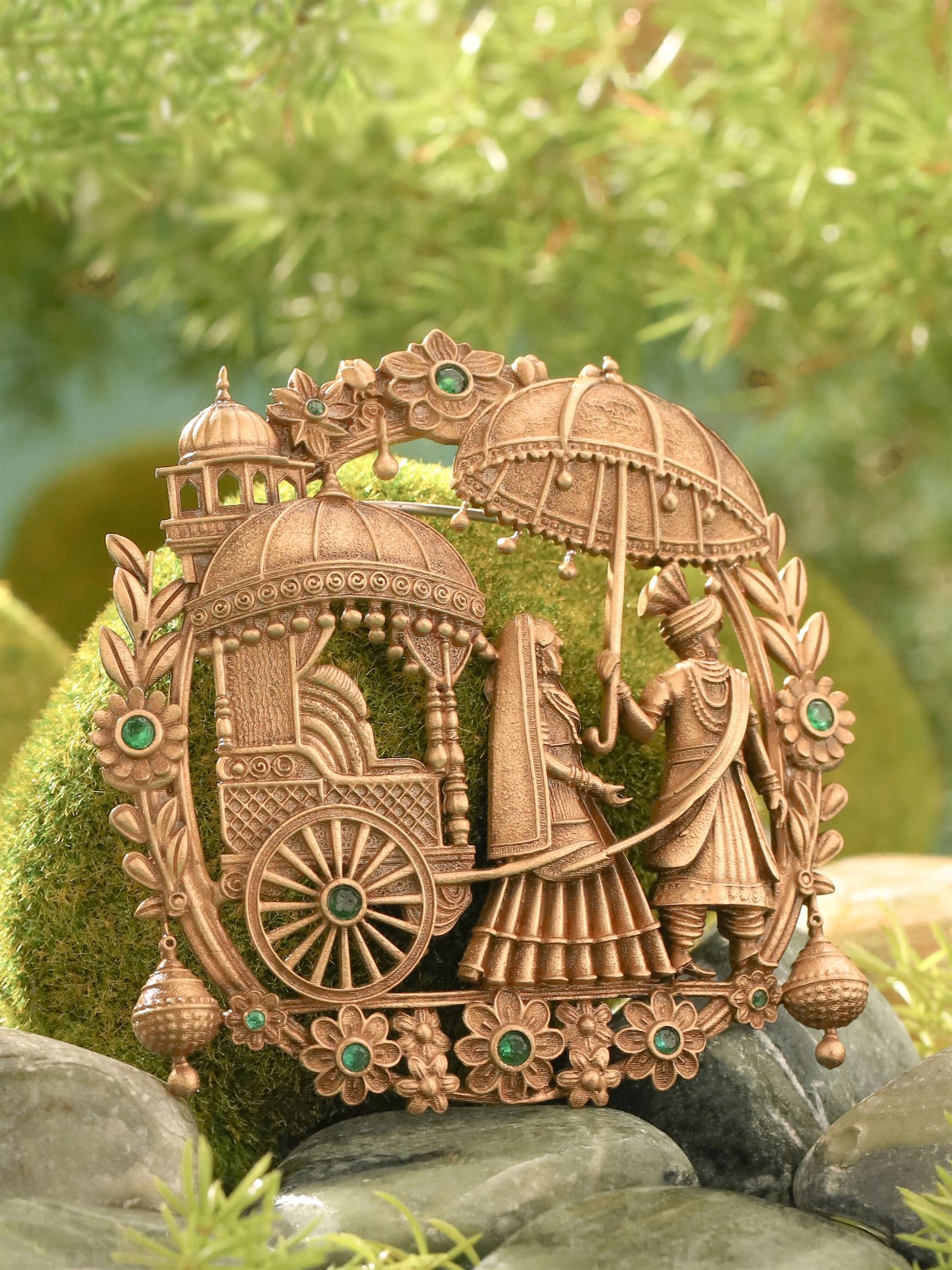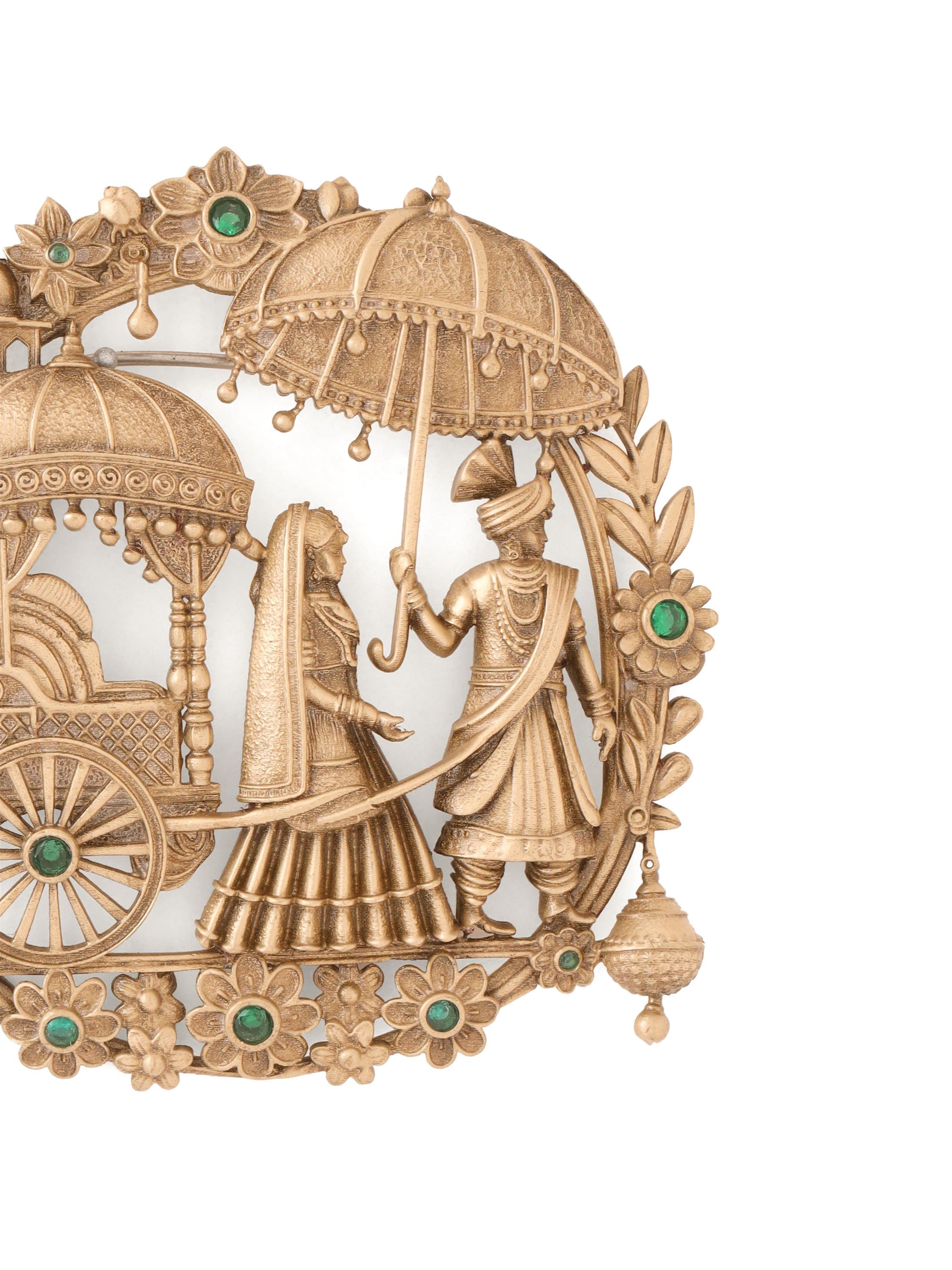 | Step into the grandeur of tradition with the Royal Wedding Procession Brooch. This intricately crafted, lightweight accessory captures the elegance of a regal wedding scene, complete with a beautifully adorned bride, a majestic chariot, and a noble groom holding an ornate parasol. Enhanced with emerald-like stones, this brooch is perfect for adding a touch of royal charm to your coat, jacket, or bandhagala, making it a standout piece for those who appreciate timeless cultural heritage. |