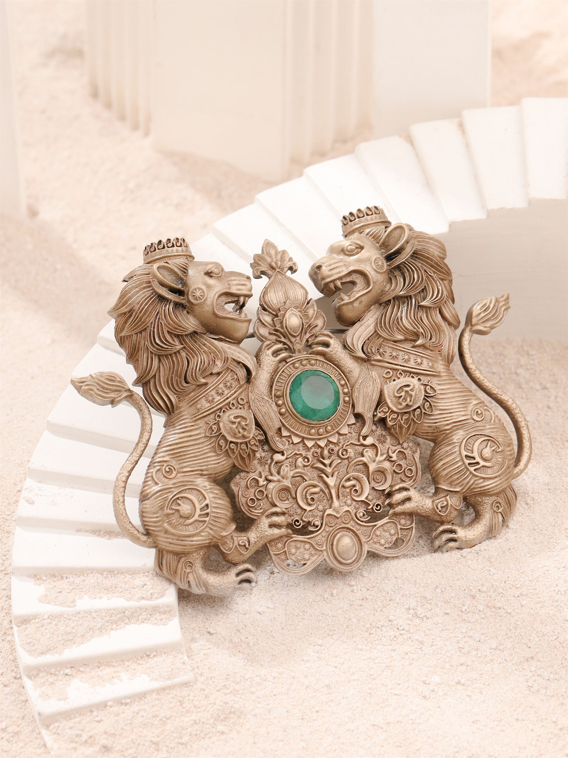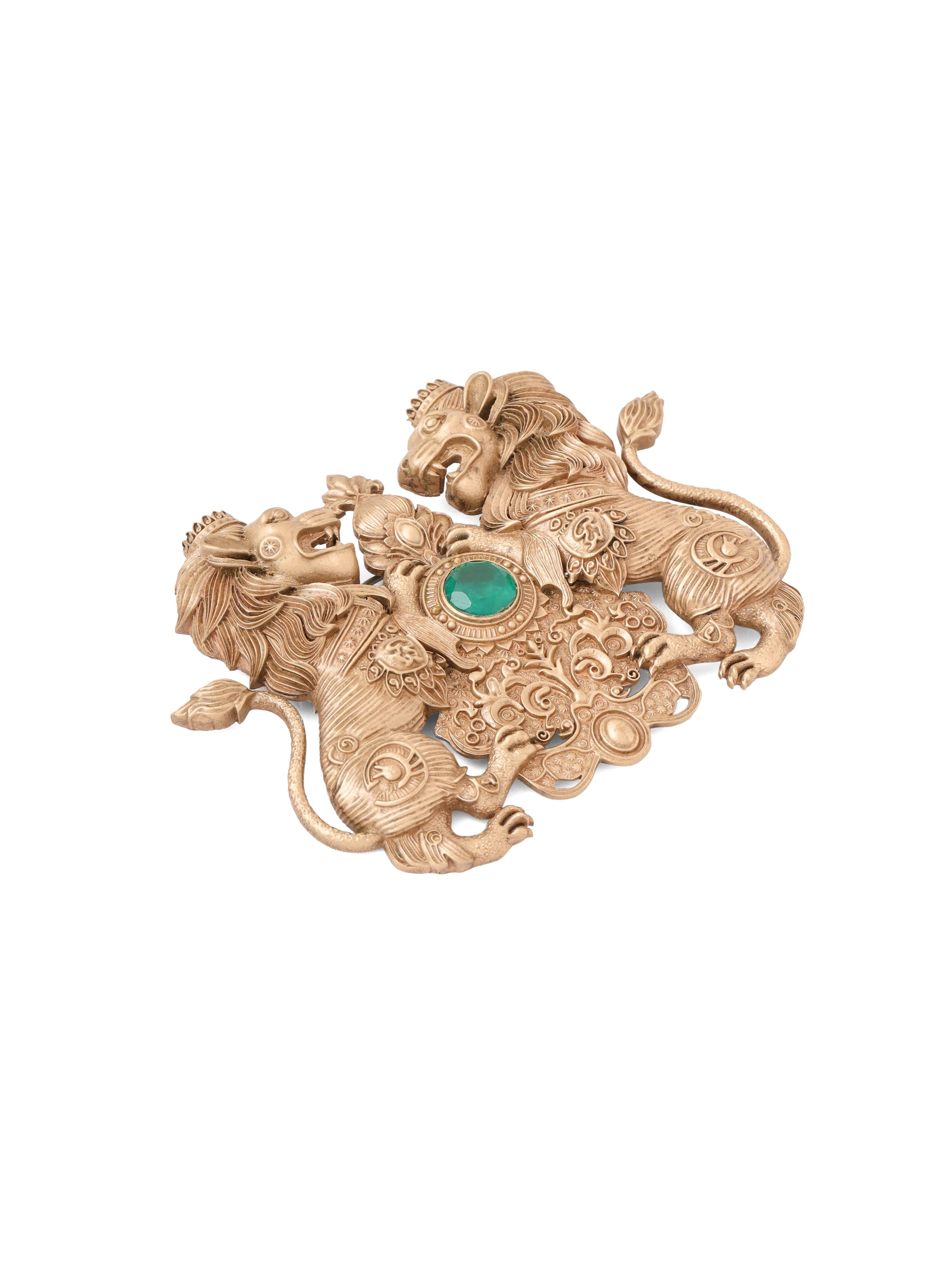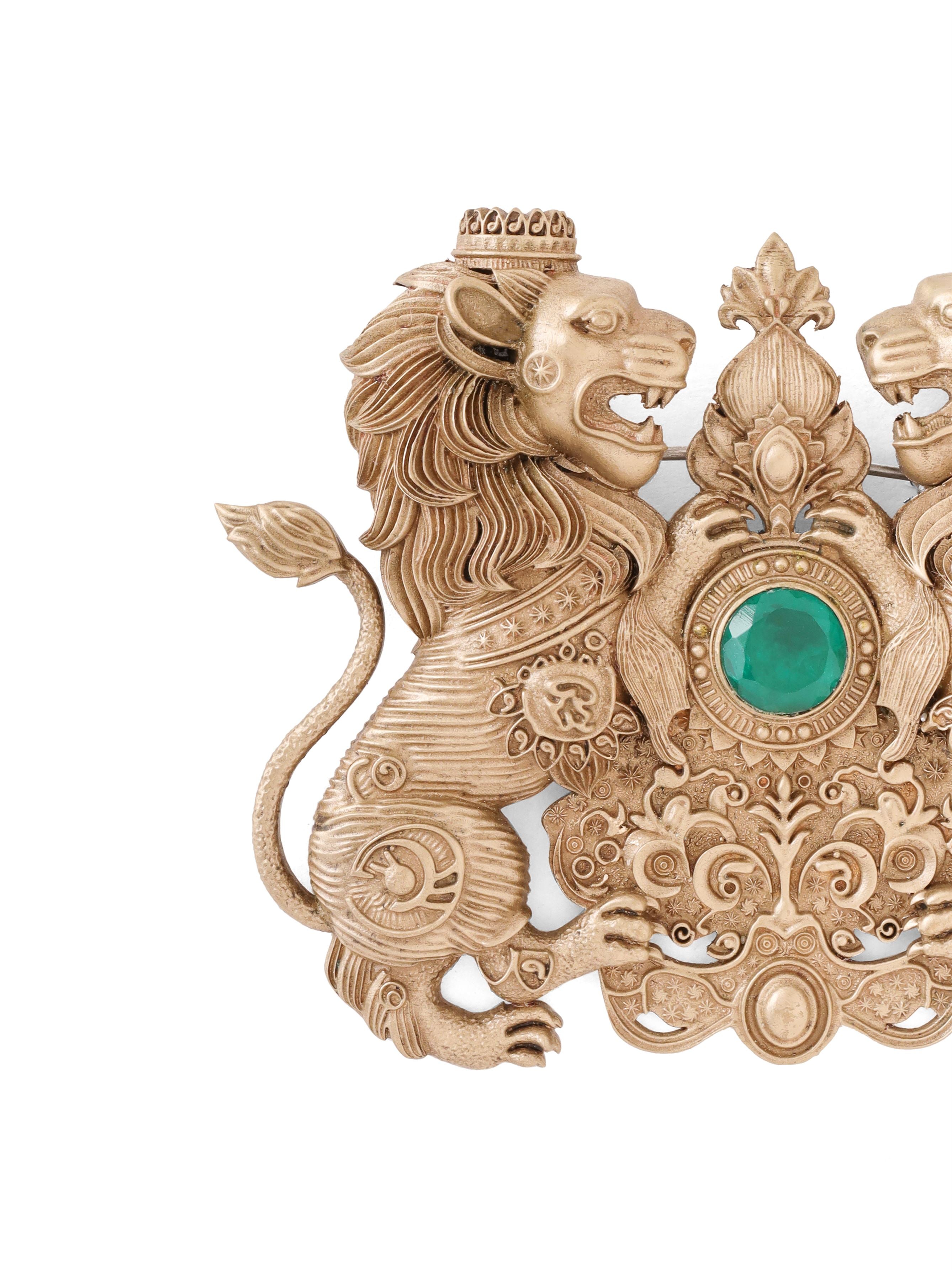 | Unleash your inner royalty with the Twin Lion Emblem Brooch, a symbol of strength, courage, and nobility. This intricately designed piece showcases two majestic lions guarding a central green gemstone, surrounded by ornate detailing that reflects timeless elegance. Lightweight and versatile, this brooch is perfect for adorning your coat, jacket, or bandhagala, adding a regal touch to your attire. Whether you're attending a formal event or simply elevating your everyday look, this brooch makes a bold statement of power and sophistication. |