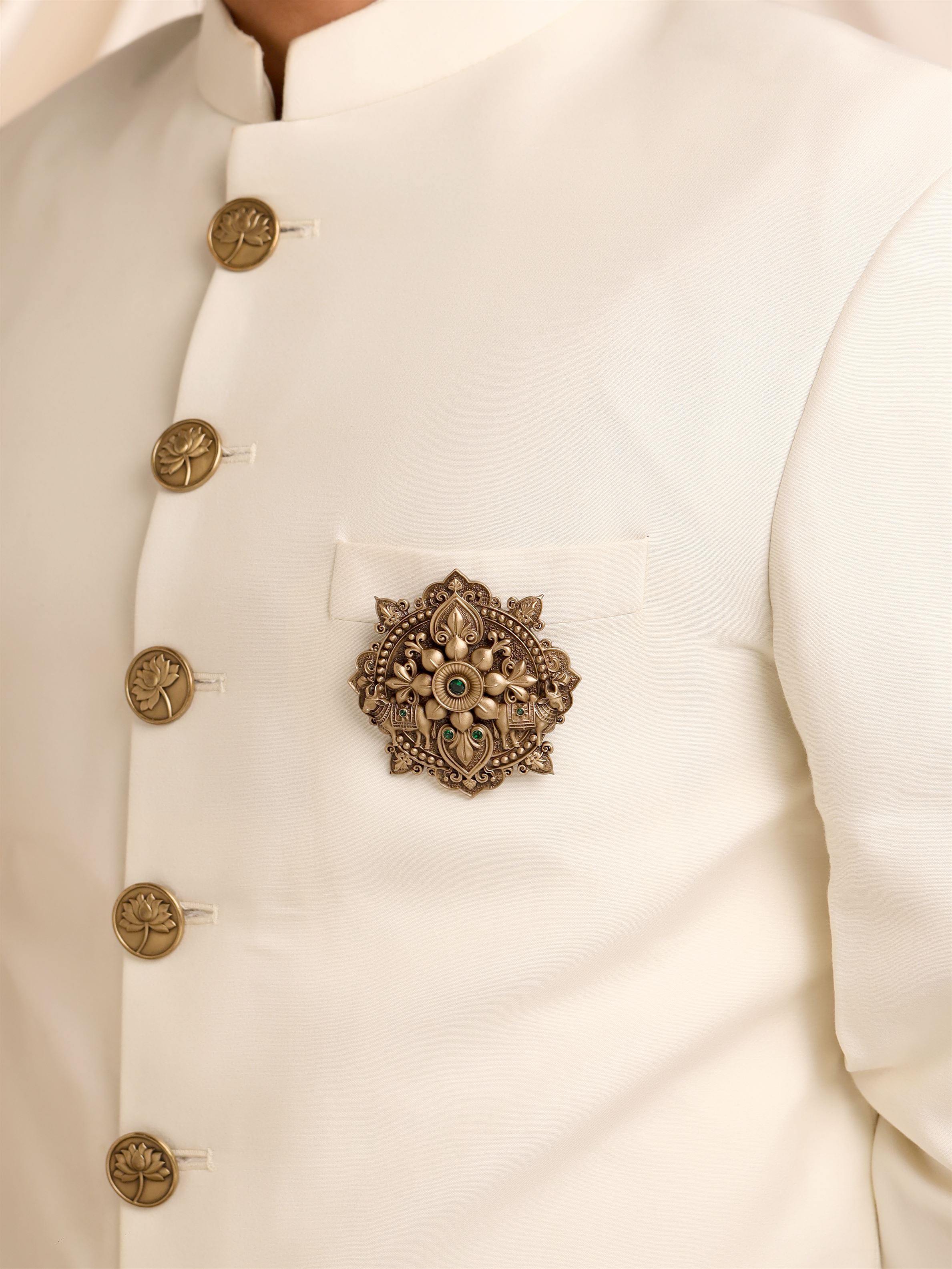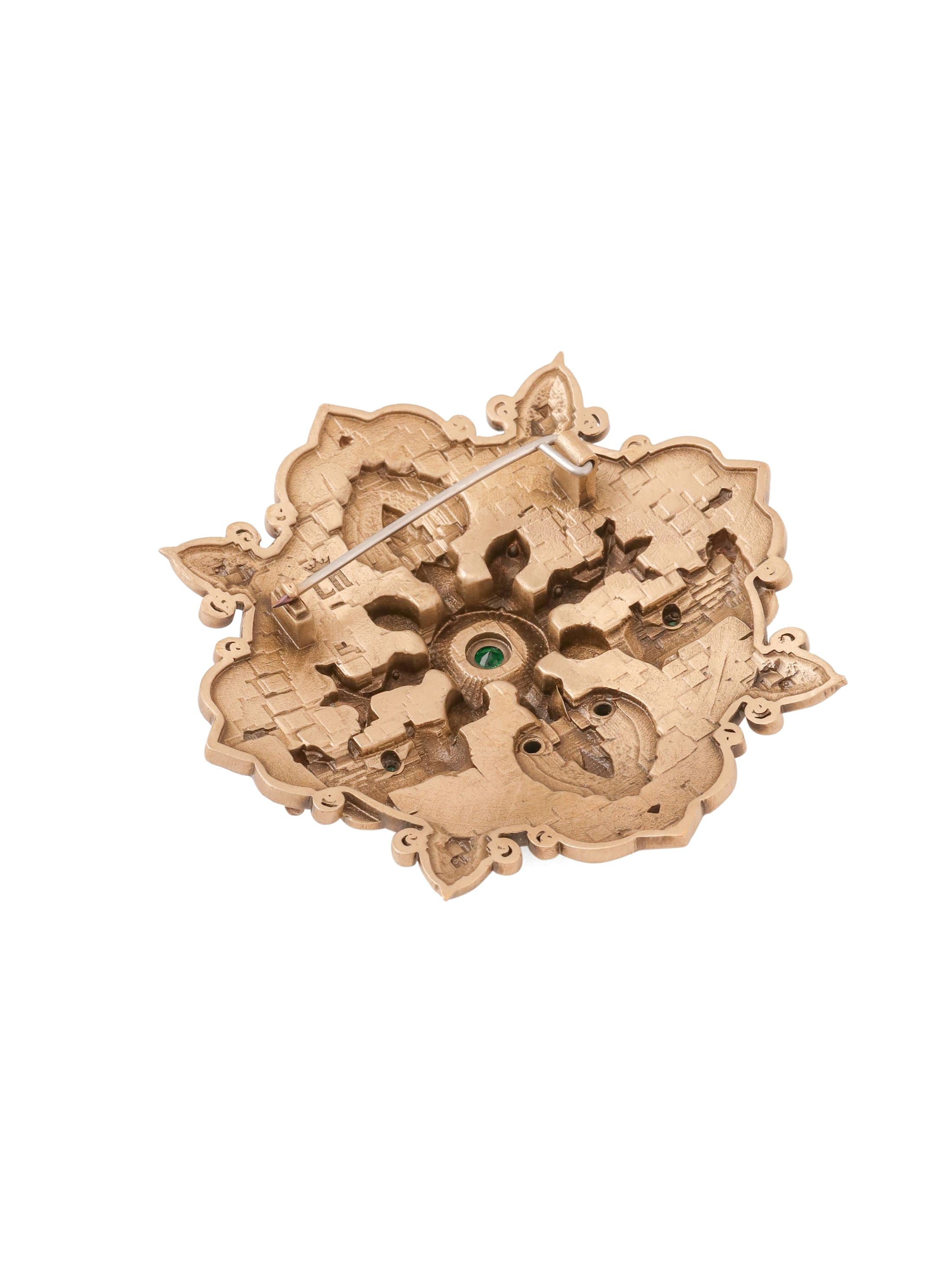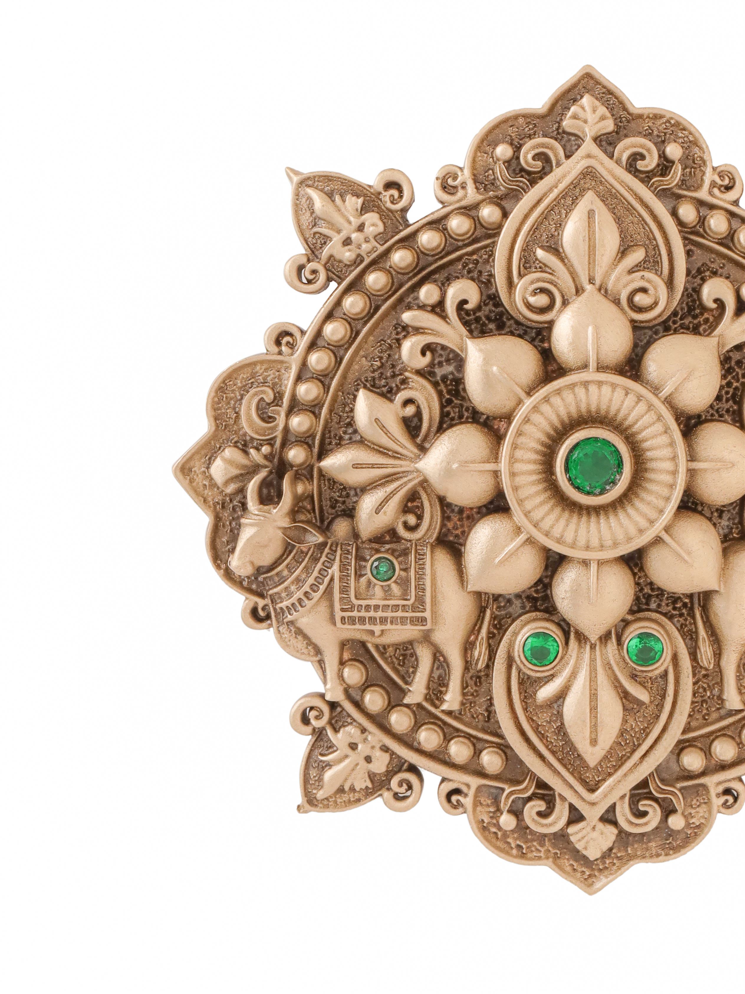 | Illuminate your ensemble with the Emerald Radiance Brooch, a captivating piece that showcases the elegance of ancient artistry. Adorned with lush green gemstones set within a radiant floral design, and flanked by intricately detailed sacred bulls, this brooch is a testament to timeless luxury and cultural richness. The lightweight construction ensures comfort, making it a perfect accessory for coats, jackets, and bandhagalas. Whether for a grand celebration or a special occasion, the Emerald Radiance Brooch adds a touch of opulence and tradition to your look. |