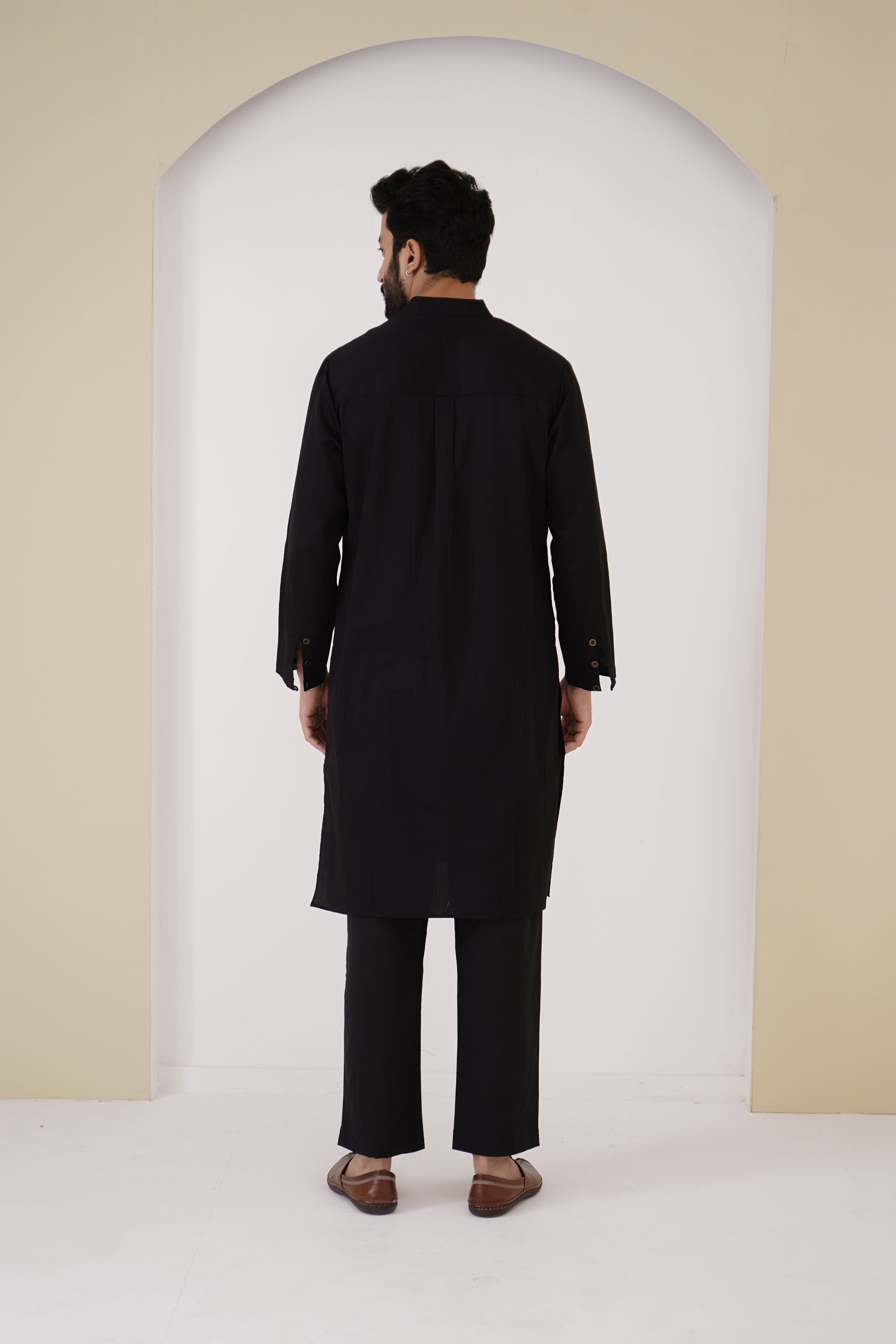 -Men's kurta in Black Cotton Satin fabric with full length sleeves.