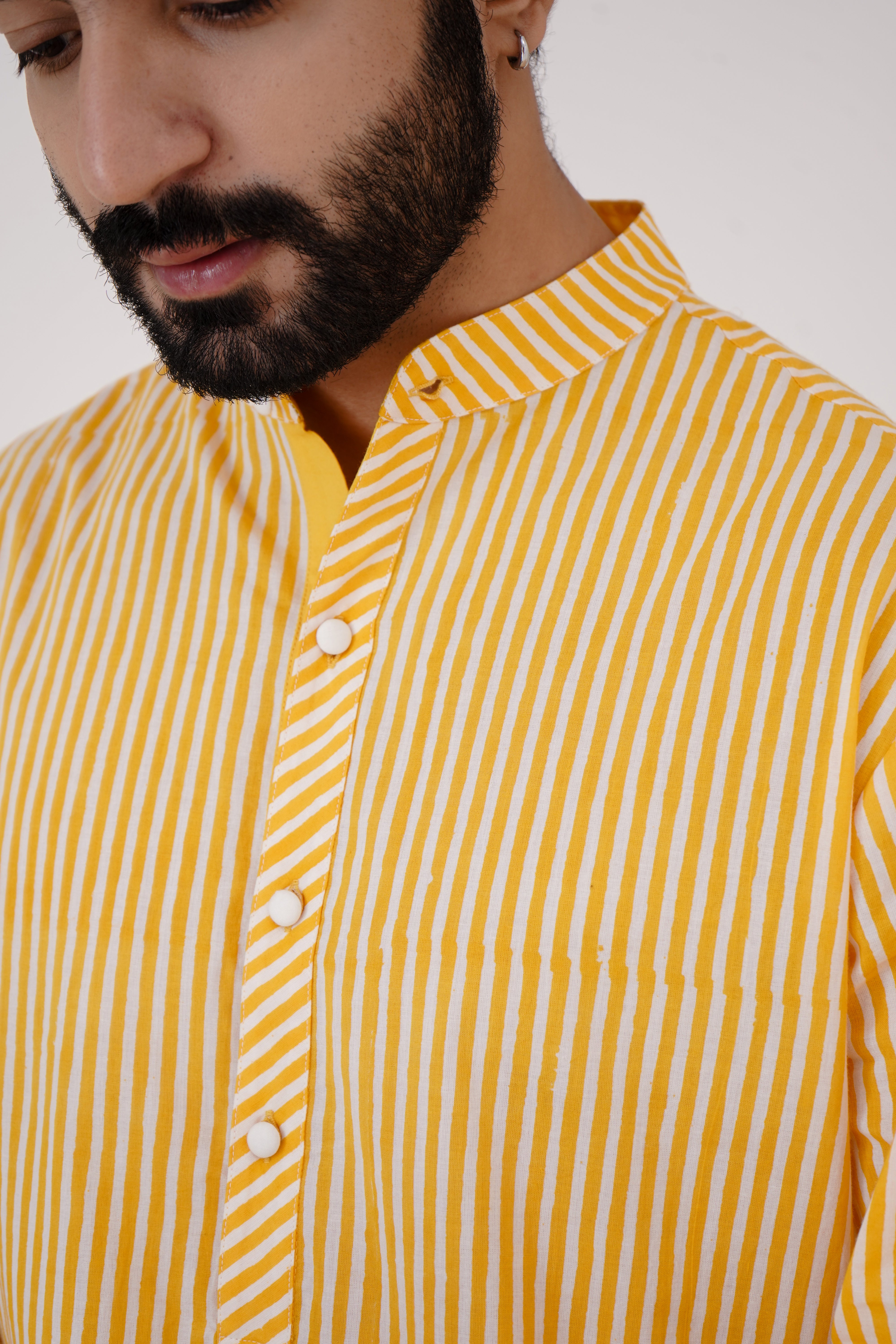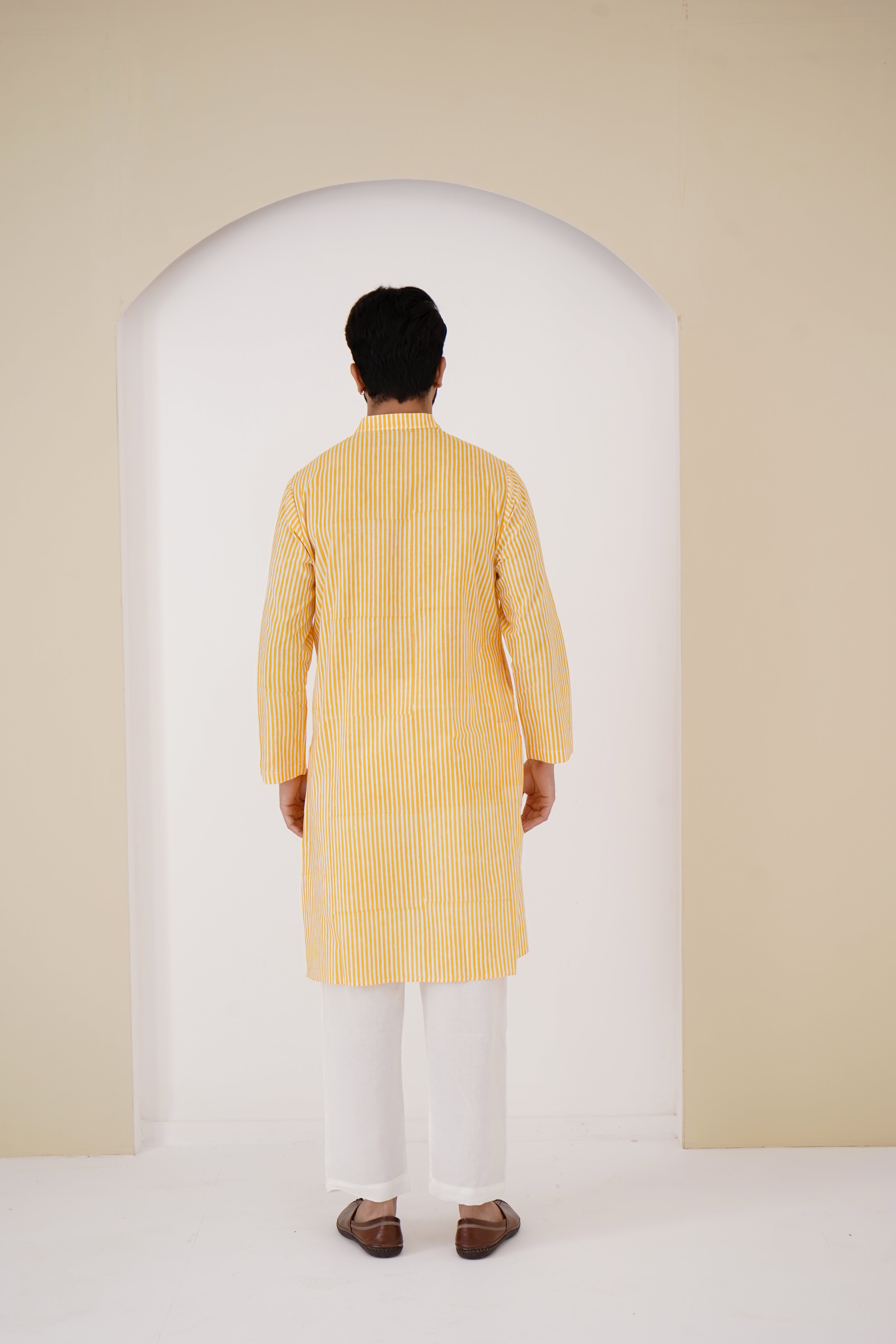 -Men's kurta in Hand Block Printed Stripe Cotton fabric with full length sleeves.
