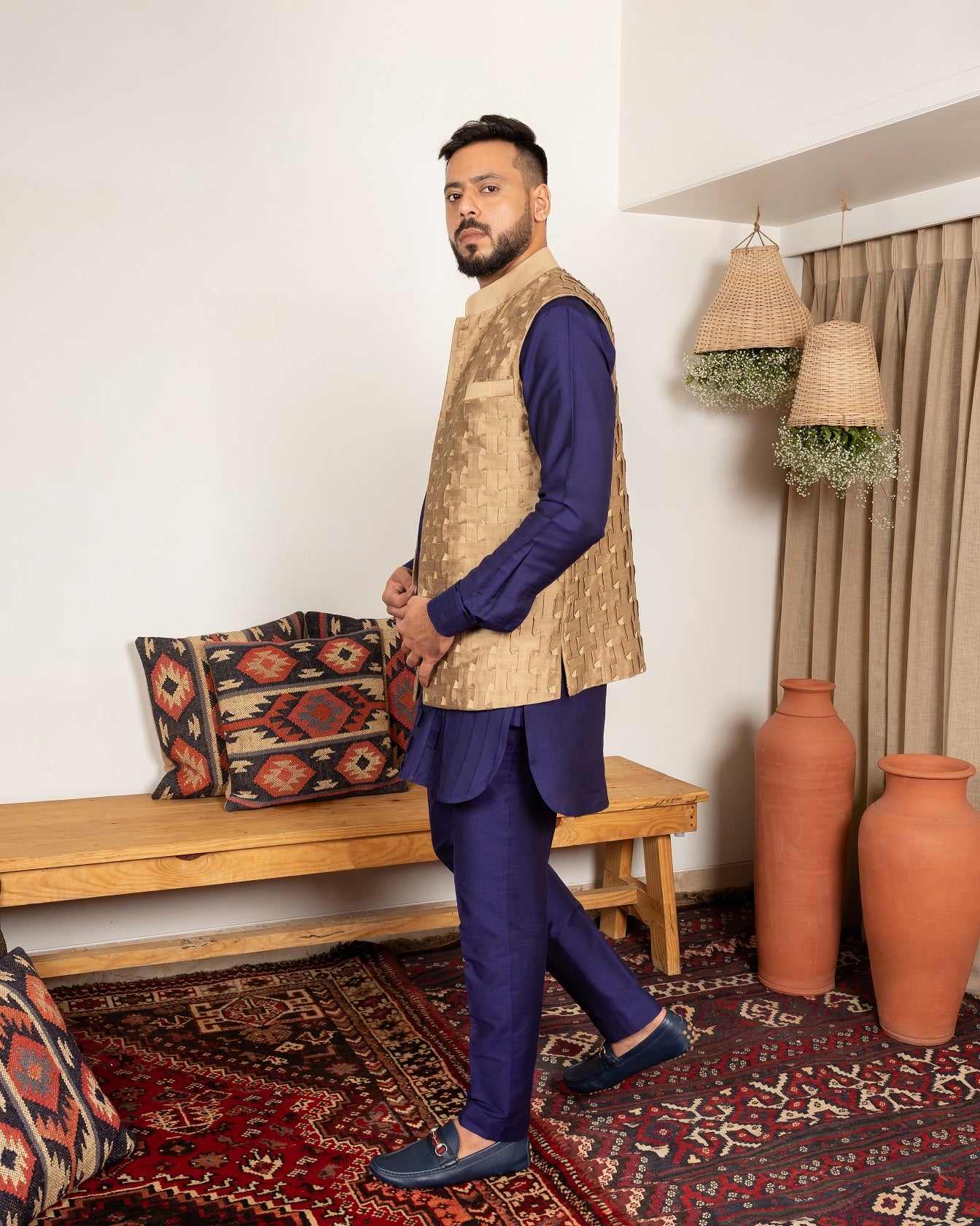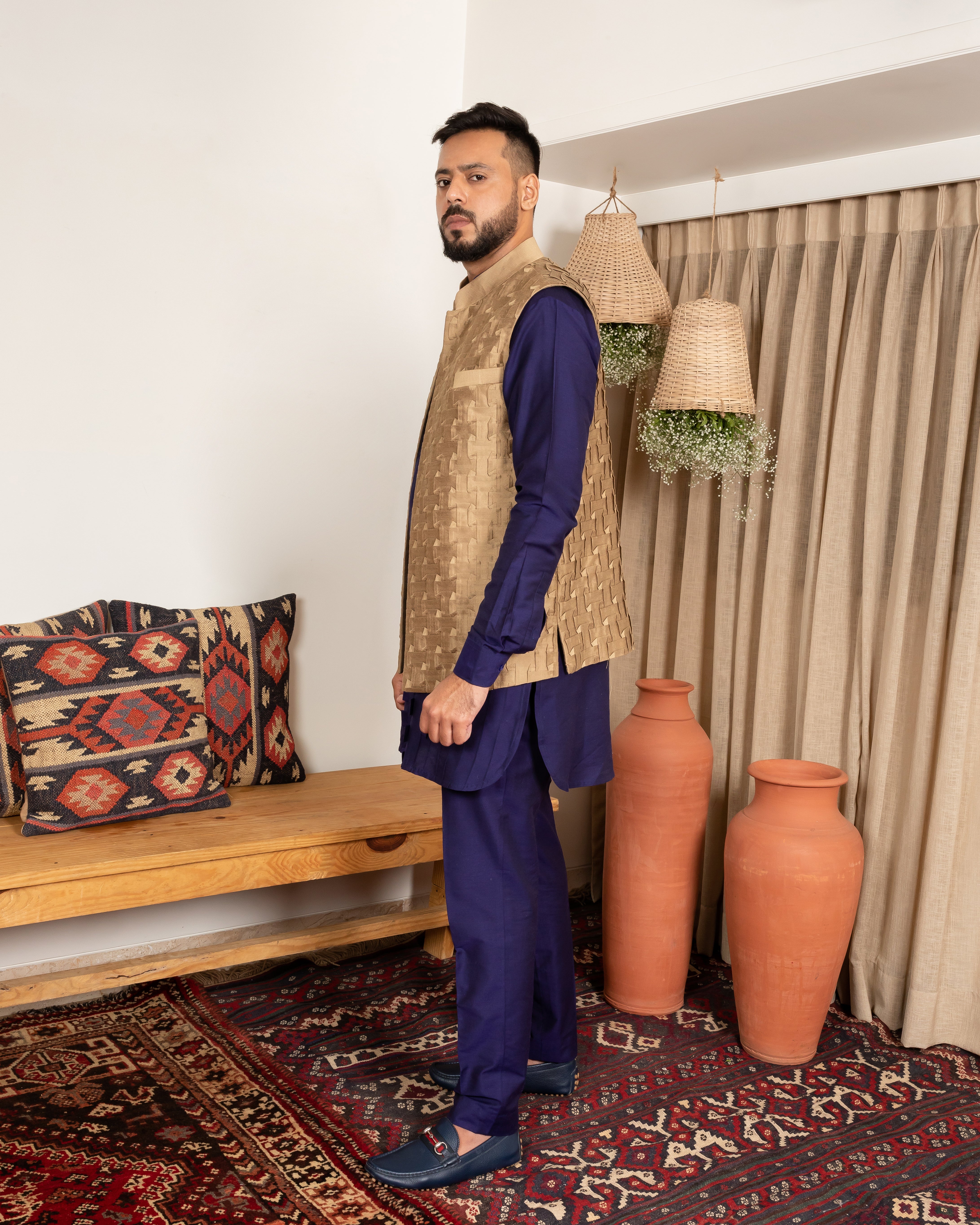 Featuring a gold silk Bandi Jacket. It has a textured fabric.