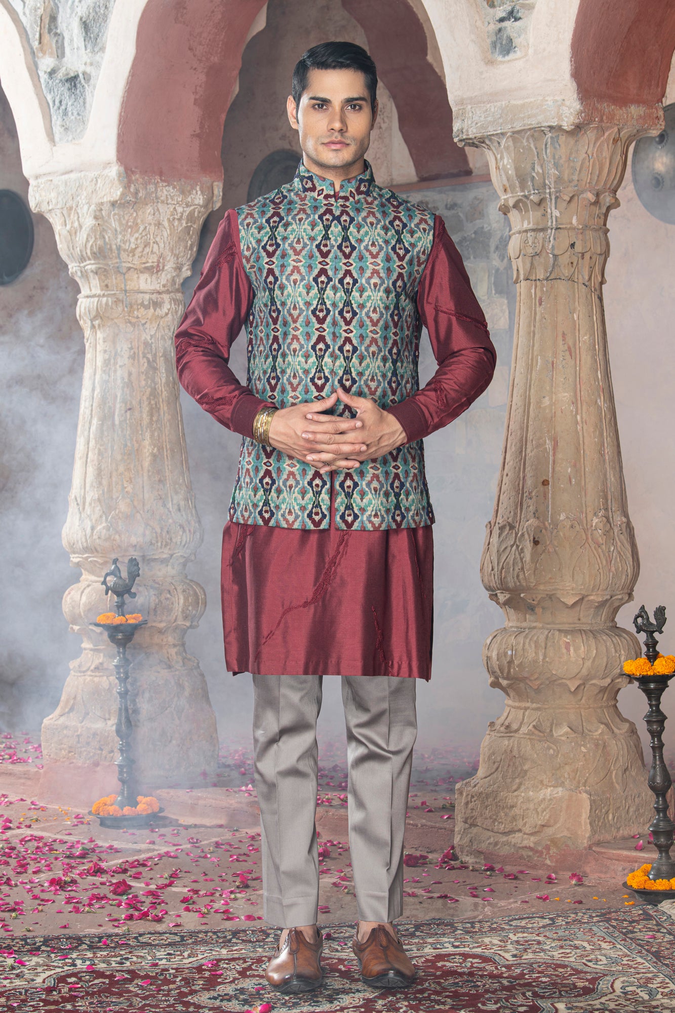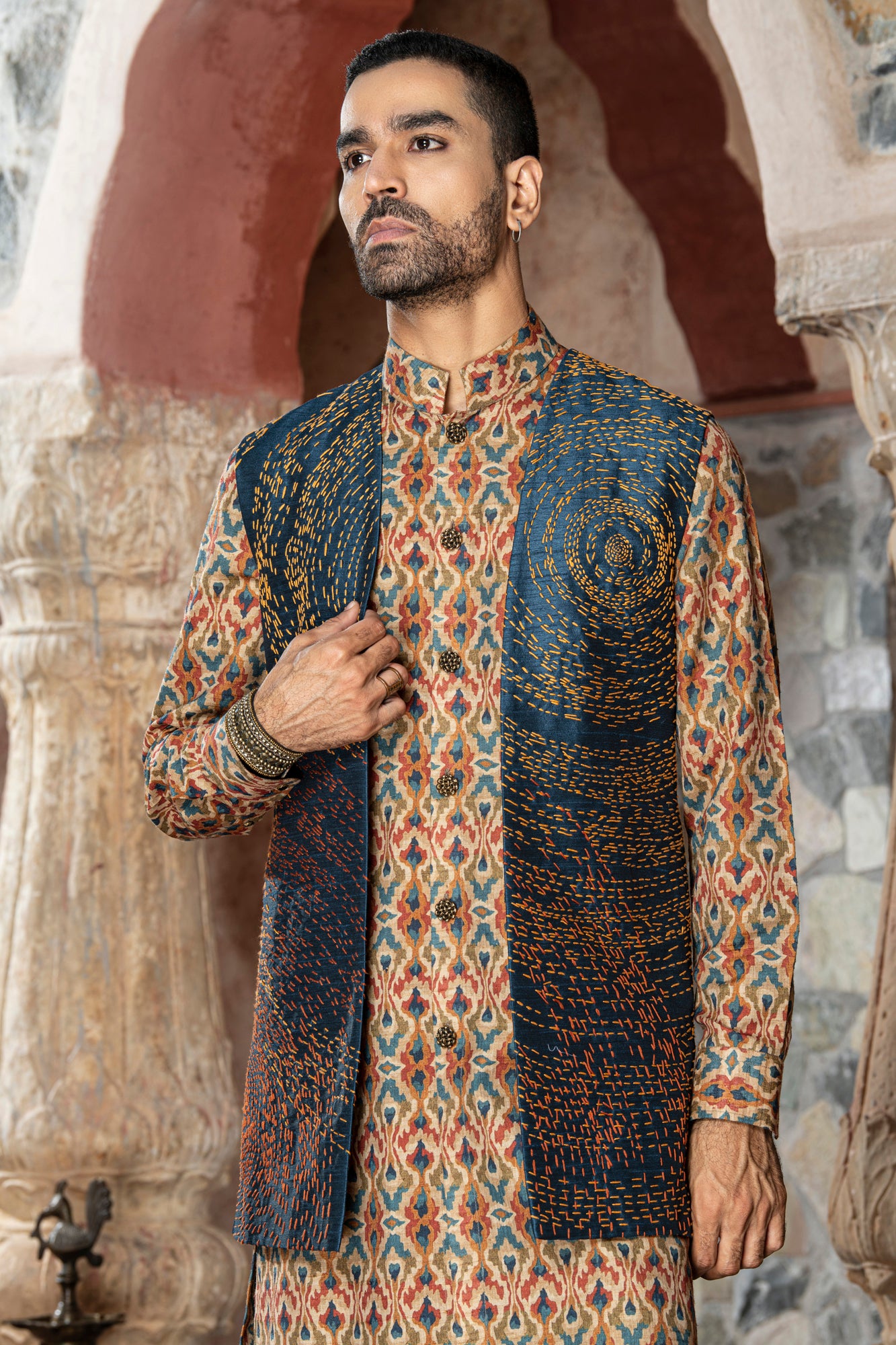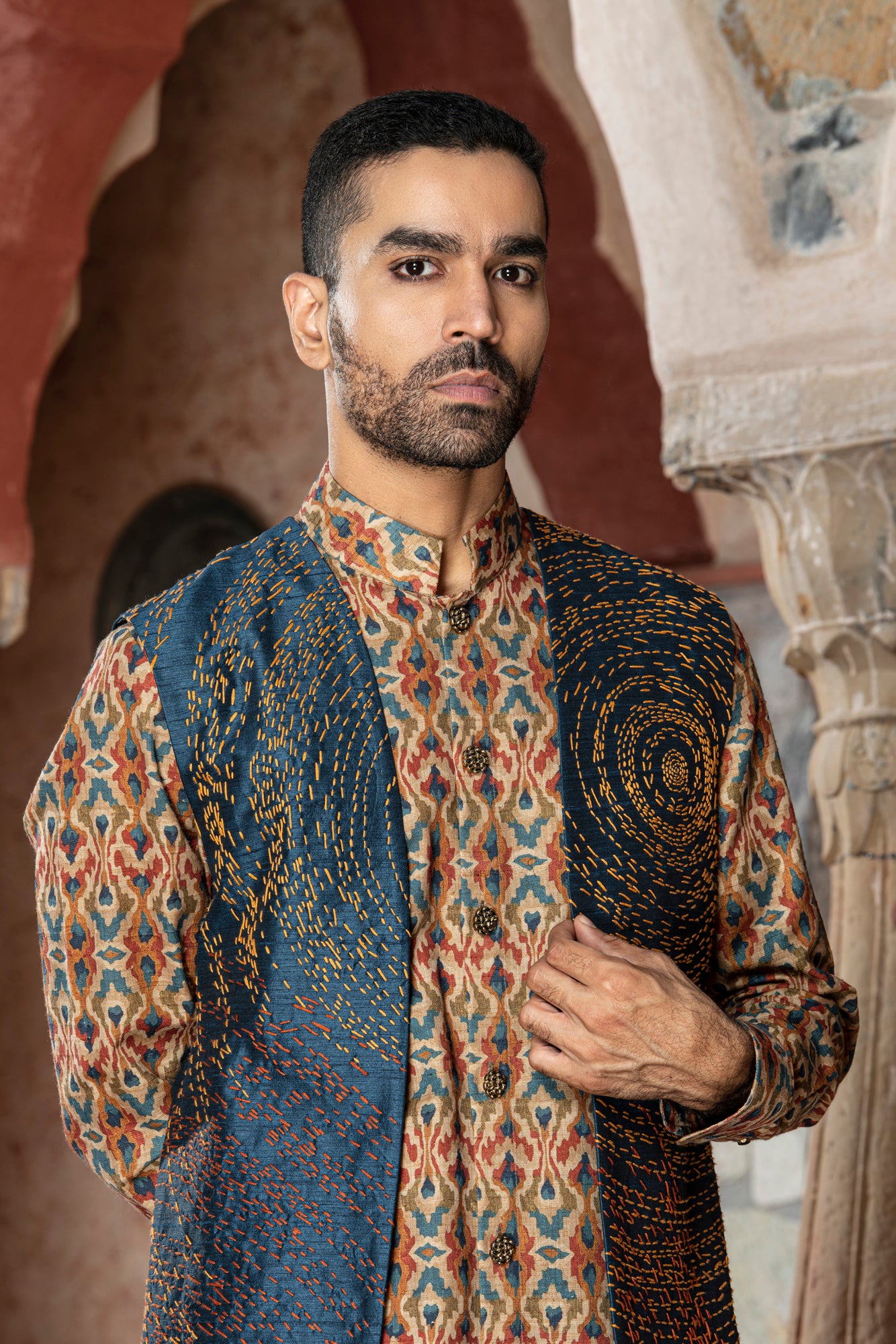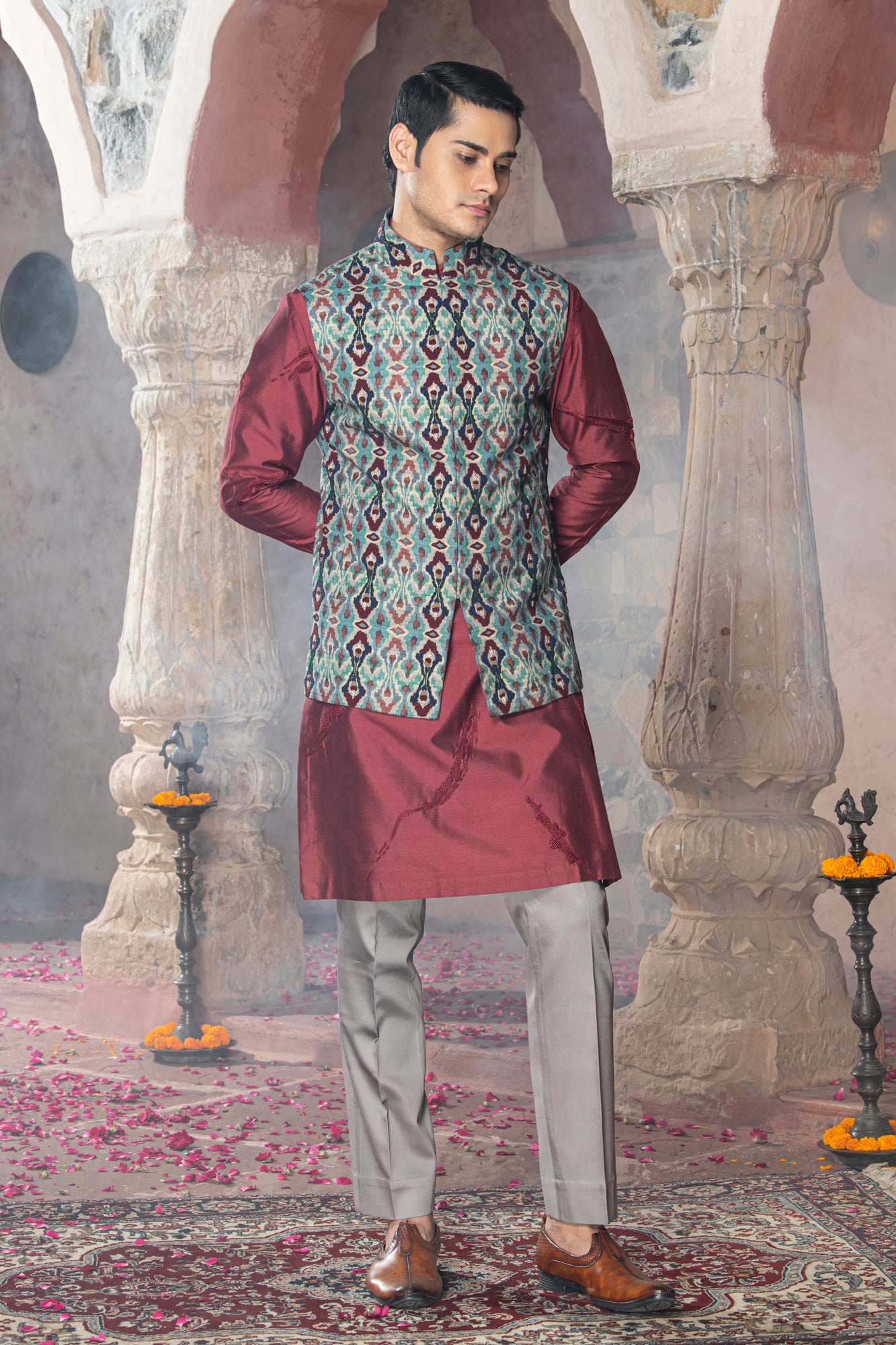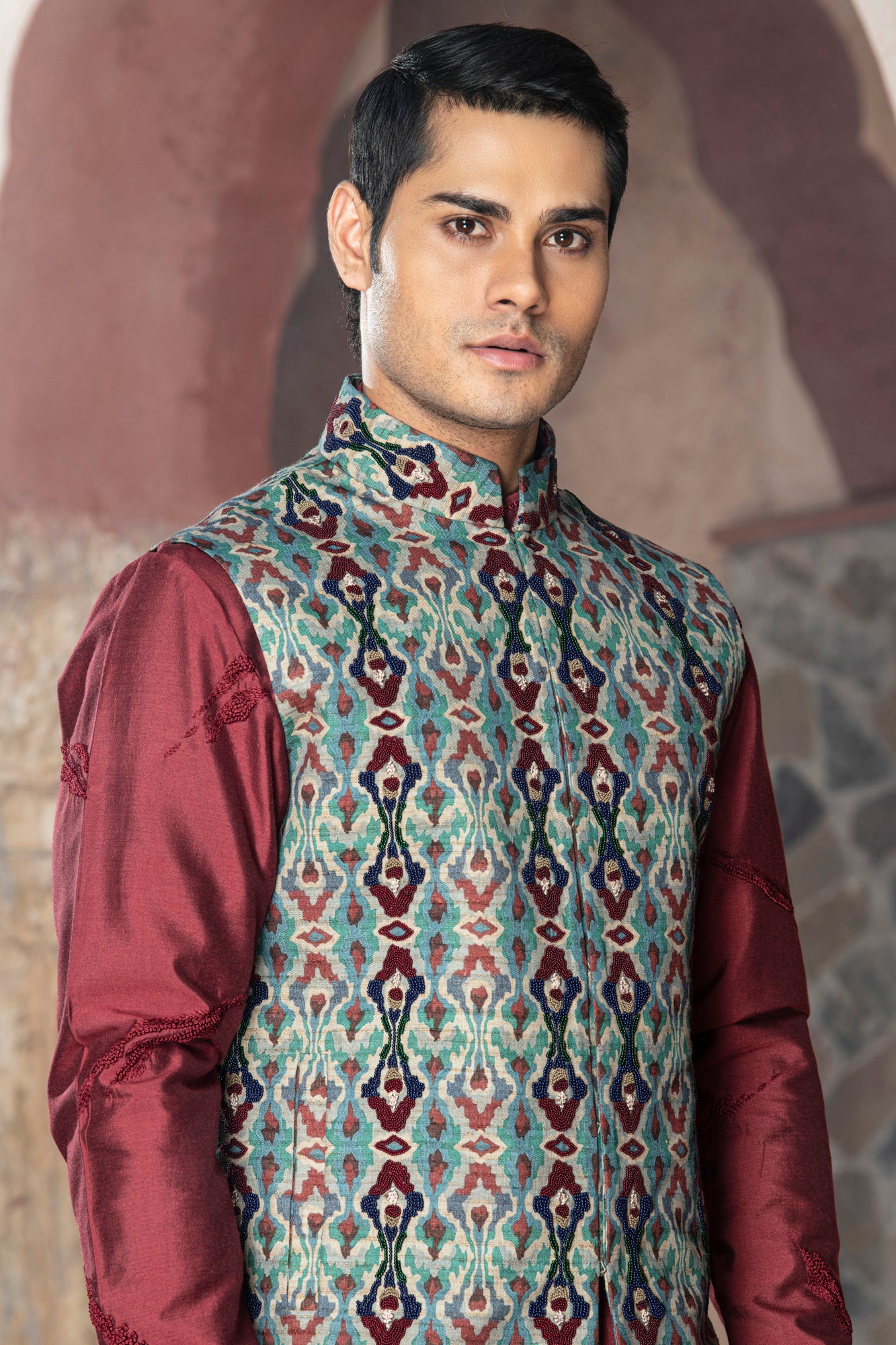 Multi-colored silk dupion printed & embroidered nehru jacket