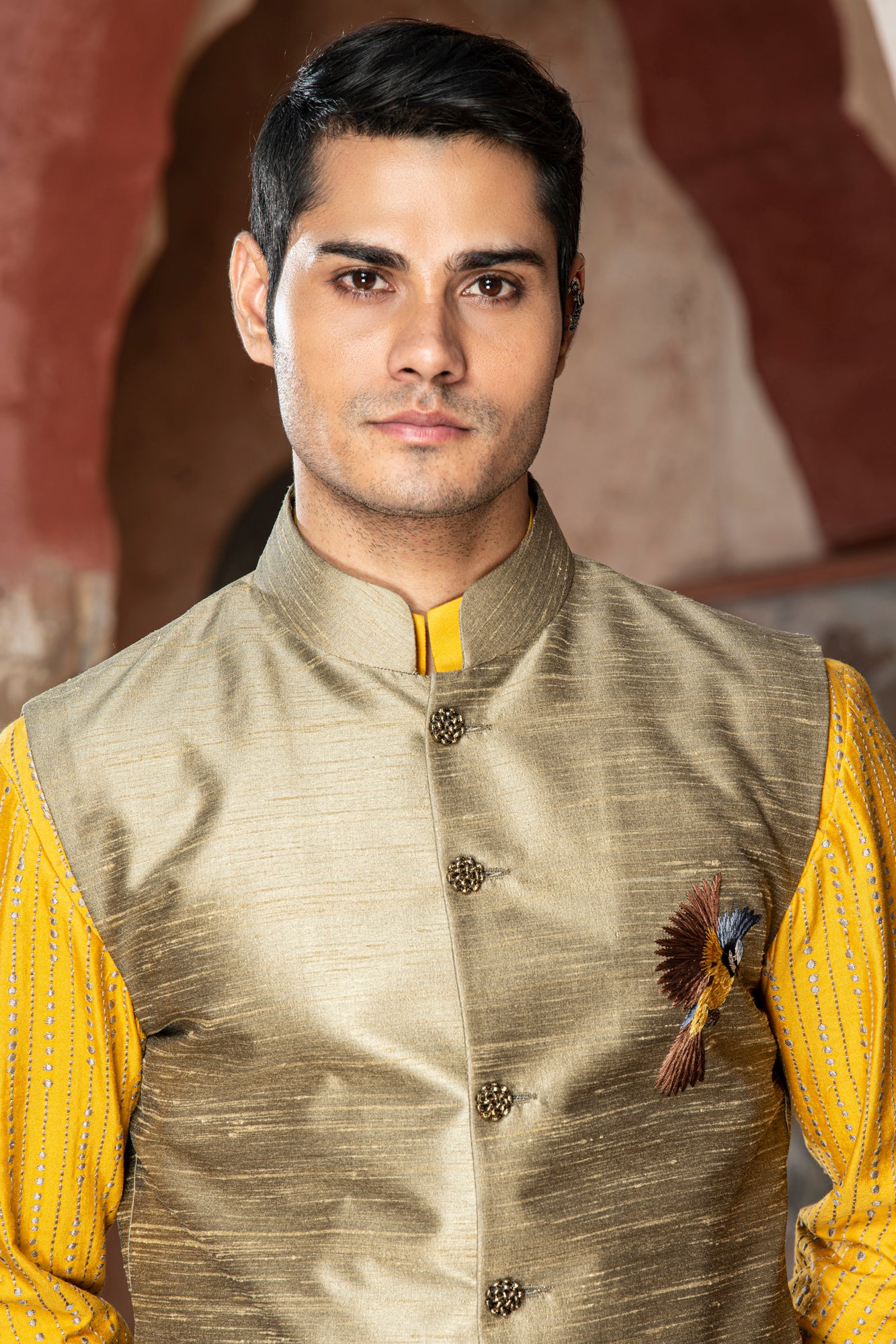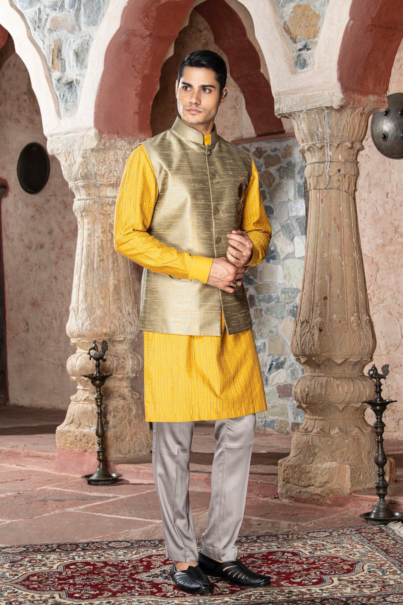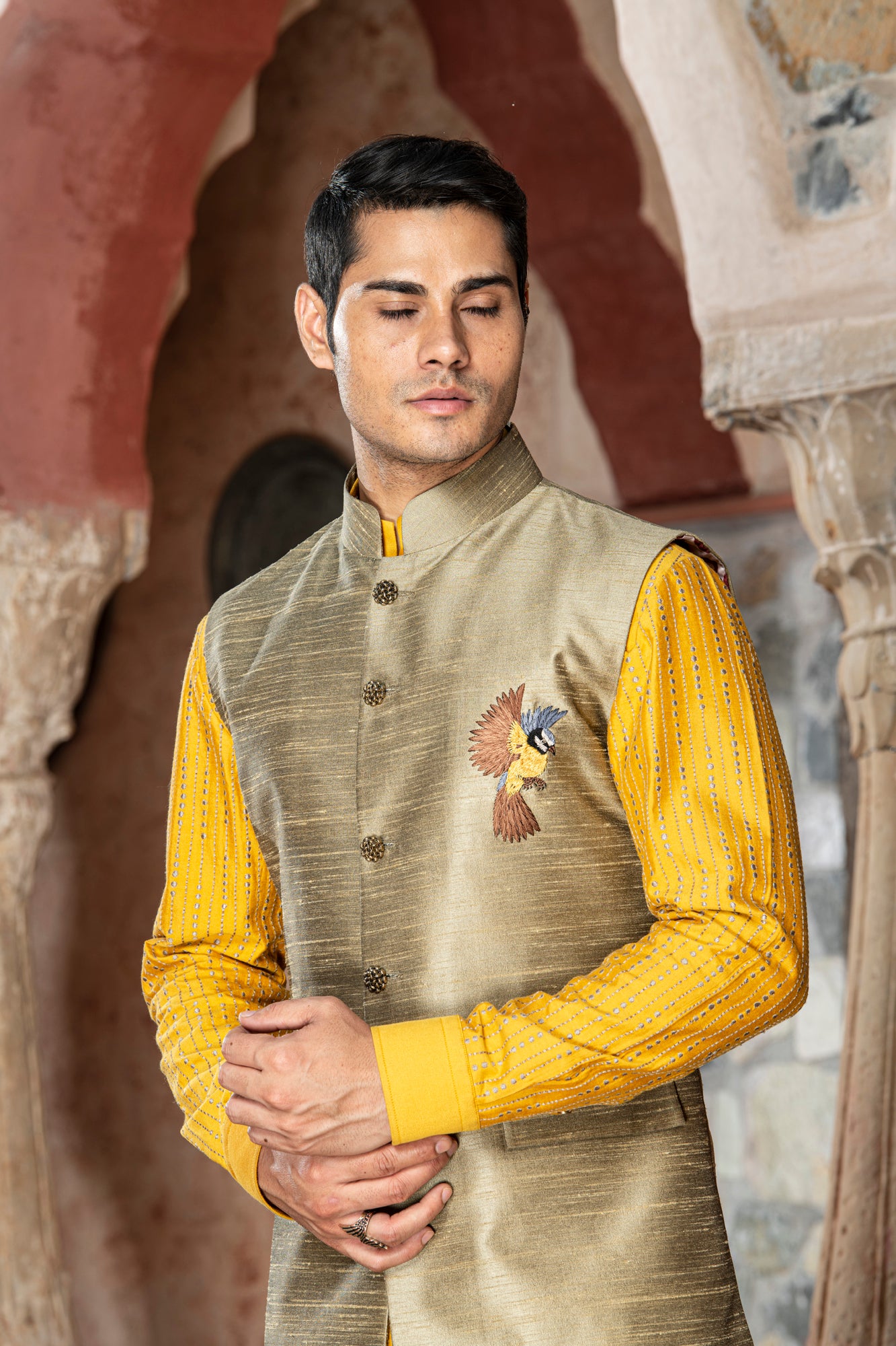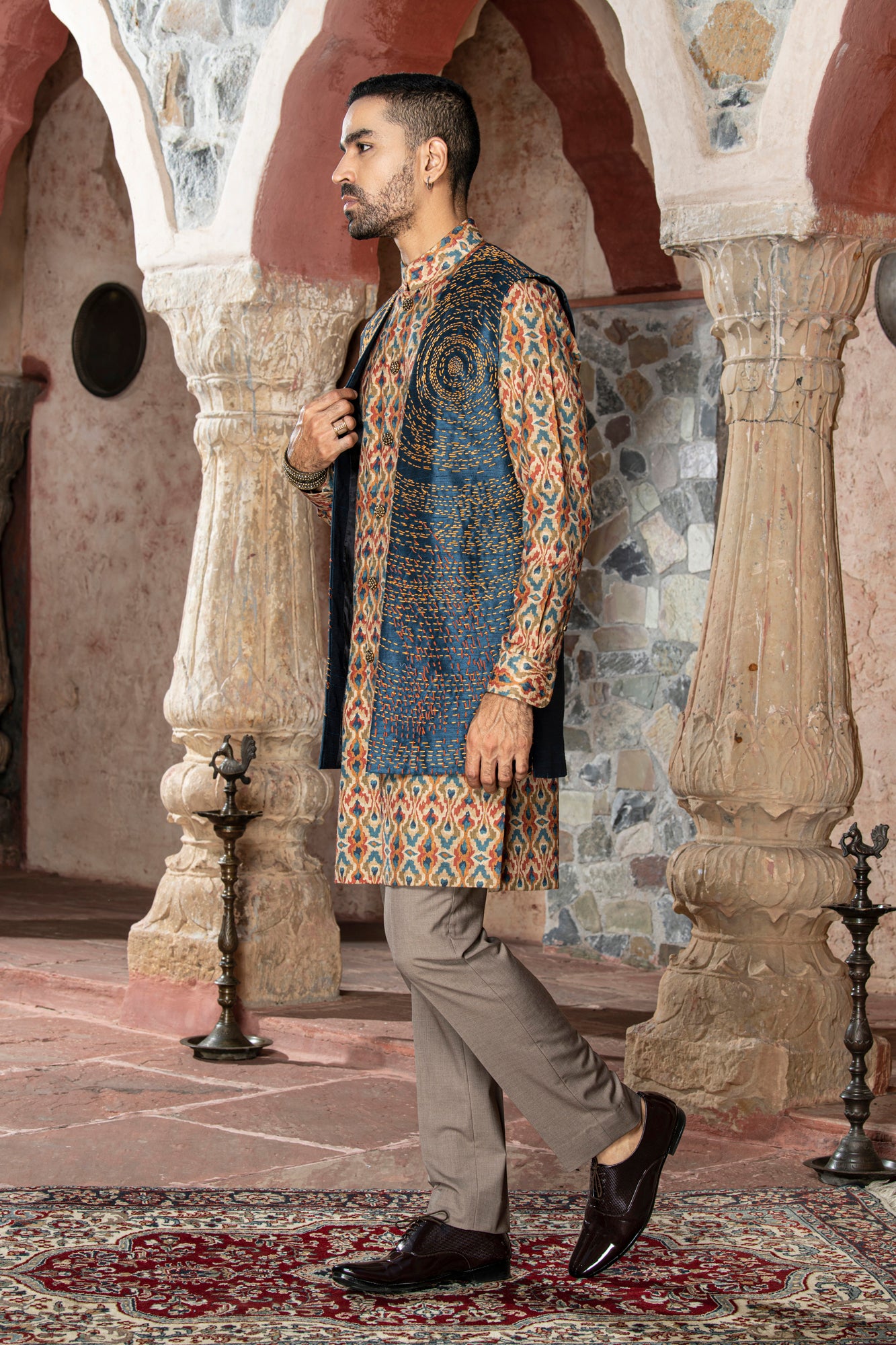 Multi-colored silk dupion printed & embroidered nehru jacket