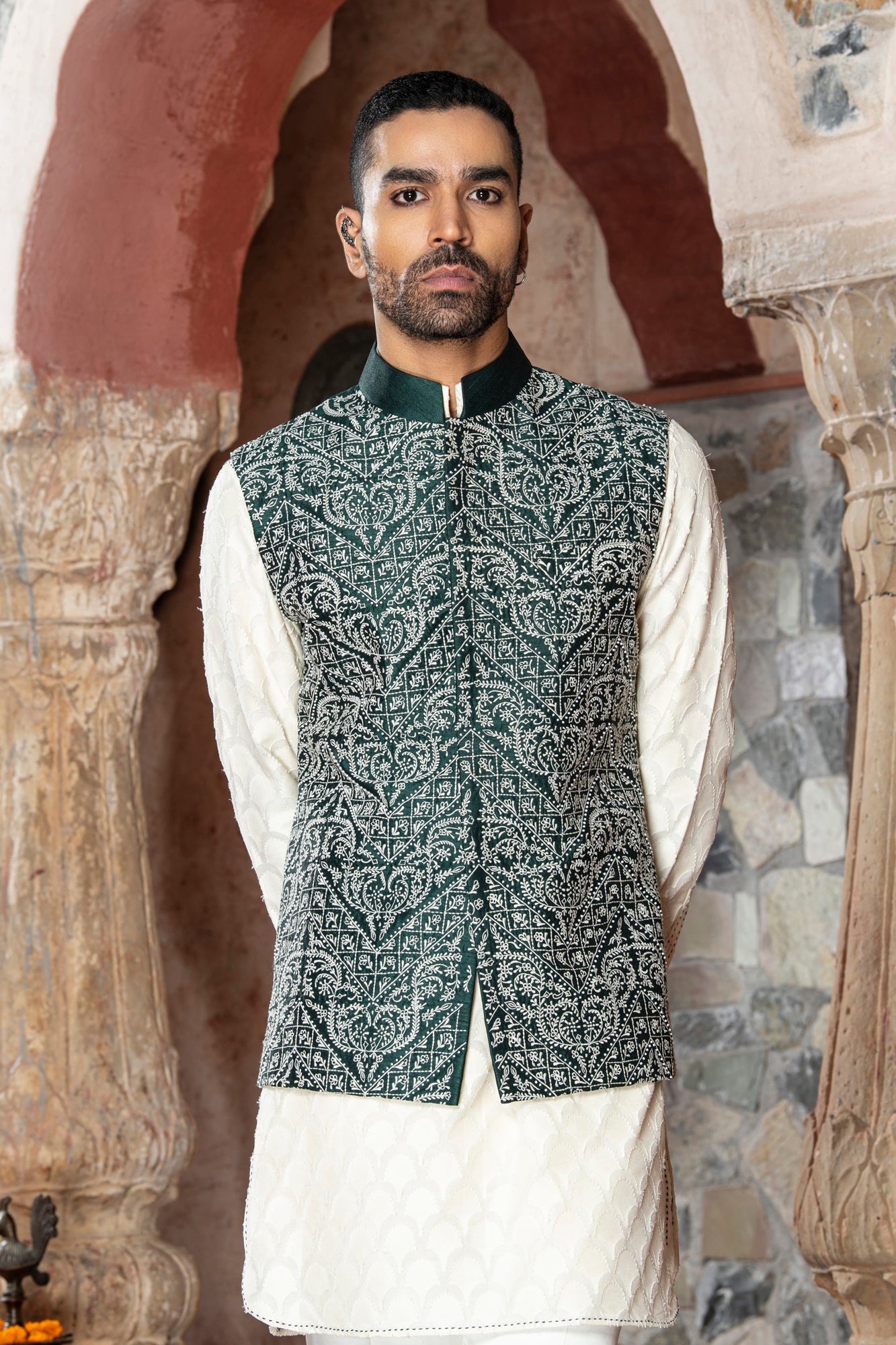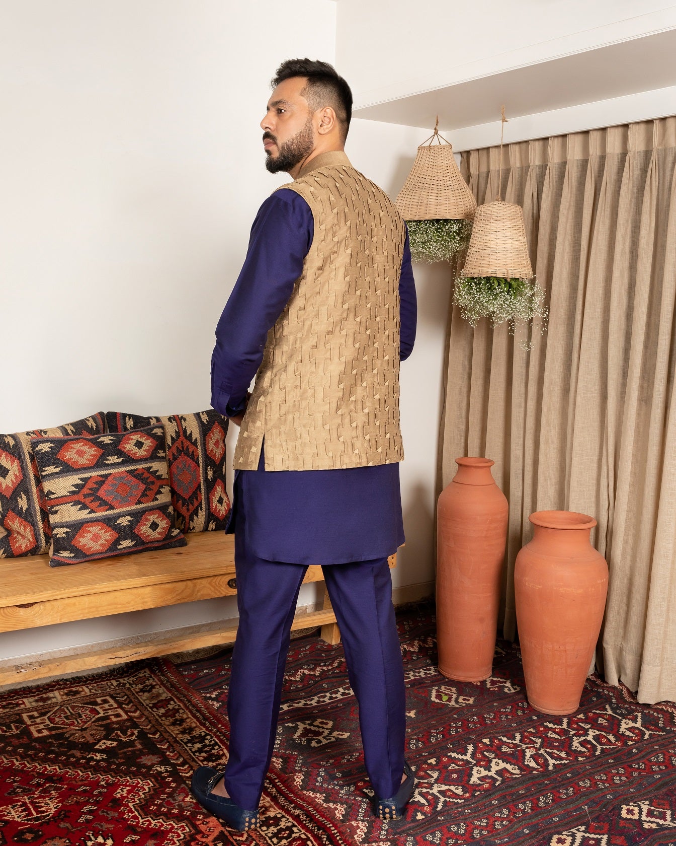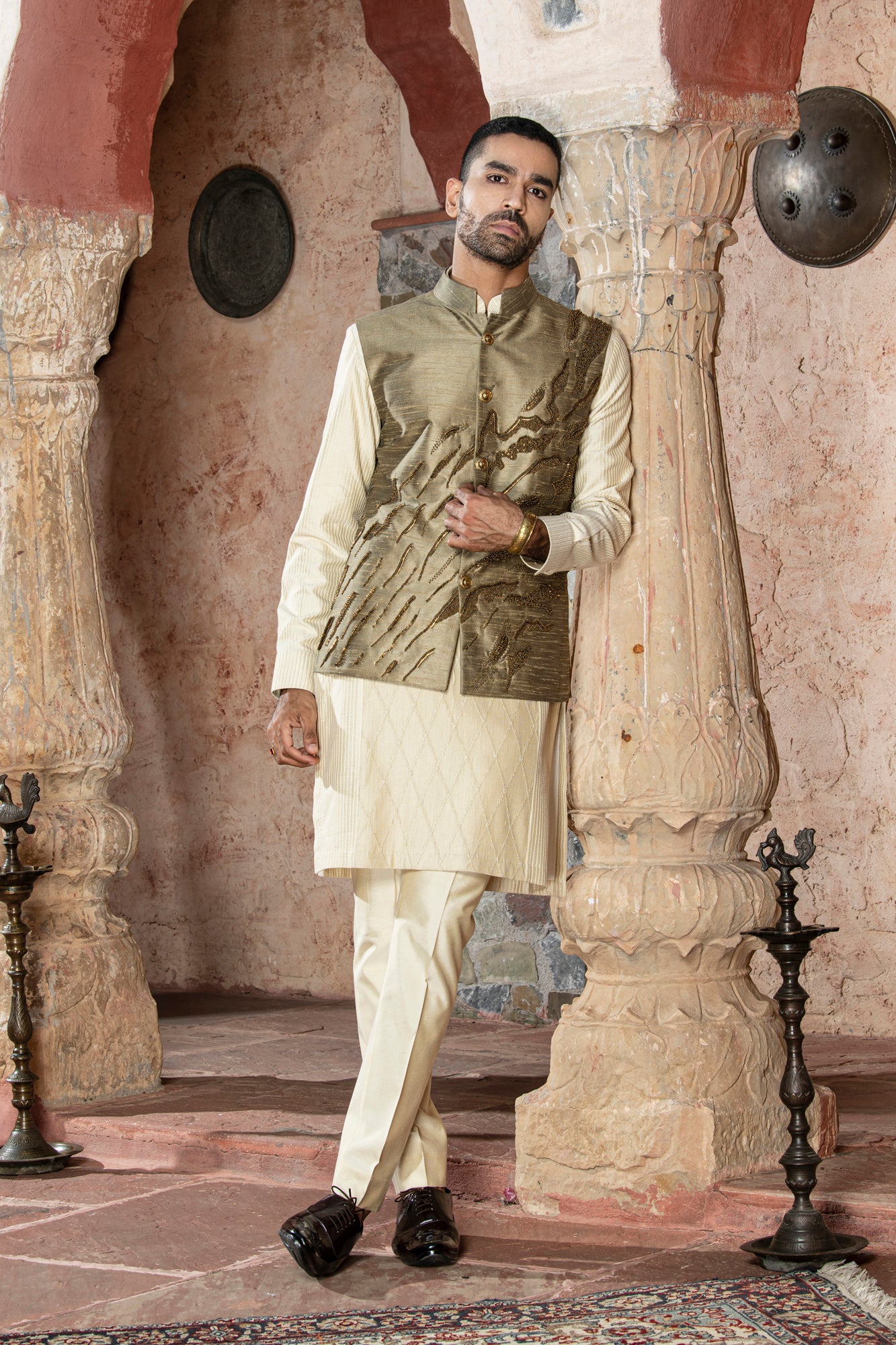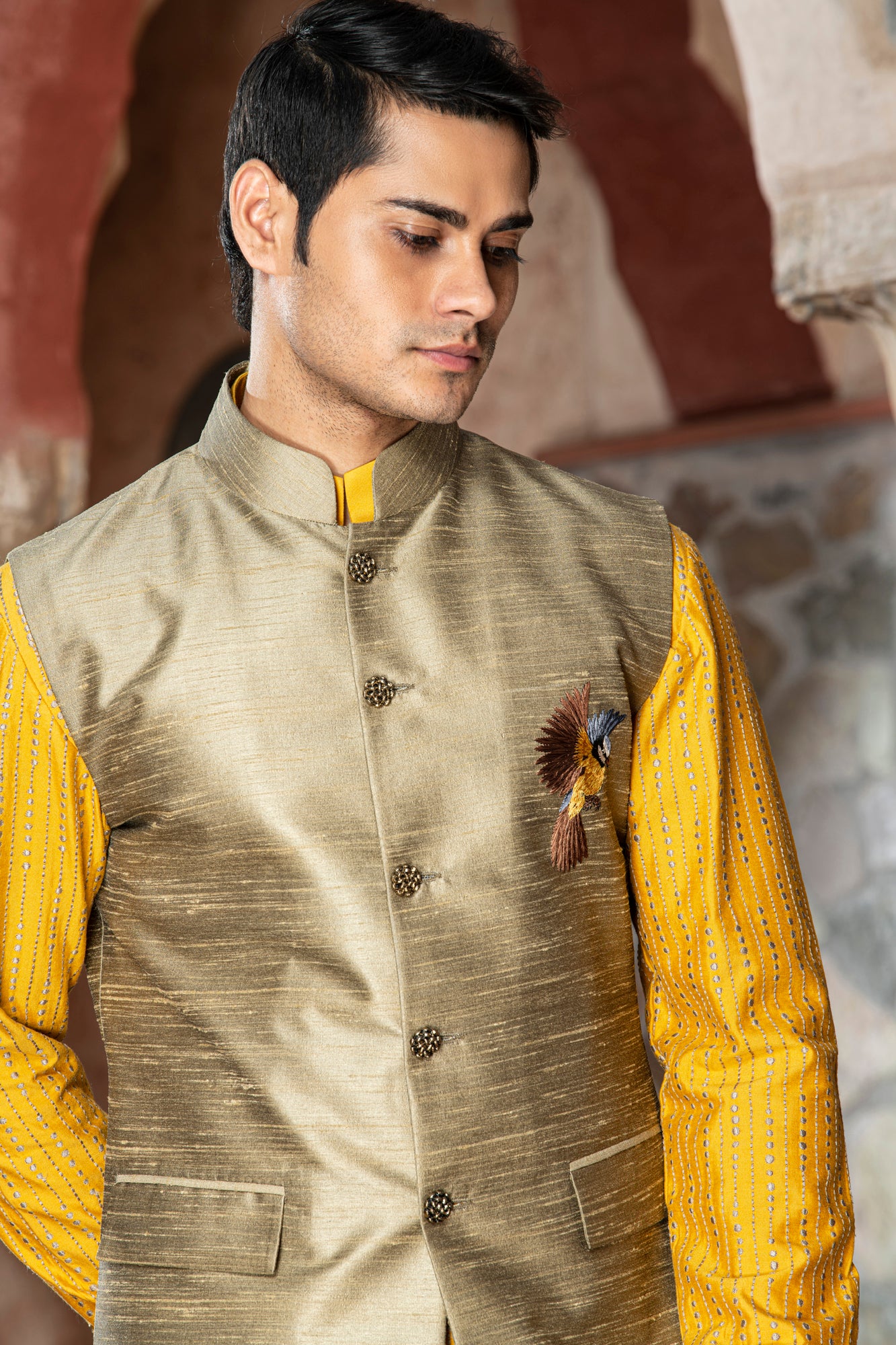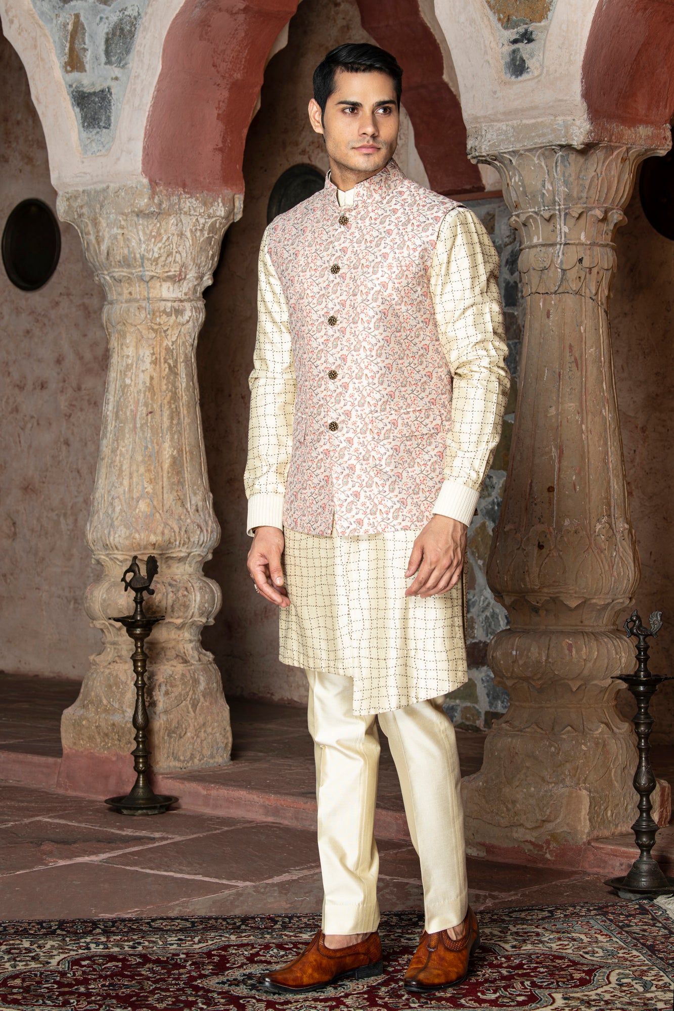 Beige dupion raw silk blend floral embroidered nehru jacket