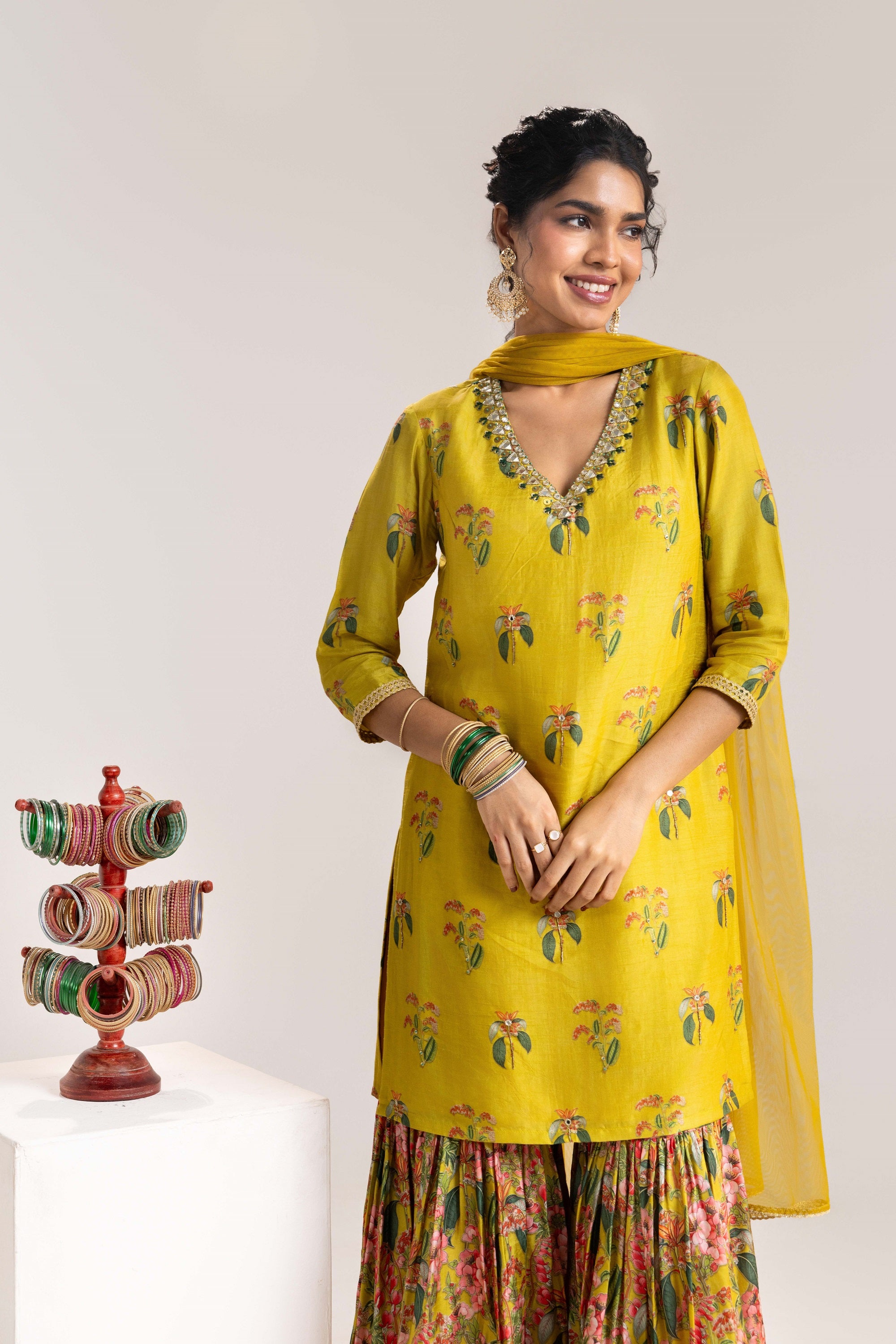 "Yellow Aarani Embellished Sleeveless Kurta With Printed Sharara Pants, Paired With An Embroidered Cape In Net