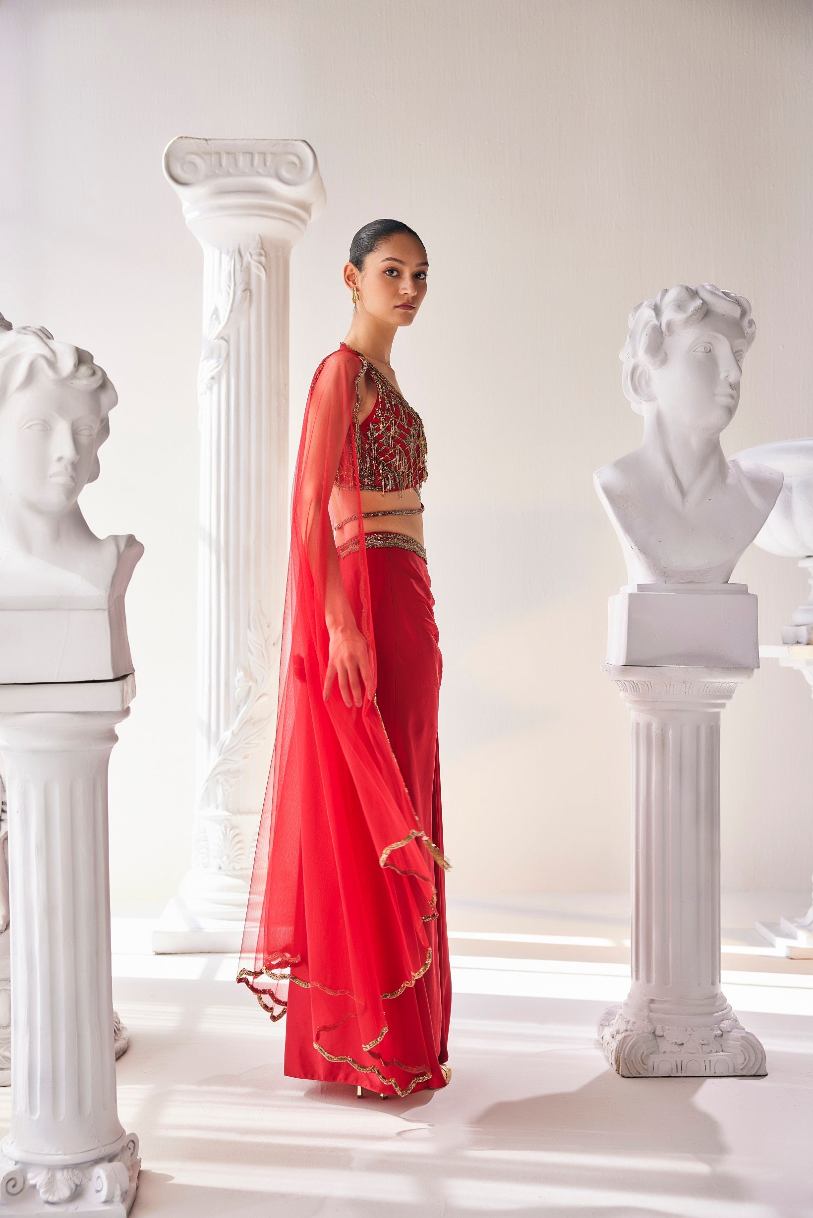 Elegant red ensemble features a royal satin skirt, fully embroidered blouse, belt and a cape in a soft net.