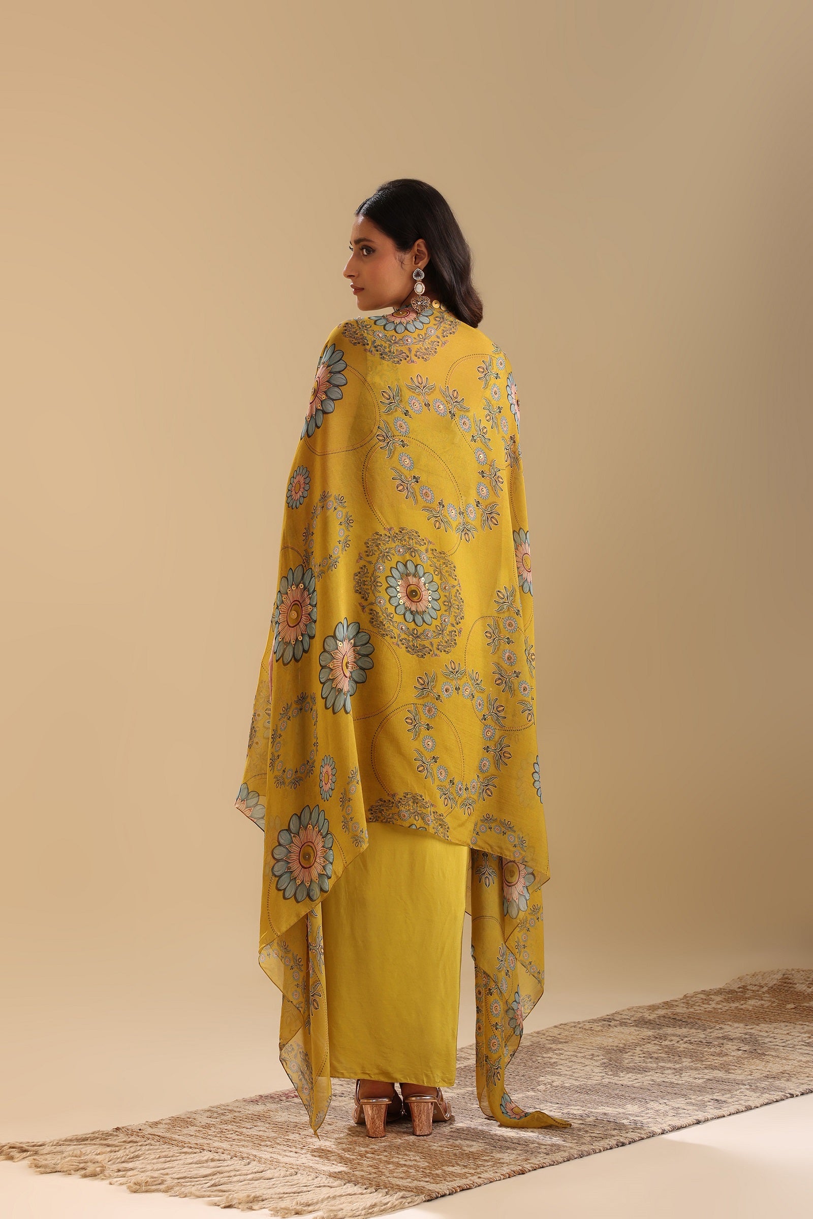"Yellow Eraya Embellished Choli and Drape Skirt Paired with Organza Asymmetric Cape