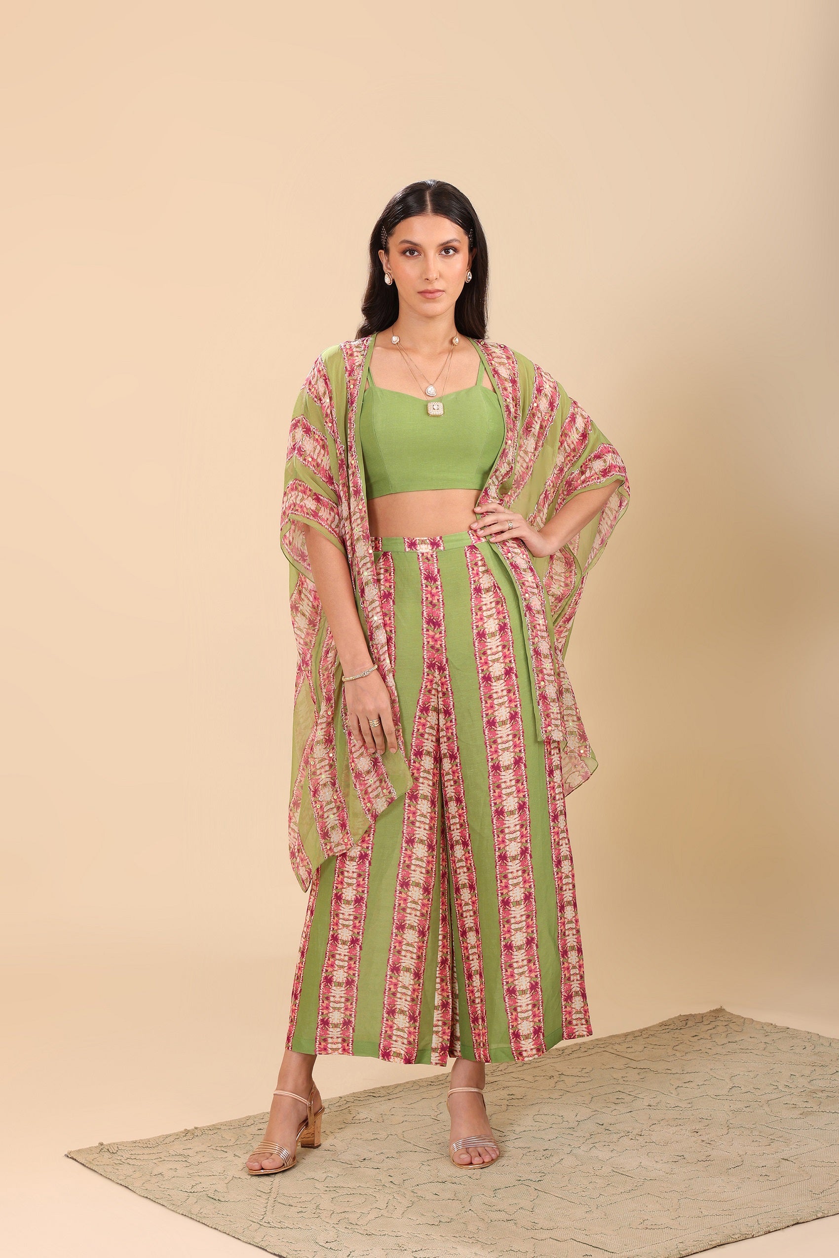 "Green Naqsh Bustier paired with Printed Palazzo Pants and an Embellished Cape in Organza.