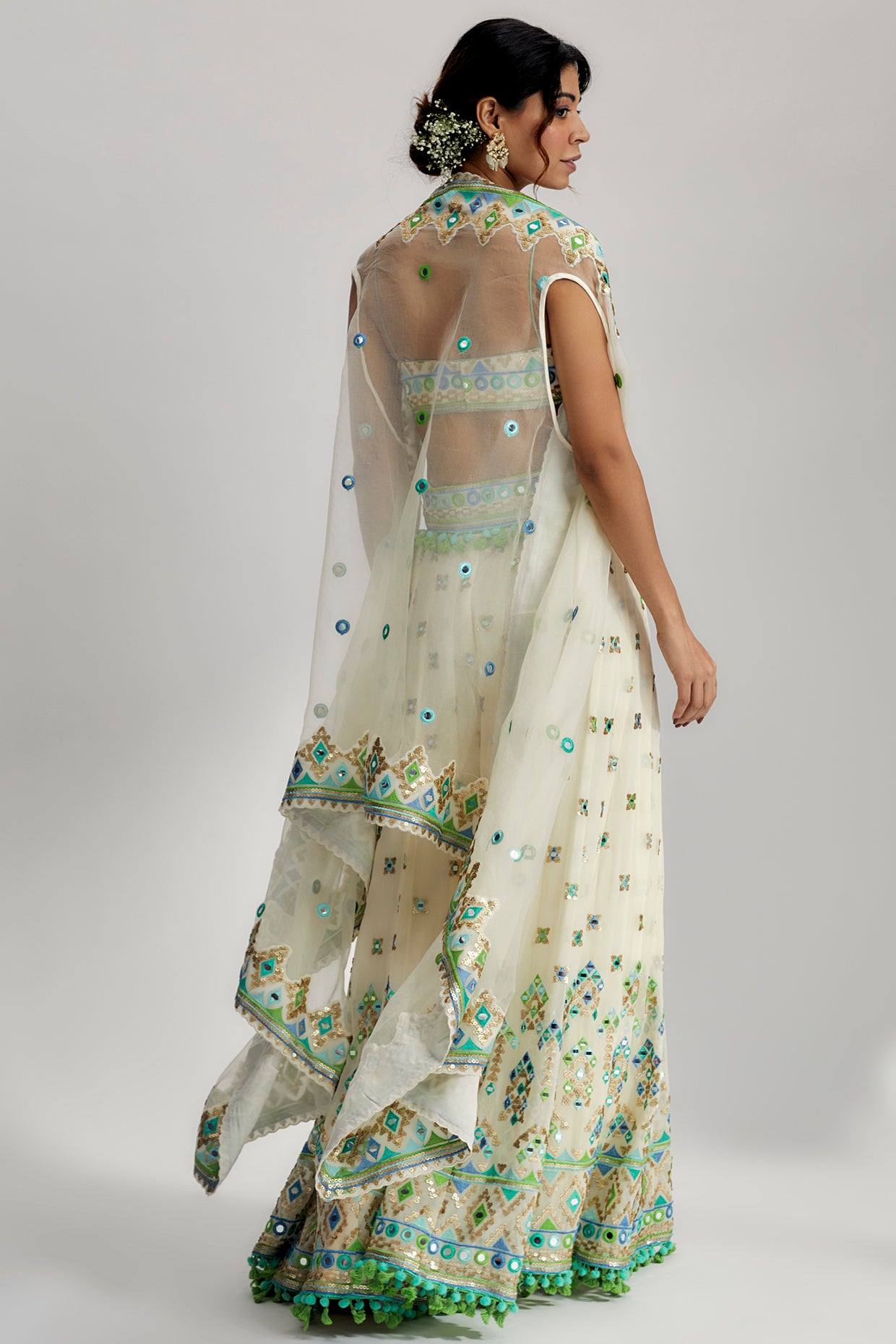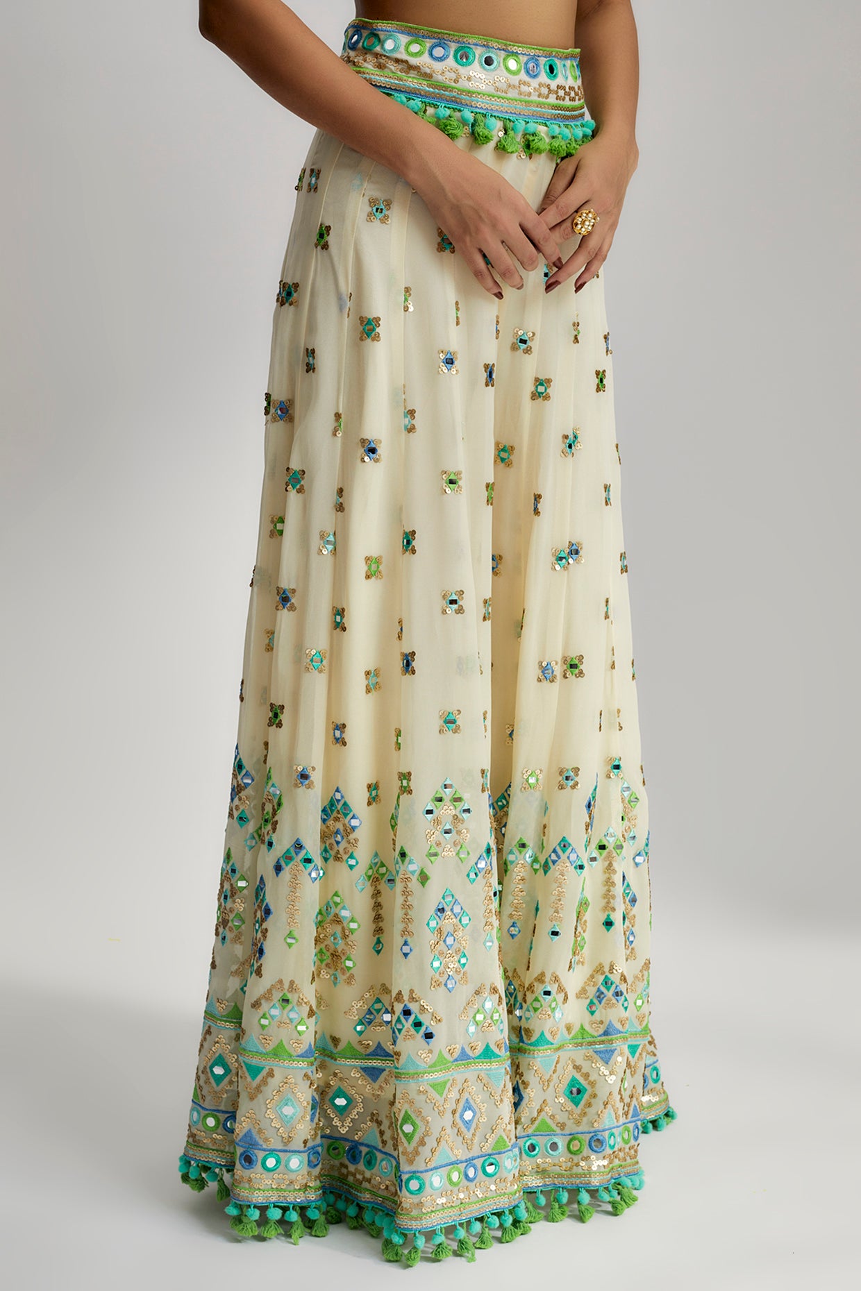 The The Imran Cape Set With Flared Pants with mirror work, pompoms, tassels, and intricate hand and machine embroidery is a true masterpiece that celebrates artistry and craftsmanship. It is the perfect choice for festive occasions, weddings, or any special event where you want to make a lasting impression.