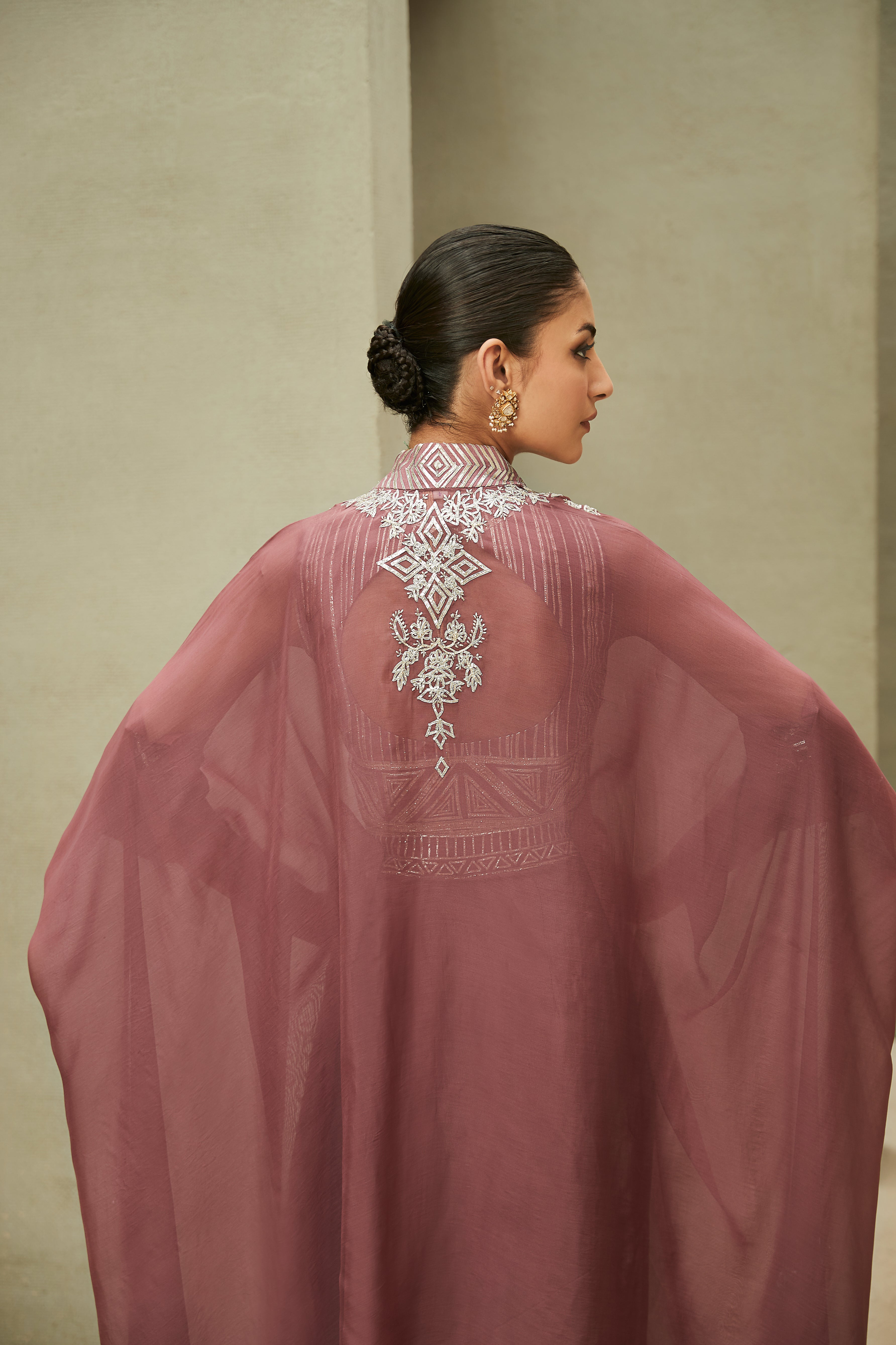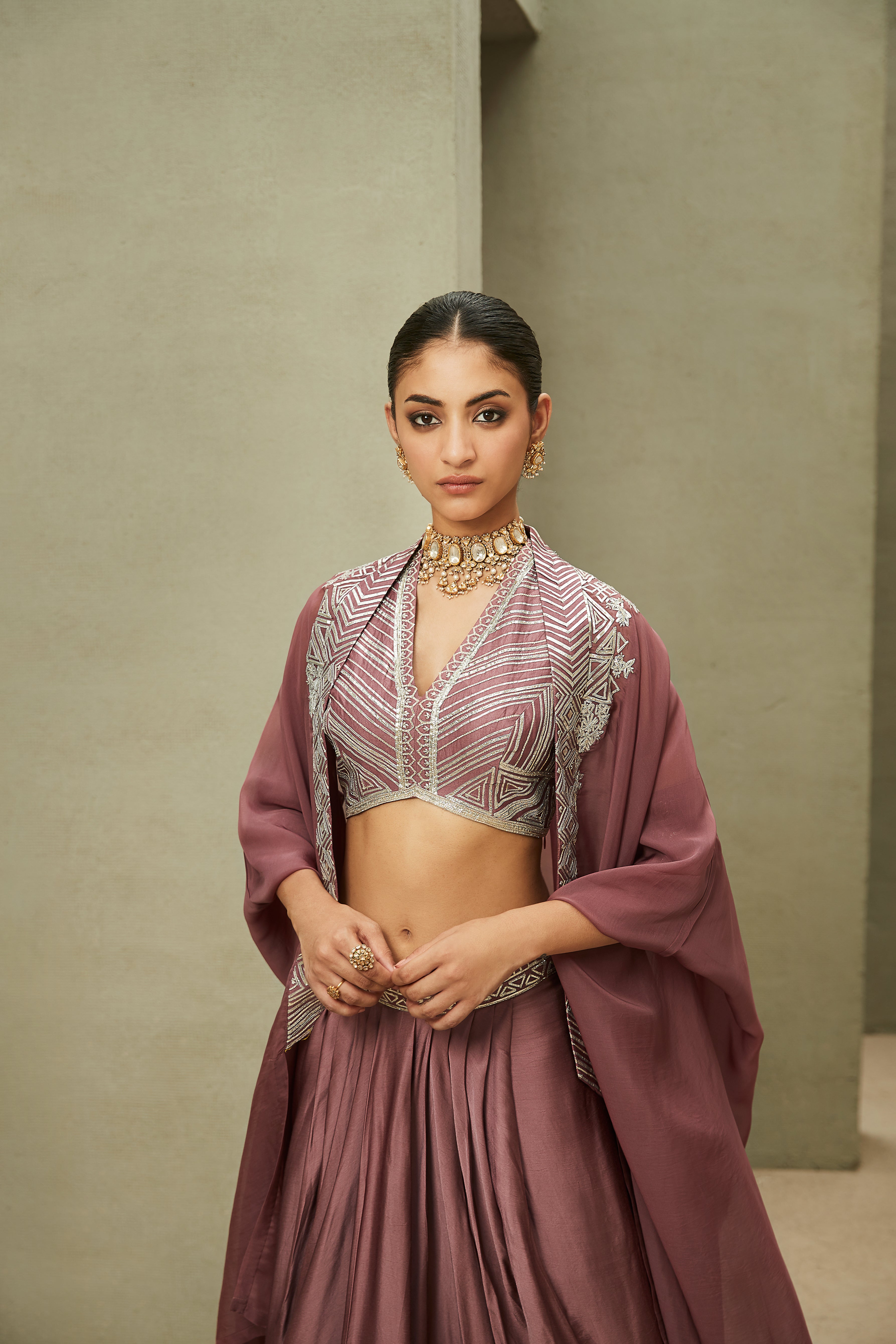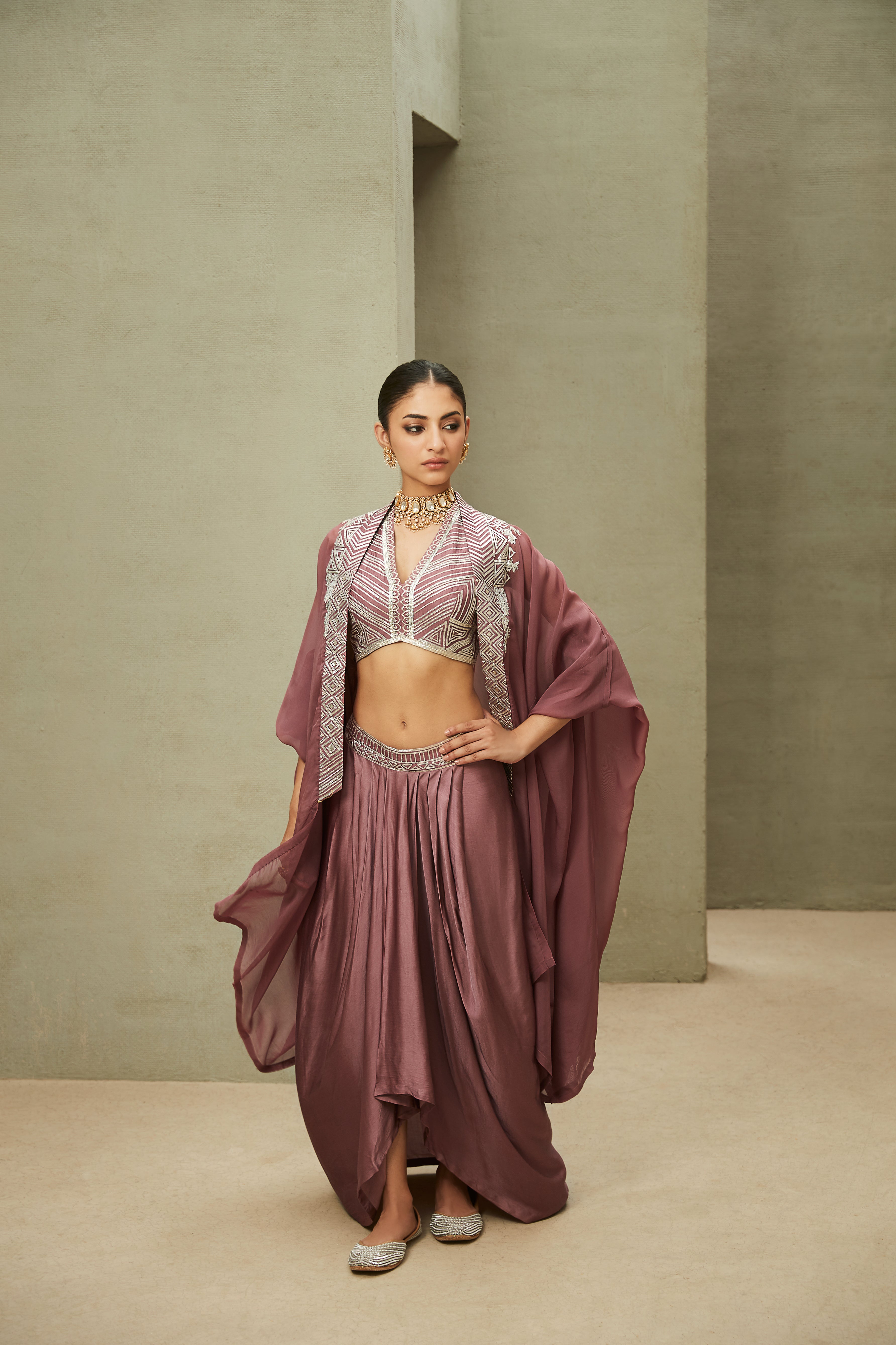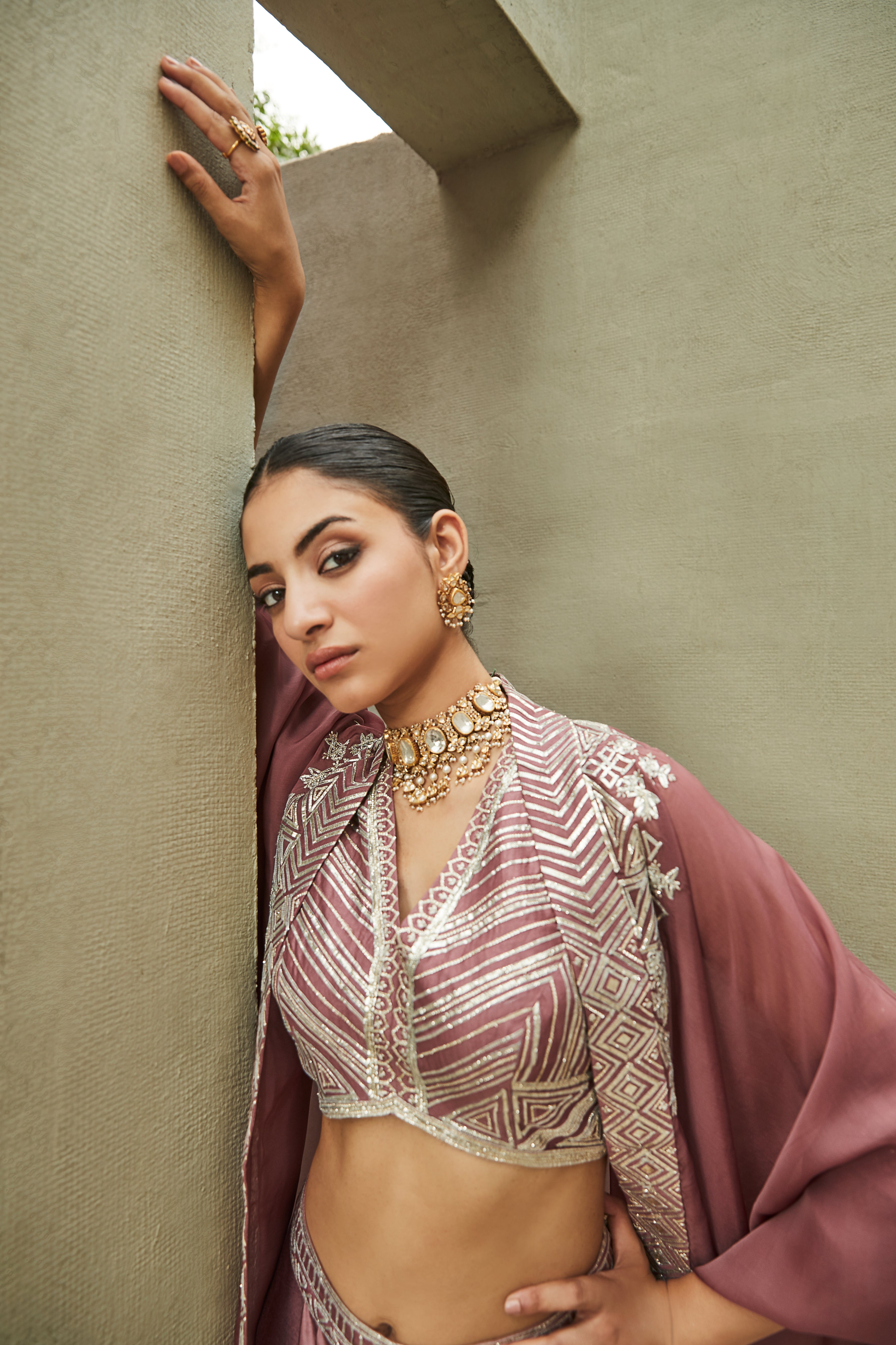 Minimalistic sensibilities meet traditional Indian craftsmanship in this reimagined cape set from Matsya’s Heritage Pret Line ‘23. Featuring our signature tarnished silver gota patti and zari work, it draws inspiration from everything art deco, and comprises a pleated satin skirt, an embroidered chanderi V-neck blouse, and an organza cape reminiscent of modern India and global nuances.