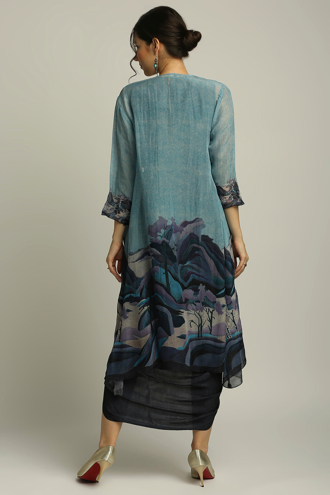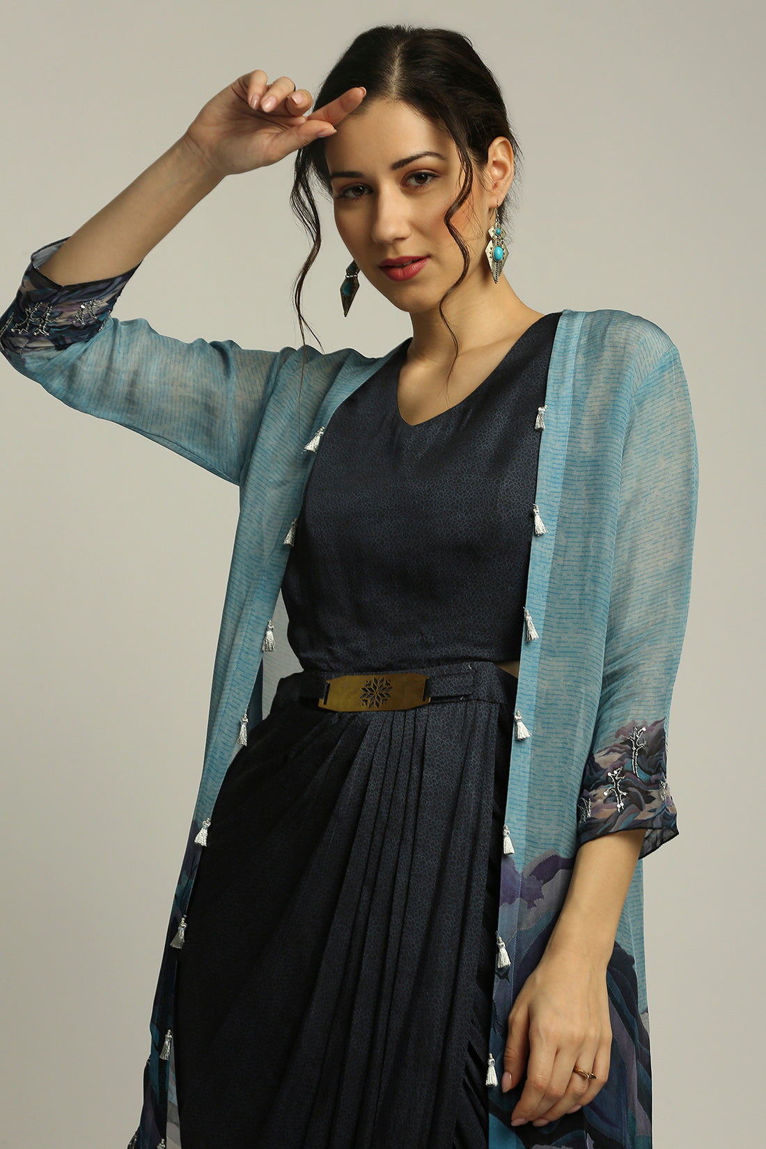 Elevate Your Wardrobe With This Ethereal Conversational Printed Organza Drape Dress With Jacket, A Stunning Blend Of Artful Storytelling And Contemporary Silhouette. Crafted In Sheer, Lightweight Organza, The Dress Flows Gracefully With Every Movement, Exuding Femininity And Sophistication.