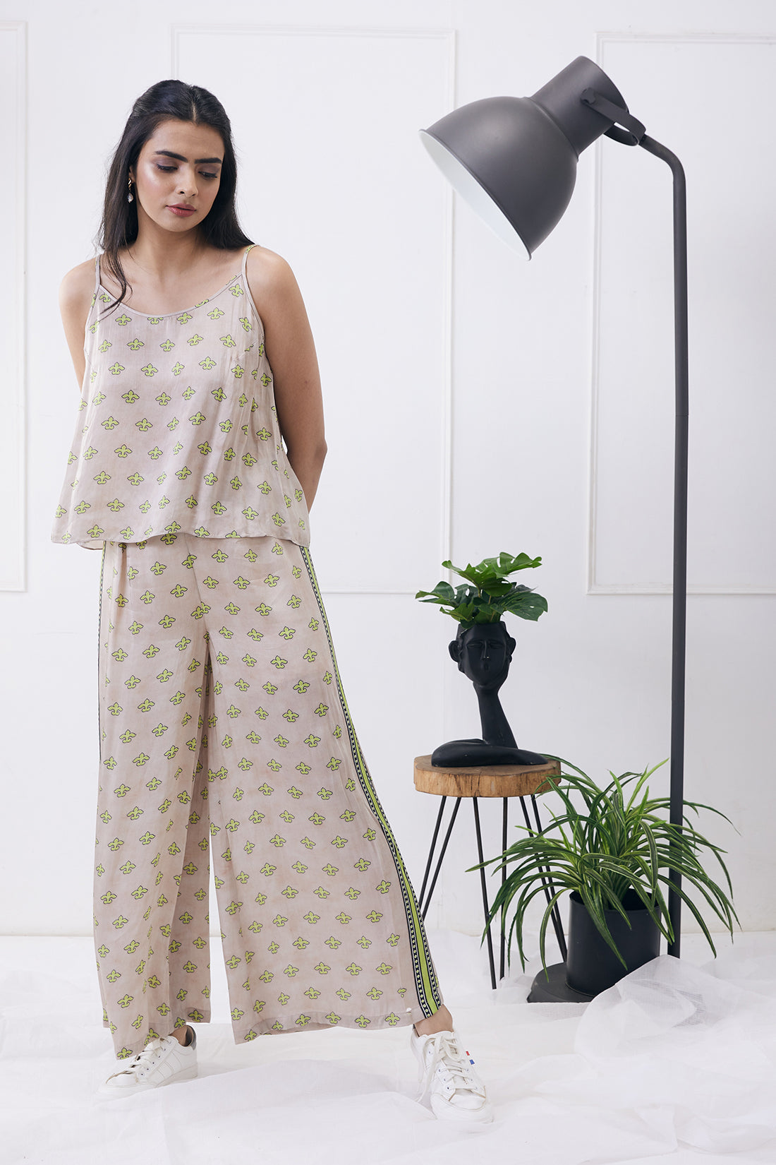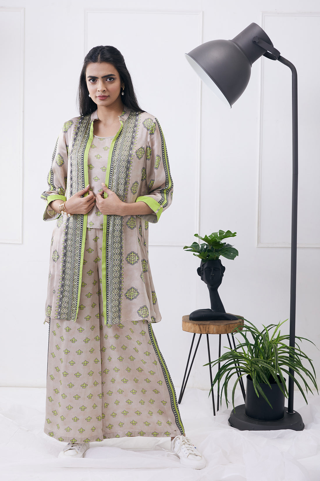 The Ela Printed Co-Ord Set With Jacket In Beige And Green, Crafted From Soft Satin, Blends Contemporary Flair With Effortless Elegance Perfect For Chic Daytime Outings Or Relaxed Festive Gatherings.