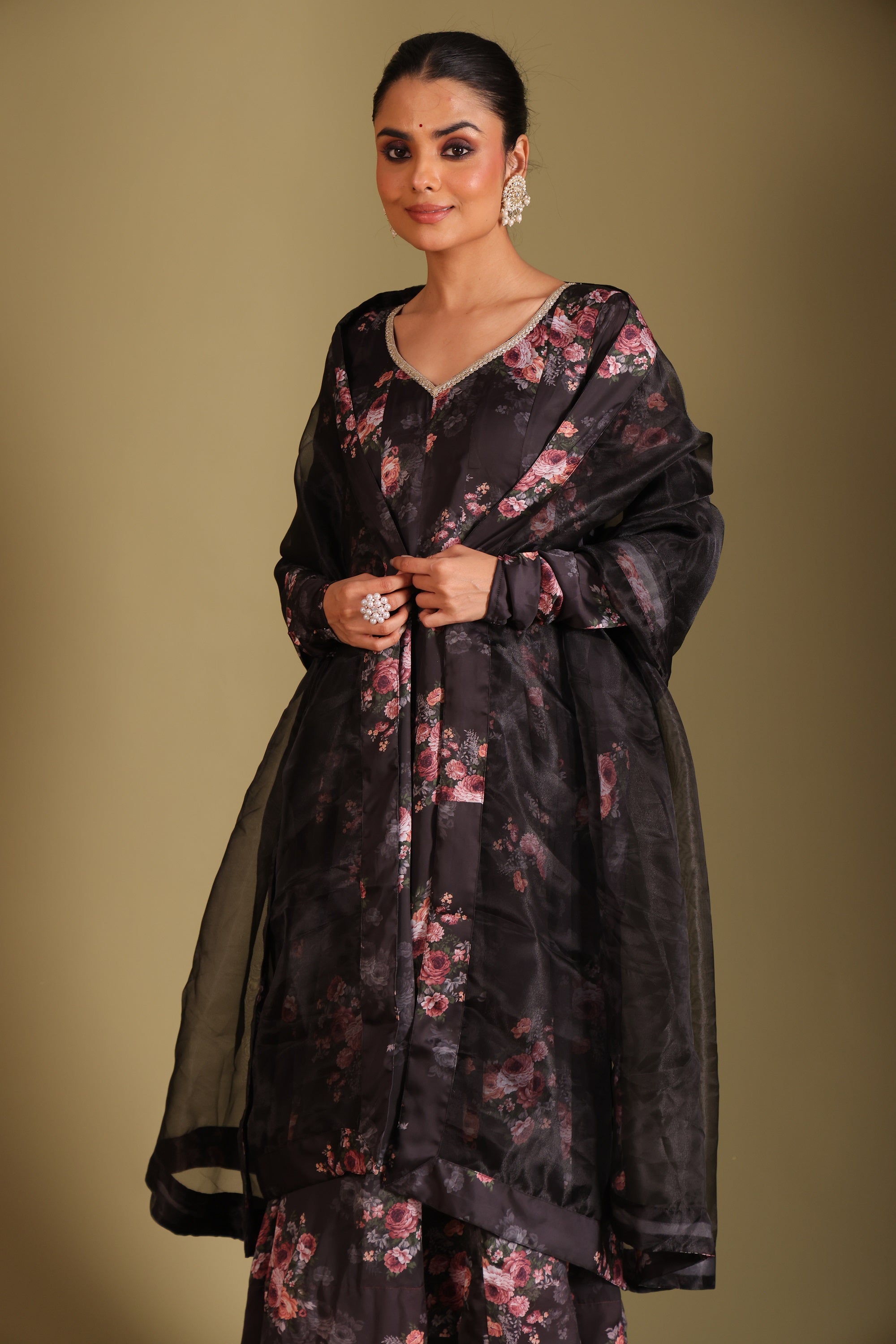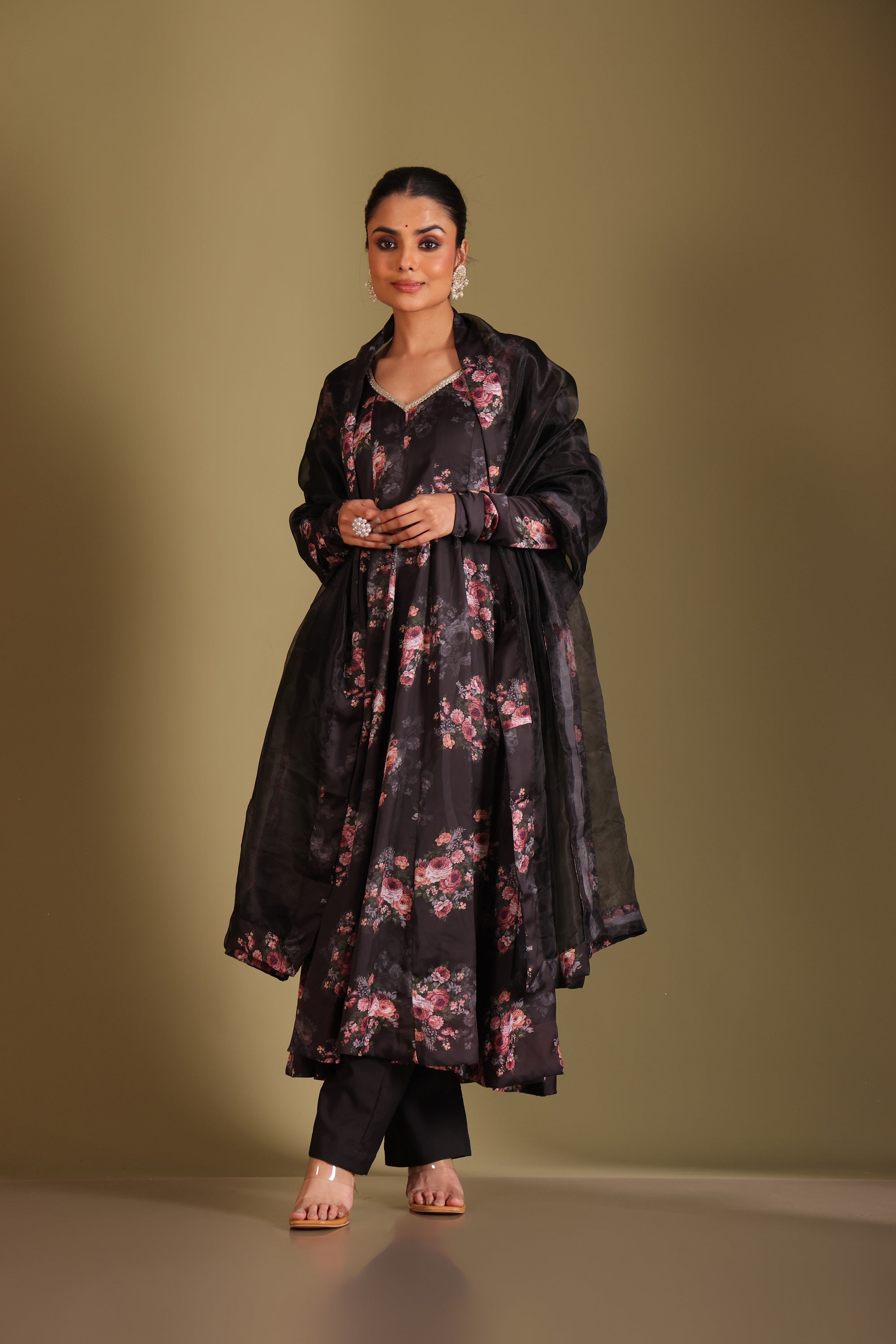 "This Set Includes A Digitally Printed Anarkali, Palazzo, And Dupatta. The Anarkali Is Adorned With Lace Detailing And Features A Contrasting Red Facing Along The Ghera. It Is Paired With A Complementing Palazzo. The Dupatta Is Beautifully Finished With Organza With Printed Border Complimenting The Print