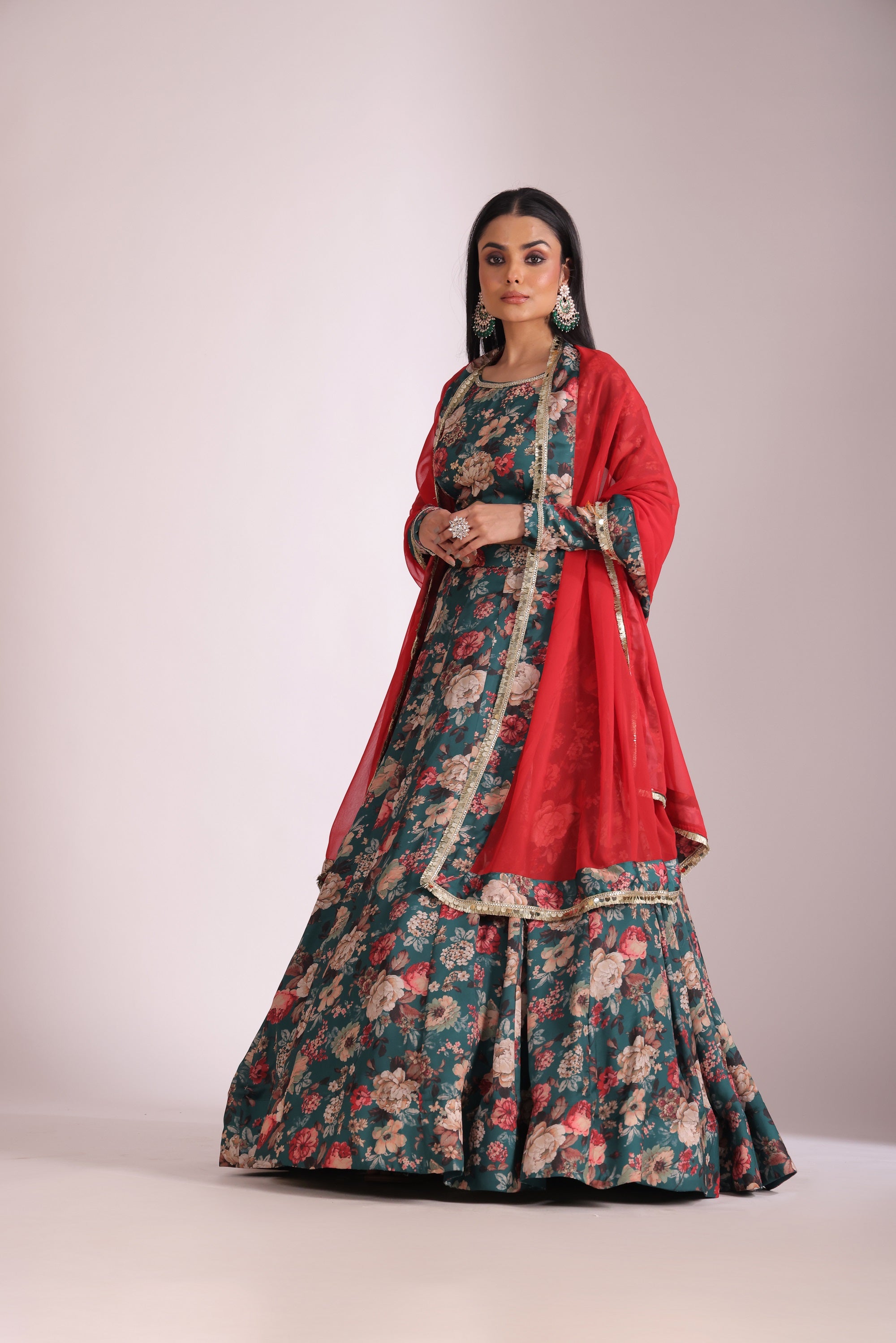 "This Three Piece Set Includes Blouse, Lehenga And Dupatta This Striking Lehenga Set Is A Contemporary Celebration Of Floral Elegance And Traditional Detailing. It Features A Richly Flared Teal Lehenga Adorned With Large Multicolor Floral Prints That Lend A Bold, Romantic Vibe. The Matching Blouse Comes With Full Sleeves And A Stylish Curve Detail At The Front, Creating A Modern Silhouette. Completing The Ensemble Is A Contrasting Red Georgette Dupatta With Delicate Gota Lace Along The Borders, Perfectly Balancing The Vivid Print Of The Lehenga With A Pop Of Festive Color. This Outfit Is Perfect For Mehndi Functions, Sangeets, Or Any Event Where You Want To Make A Statement With Elegance.