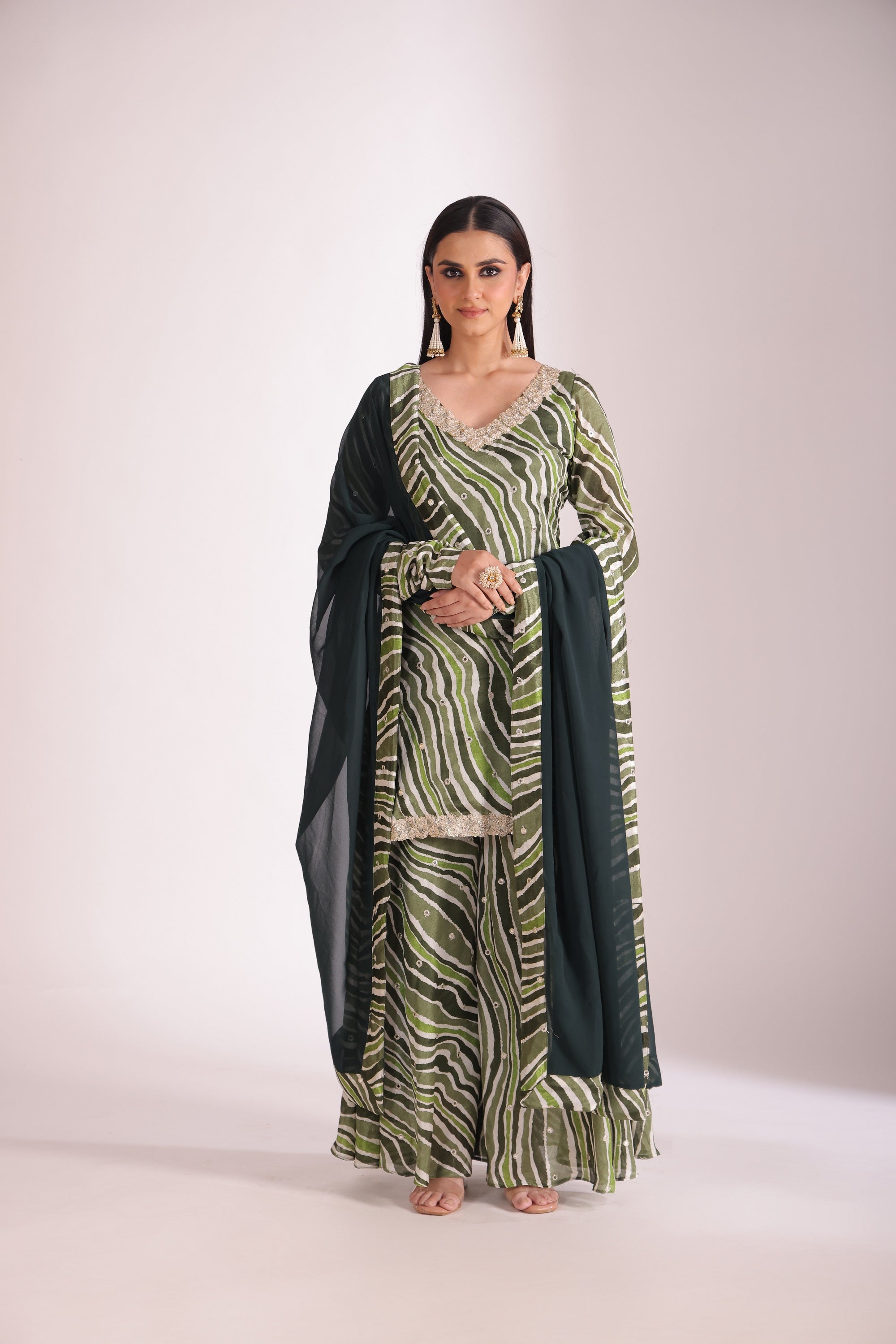 "This Three Piece Set Includes Kurta, Sharara And Dupatta This Elegant Three-Piece Set Features A Kurta And Sharara In A Distinctive Green And Ivory Abstract Striped Print. The Kurta Is Styled With A Flattering V Neckline And Adorned With Intricate Mirror Work And Delicate Gota Lace Embroidery At The Neckline And Hem. It Features Full Churi Sleeves That Add To Its Graceful Silhouette. The Matching Flared Sharara Echoes The Kurta’s Print, Creating A Cohesive Look. Completing The Ensemble Is A Soft Georgette Dupatta, Subtly Embellished To Elevate The Outfit With A Hint Of Finesse With Printed Border
