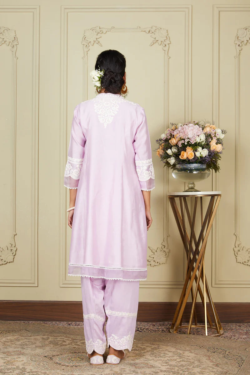 The Ryhana Ensemble From Our Mogra Collection Is Made Using Pure Chanderi Silk Fabric And Adorned With Exclusive Dori Embroidery. It Features A Mandarin Collar With A Placket And Three-Quarter Sleeves. The Ensemble Comes With A Dogri Salwar And Dupatta, Embellished With Tiny Pearls And Finished Using The Trimming Of Silk Organza And Lace.