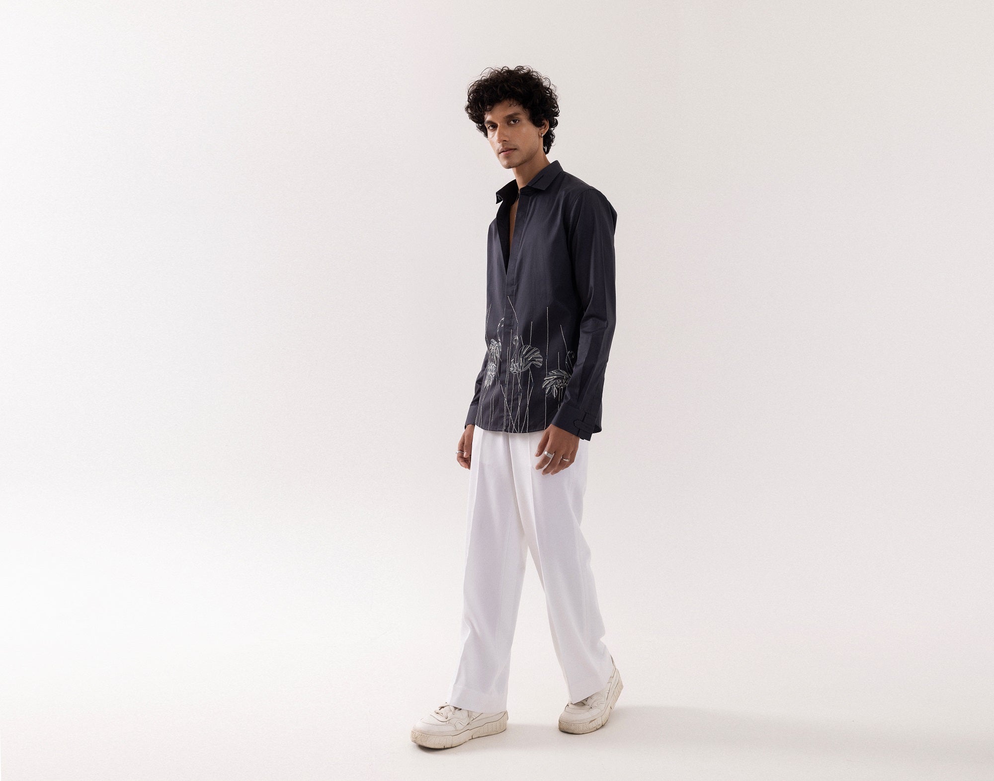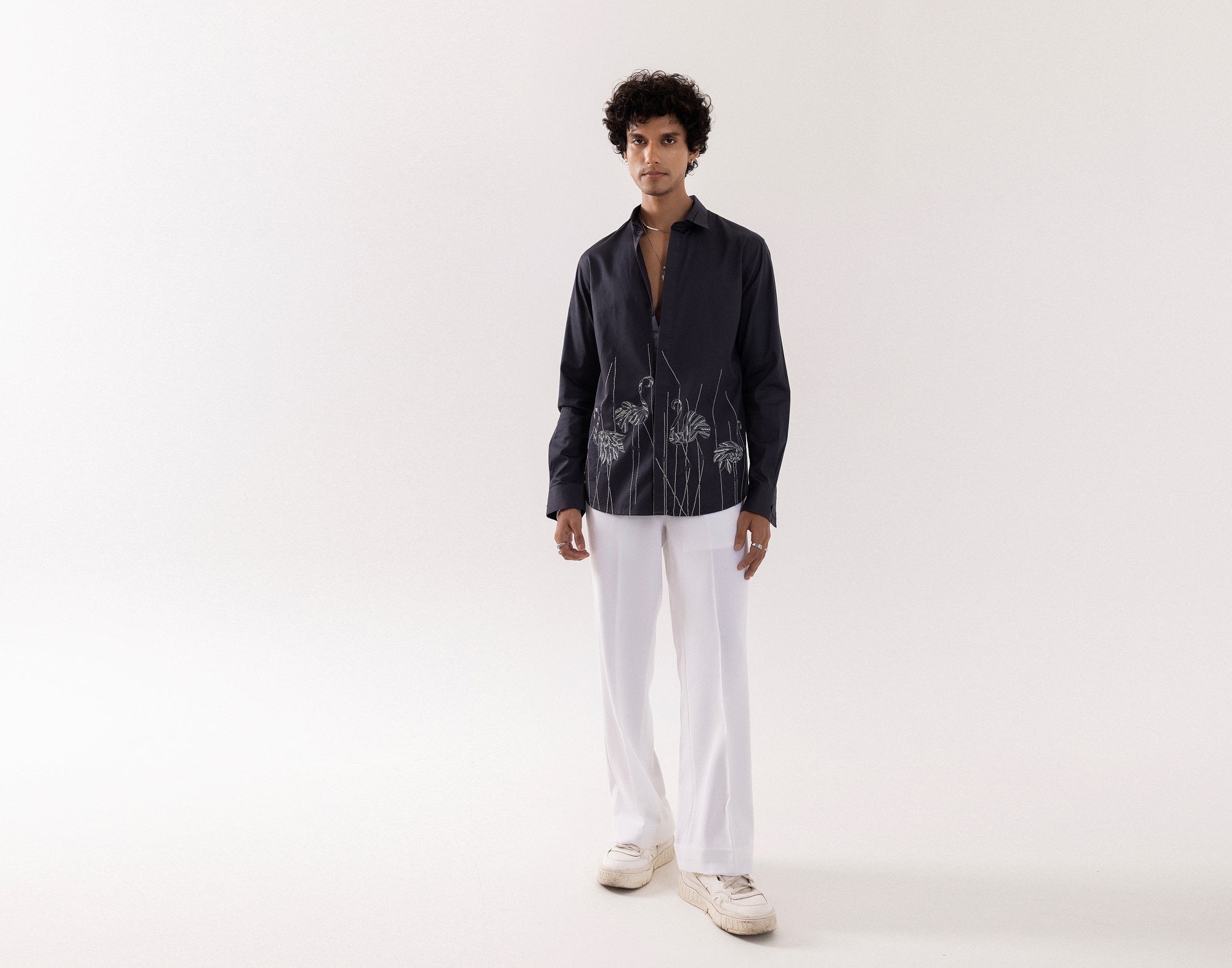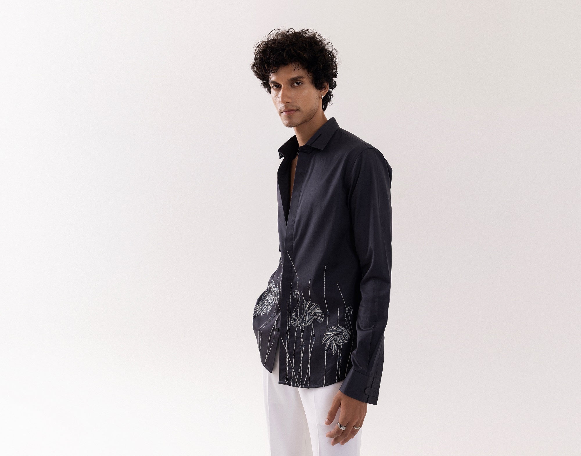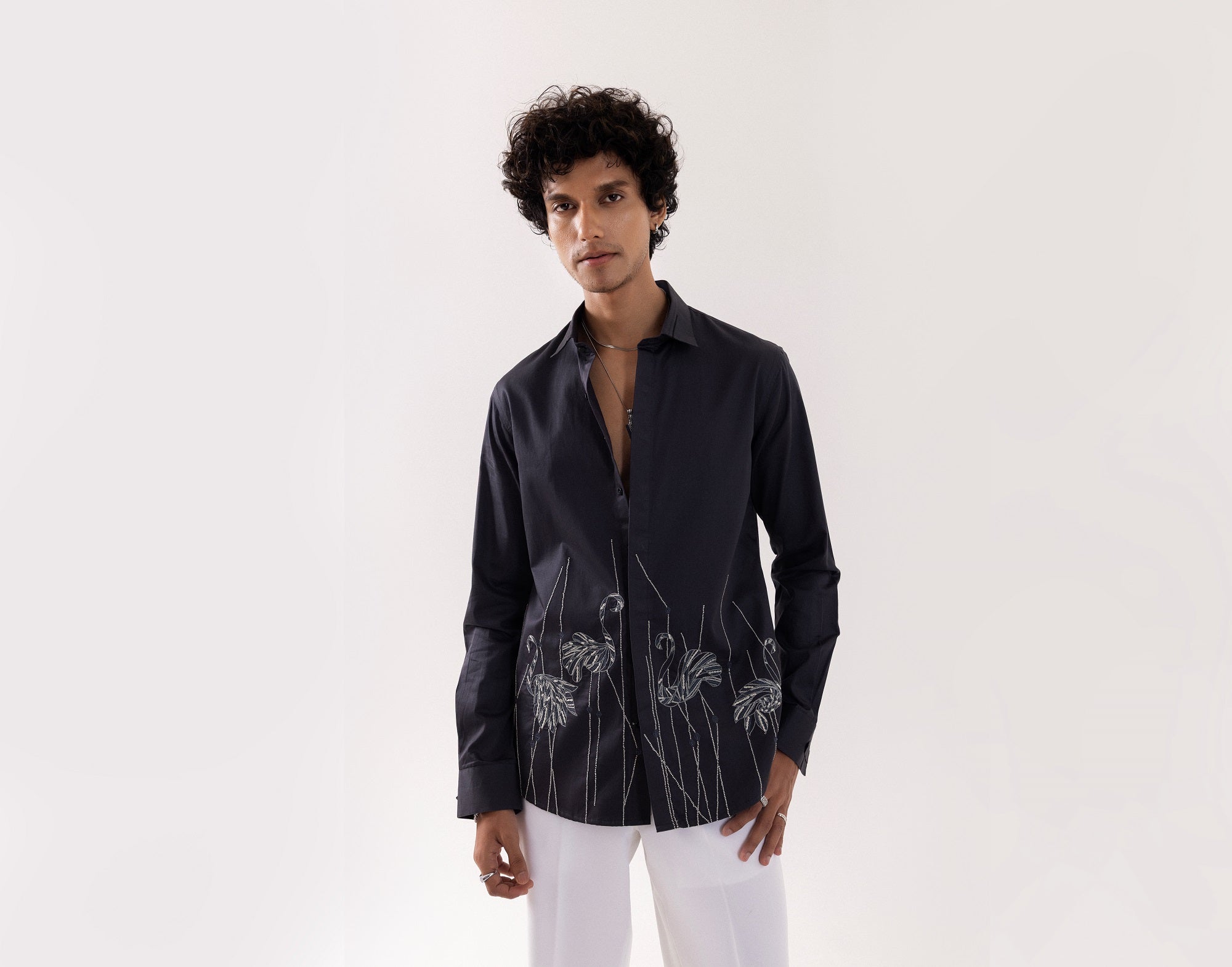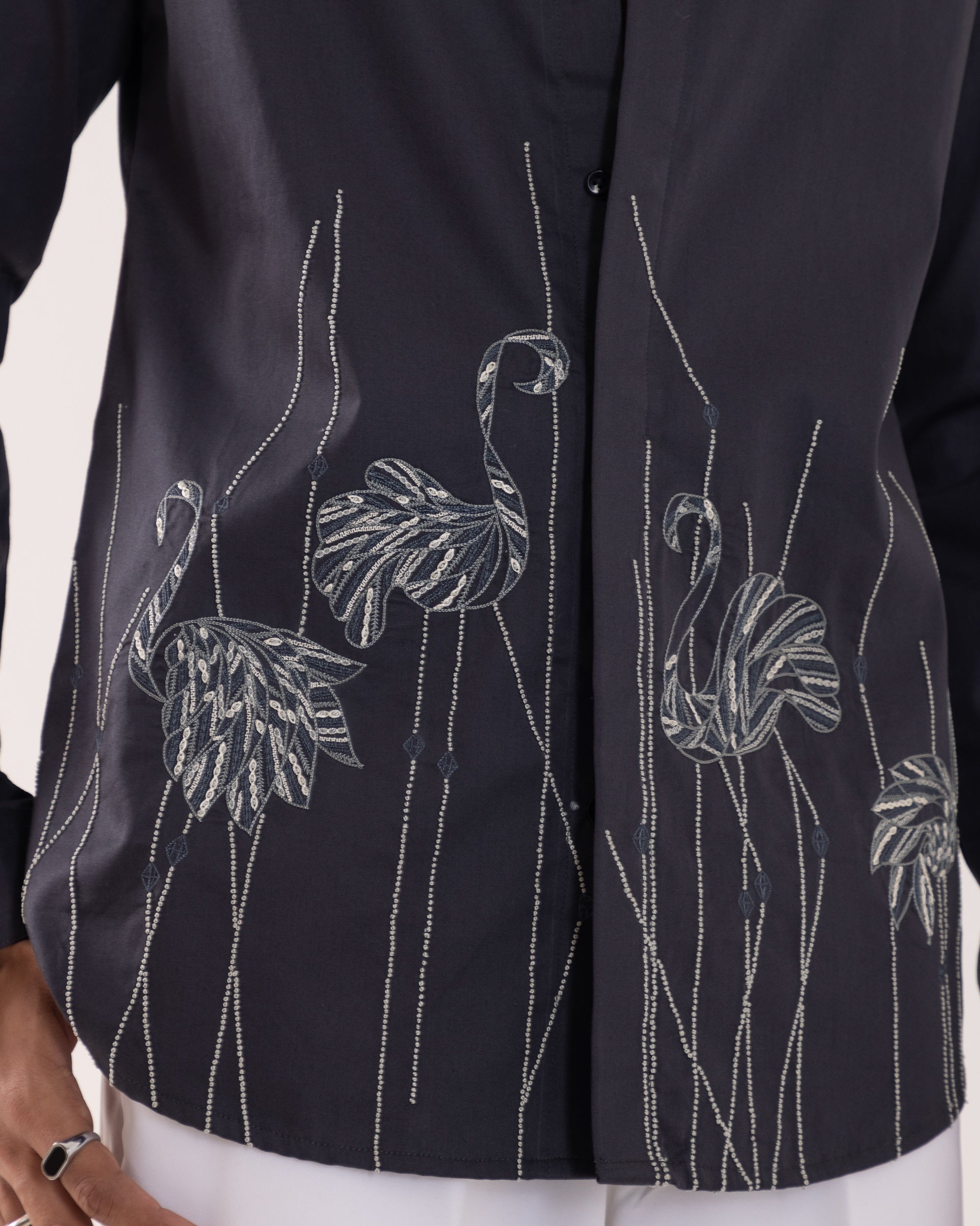 A charcoal grey cotton shirt featuring a striking geometric pattern that subtly incorporates a flamingo motif, embroidered in two shades of grey to harmonize with the base color. The design blends structure with elegance, enhanced by coordinated detailing on the collar, cuffs, and back, creating a cohesive and contemporary look with a refined artistic touch.