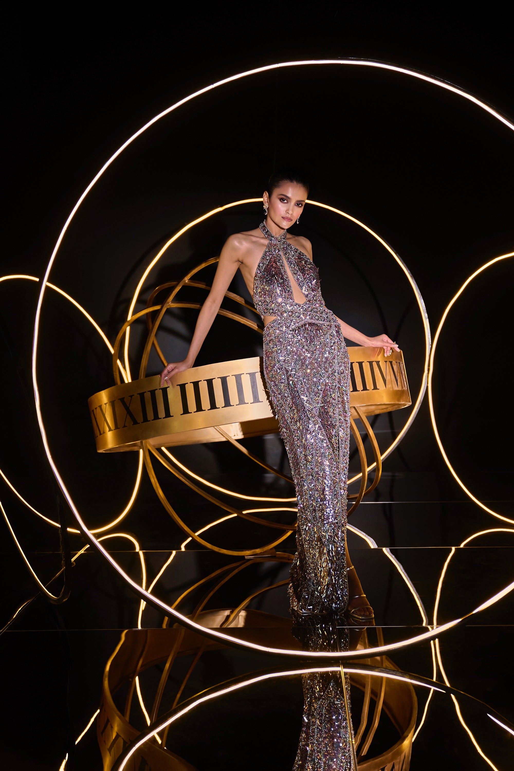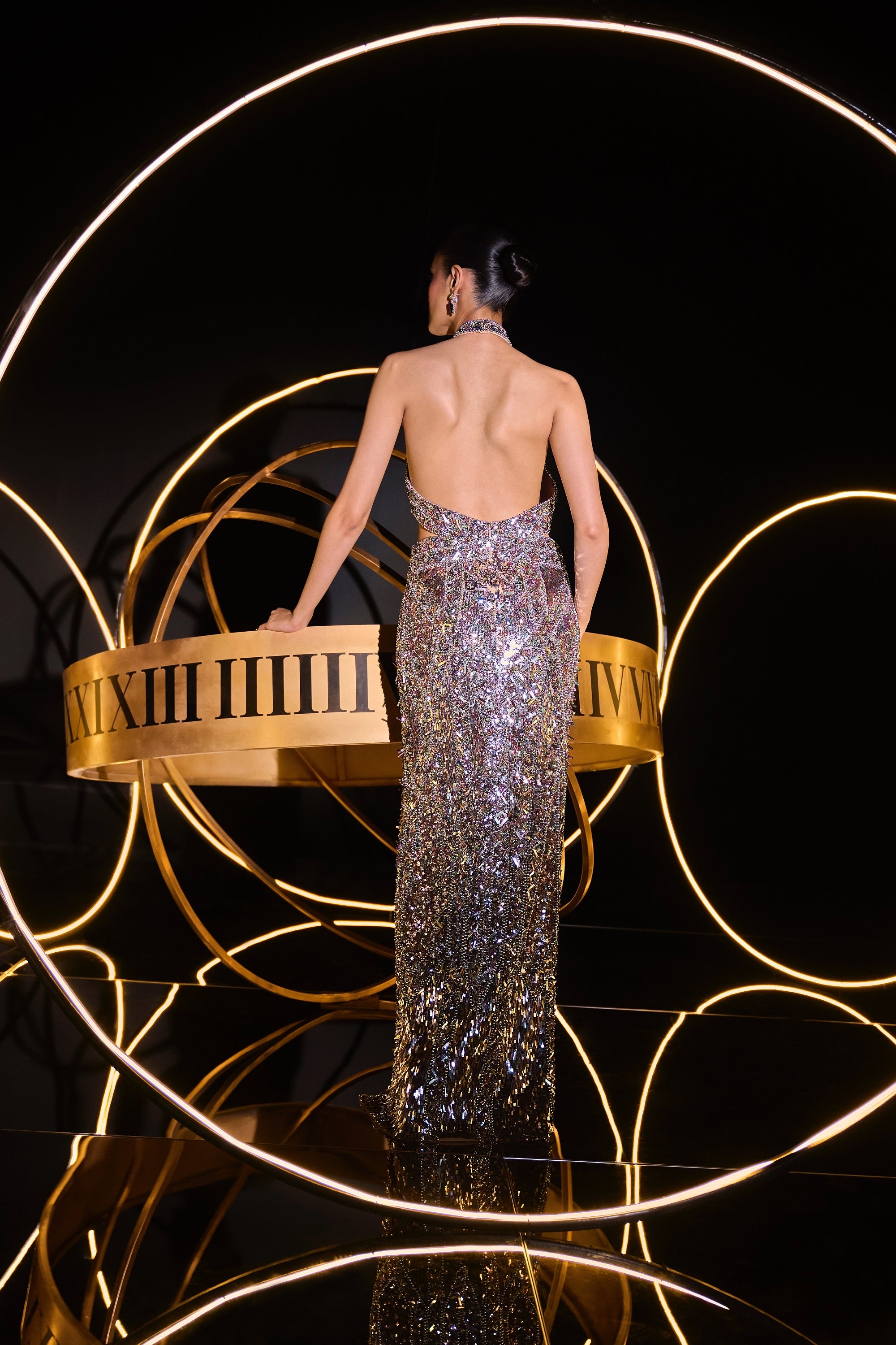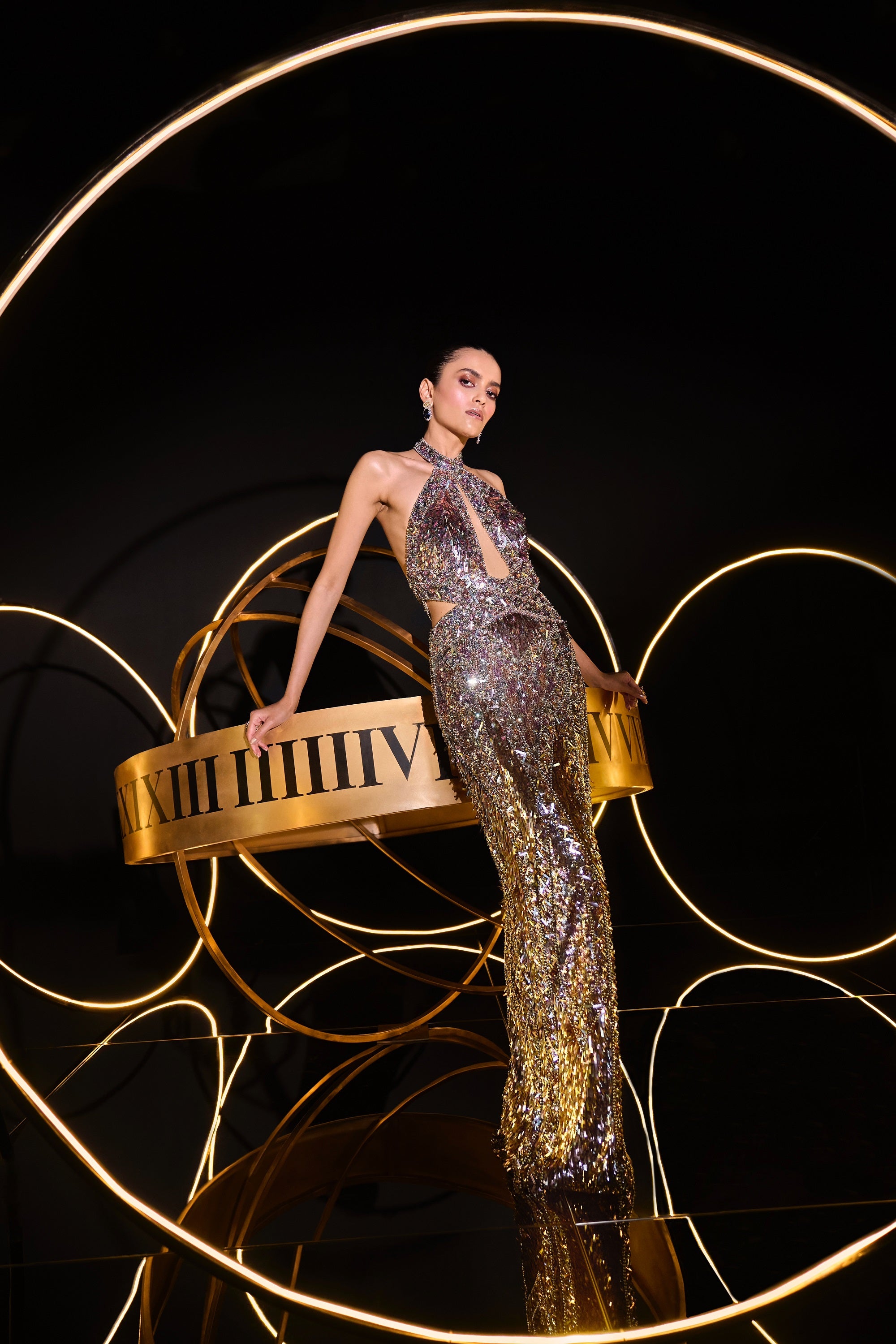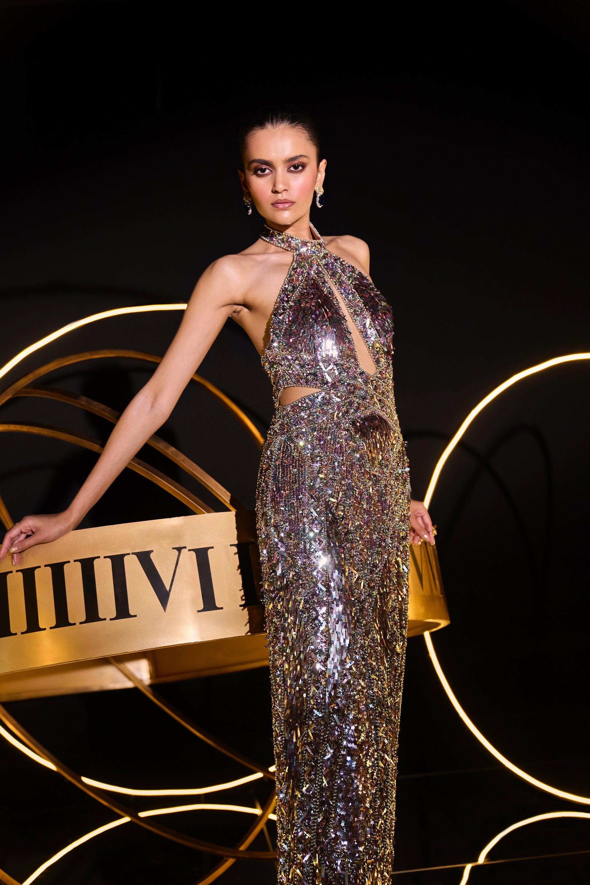 A GLIMMERING PASTEL BODY CON ART DECO MEETS COSMIC MOVEMENT GOWN EMEBELLISHEDISHED COMPLETELY BY HAND WITH CRYSTALS, SEQUINS PEARLS AND BEADS