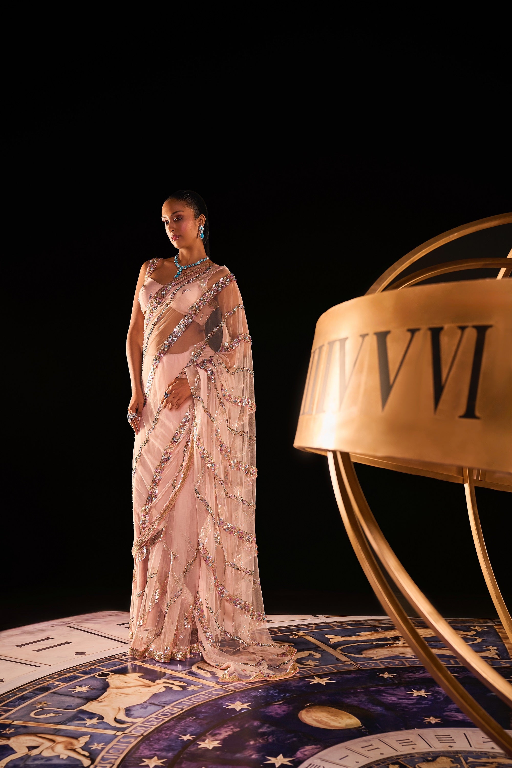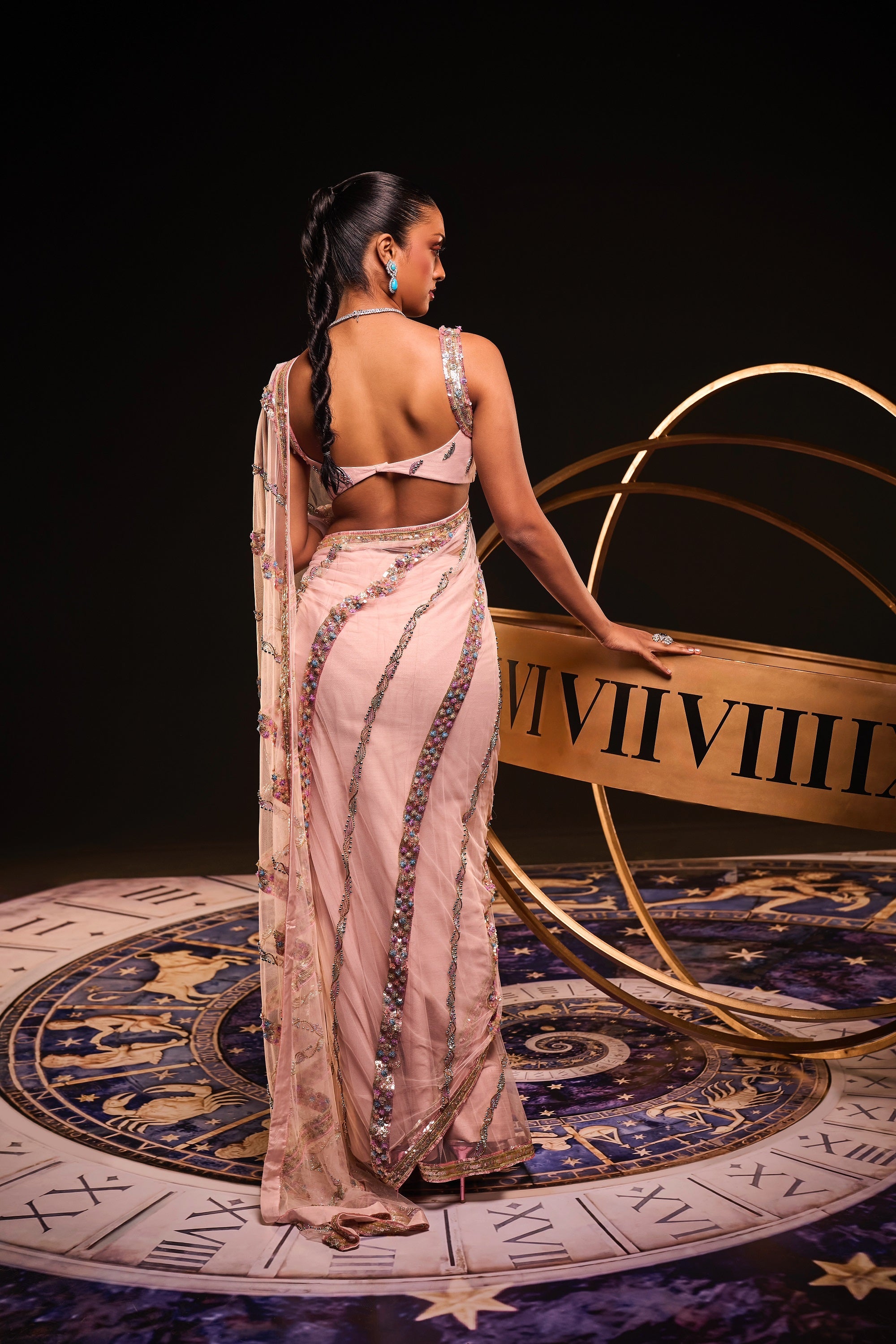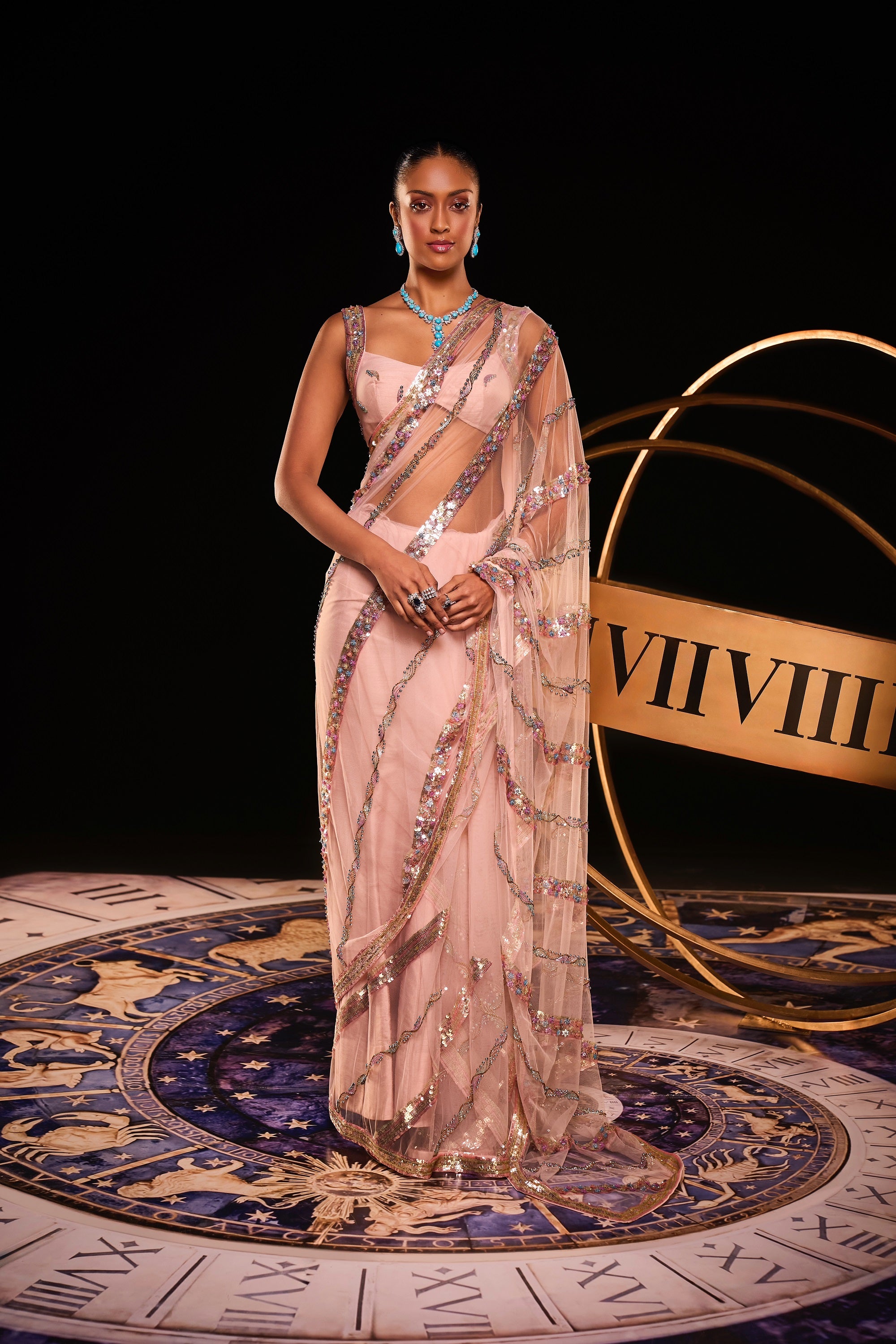 THE POUDRE TULLE MILKYWAY SARI IS A CLASSIC TULLE SARI WITH ALL OVER STRIED BORDERS WITHMULTICOLOURED HUES WITH INNOVATIVE 3D TECHNIQUES REMINCENT OF WHYMSICAL ELEGANCE
