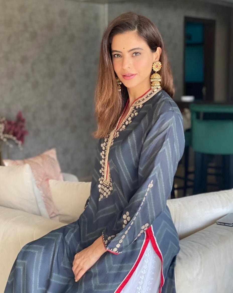 | Featuring a black long tunic in chanderi base with floral motifs, yolk and gota embroidery. |
