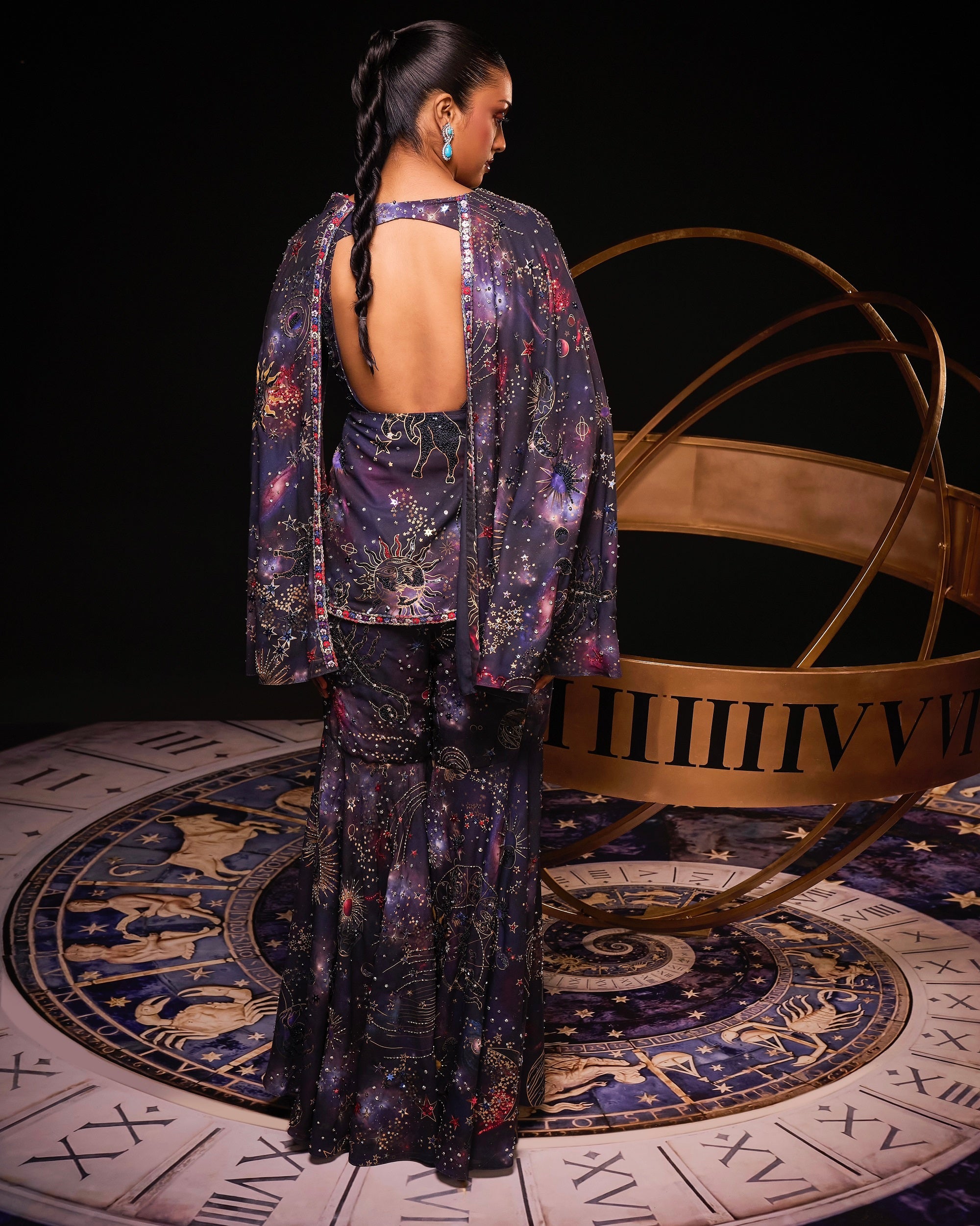 THE STARBUST CONSTELLATION CAPE SHARARA IS OUR SIGNATURE MODERN TAKE TO THIS OTHERWISE VINTAGE SILHOUETTE. IT COMES WITH A DELICATE YET INTRICATELY DETAILED 3D HAND EMBELLISHED BORDER
