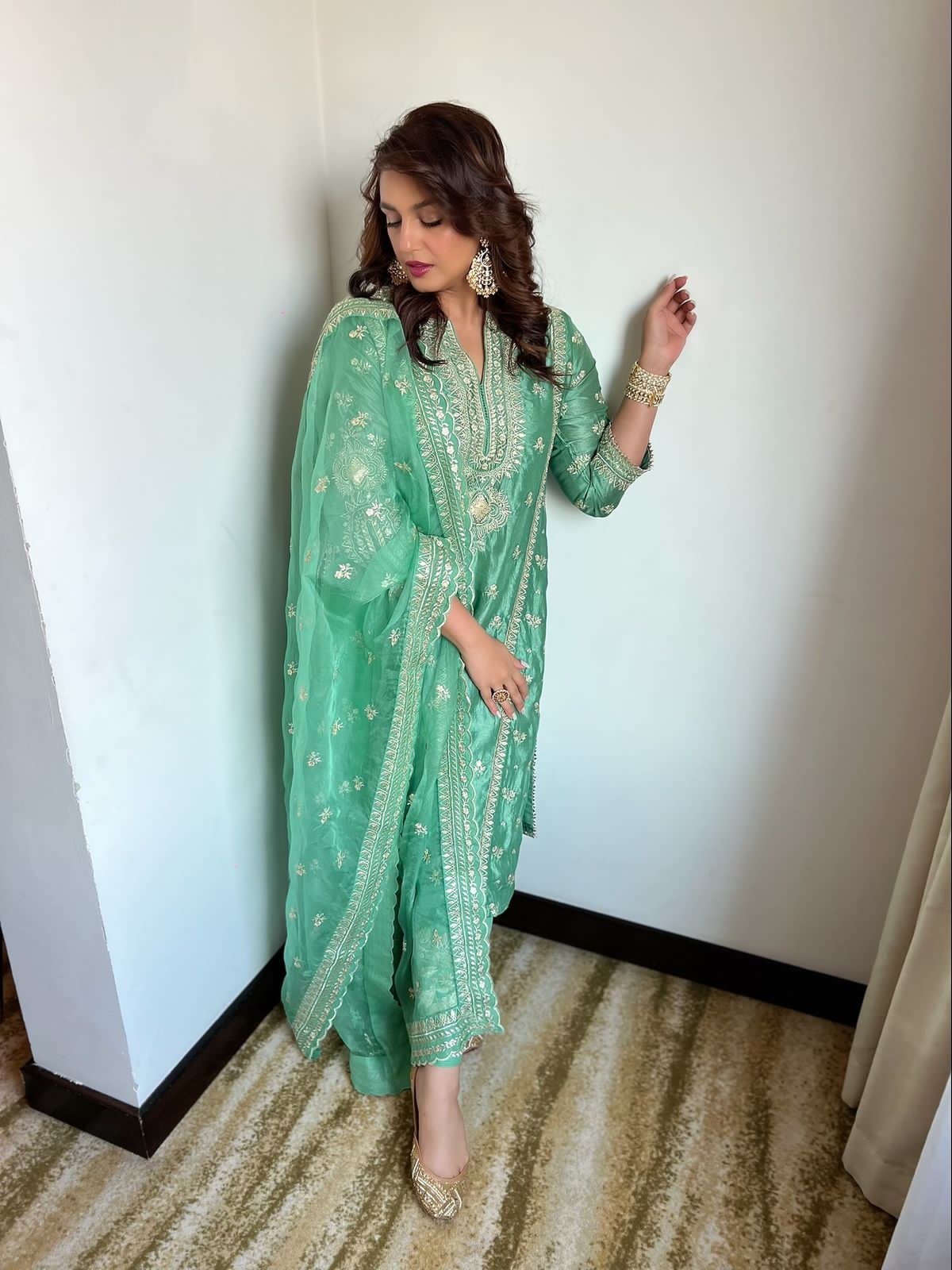 Featuring A Kurta With Long Sleeves. It Is Paired With Matching Palazzo Pants In Having Embroidery And Dupatta.
