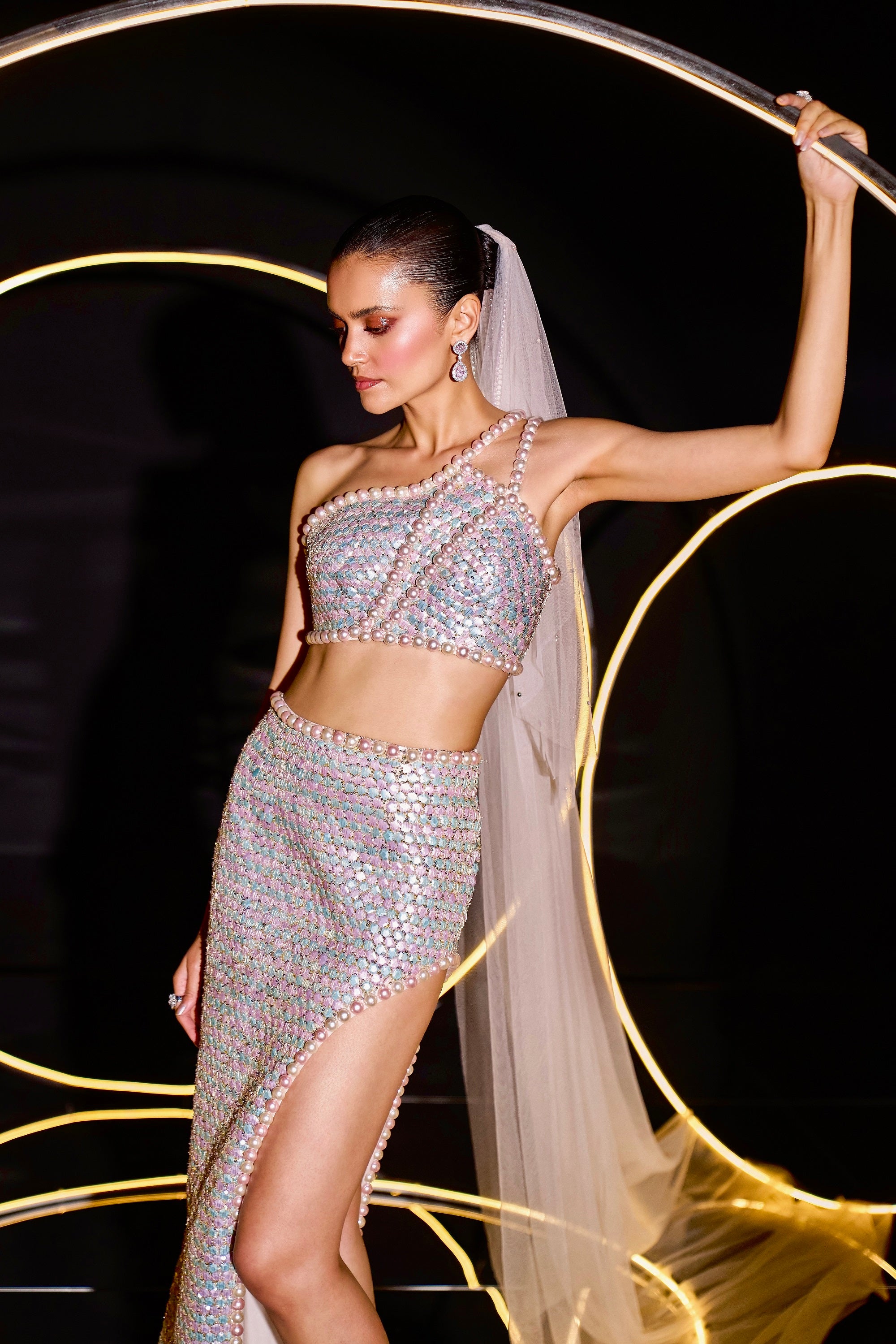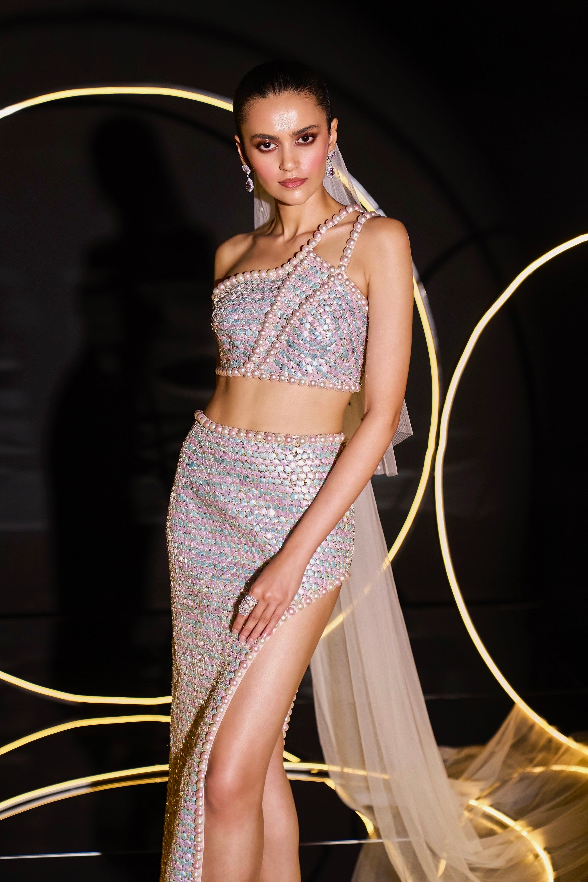 | THE MINT AND VIOLET CROP TOP AND SKIRT SET COMPLETELY HAND EMBELLISHED WITH SEQUIN, PEARL AND KASAB(GOLD METALLIC THREAD) IN ONE OF THE MOST INNOVATIVE EMBELLISHMENT TECHNIQUES IS THE PERFECT OUTFIT FOR THE FASHIONISTA BRIDE |