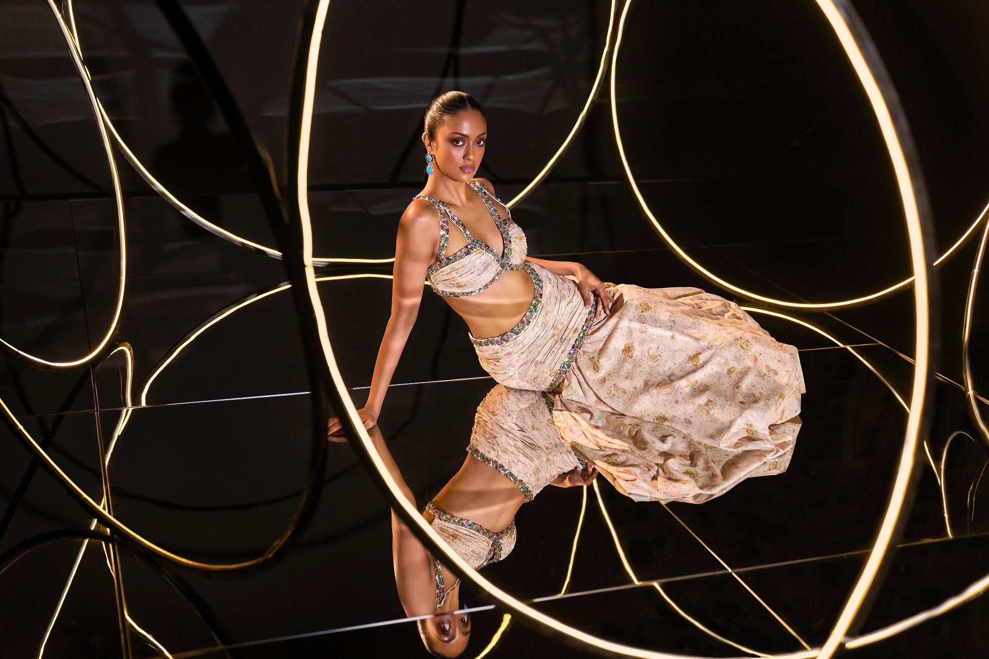 THE ASTROCOSMIC HALF MERMAID FUSION LEHENGA/CORD SET IS THE PERFCT PICK FOR GIRLS WHO STRUGGLE BETWEEN VOLUME AND SHAPE THE YOUTHFUL AND SULTRY SILHOUETTE IS EMBELLISHED WITH DELICATE MUILCOLURED HAND EMBELLISHED BORDERS AND A TULLE DUPATTA SPRAYED WITH DELICATE HAND WORK SPARKLES