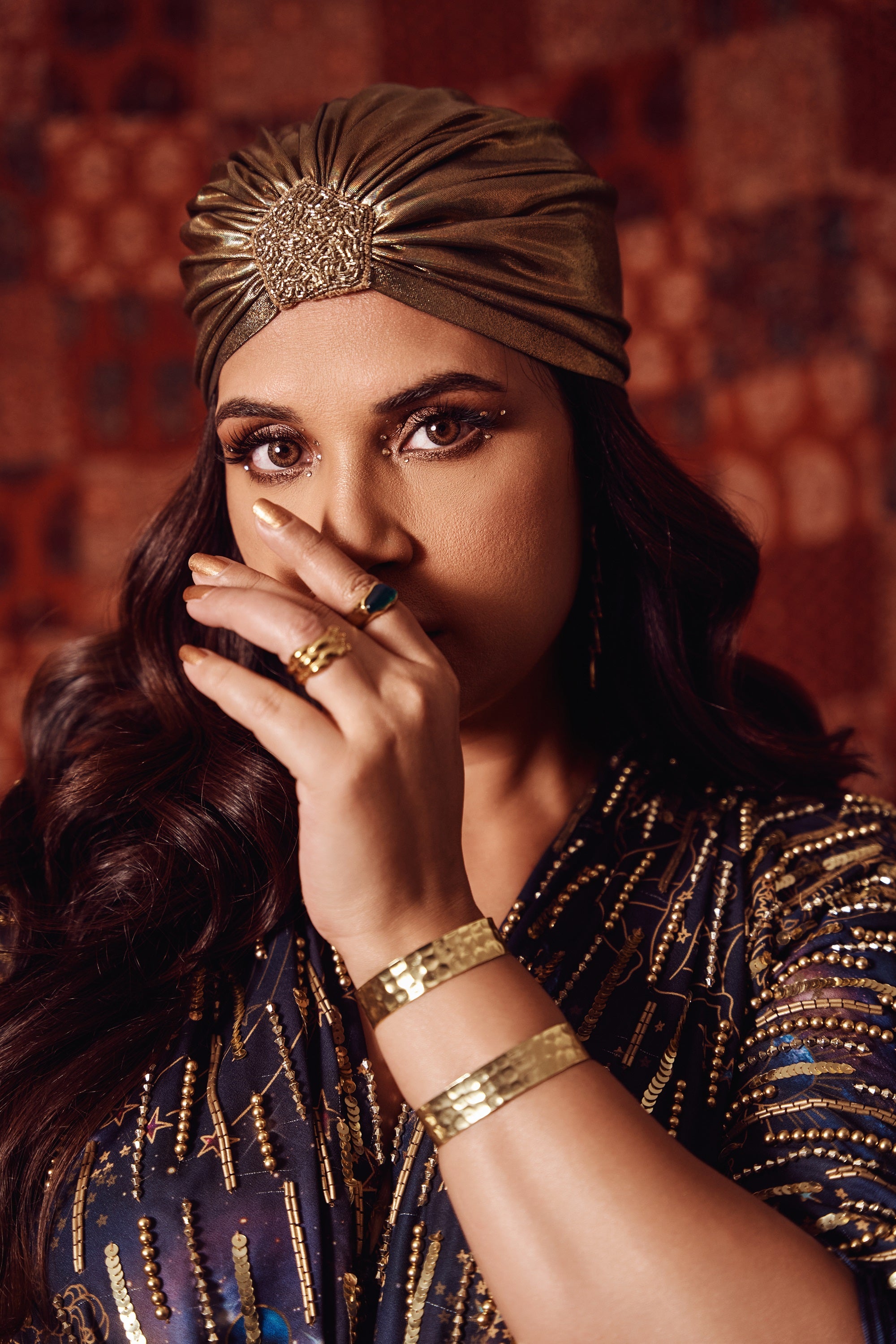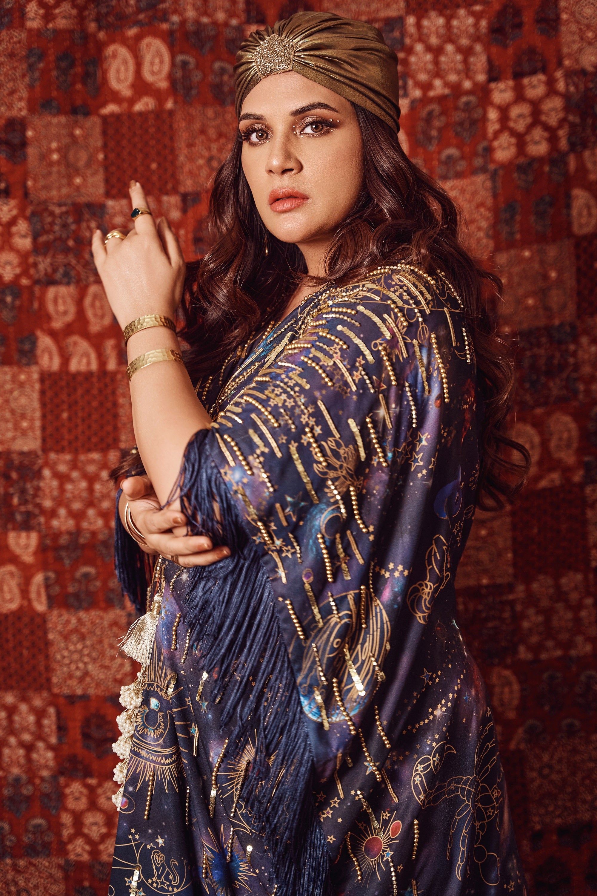 THE STARBURST CONSTELLATION PRINT KAFTAN GOWN COMES WITH A BEJEWELLED BIB LIKE OVERLAPPING YOKE COMPLETELY HAND EMBELLISHED WITH ENCRUSTED CLAY HUED CRYSTALS AND GOLDEN AND PURPLE METALLIC PEARL S FINISHED OFF WITH DELICATE DANGLING GOLD PEARL TRIMS IN THE SLEEVES THE GATHERS AND PLEATS ON THE WAIST MAKE THIS SILHOUTE UNIQUE